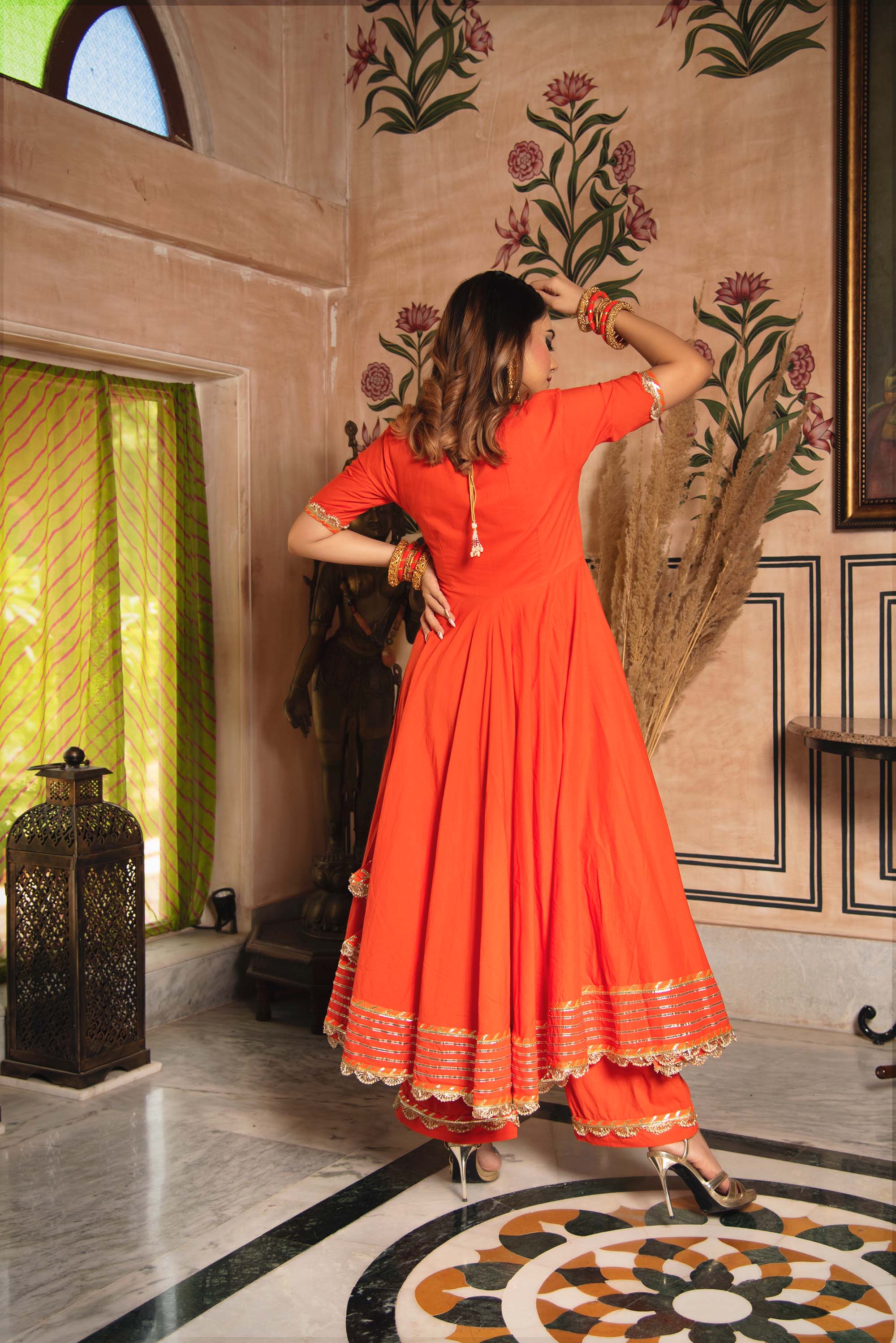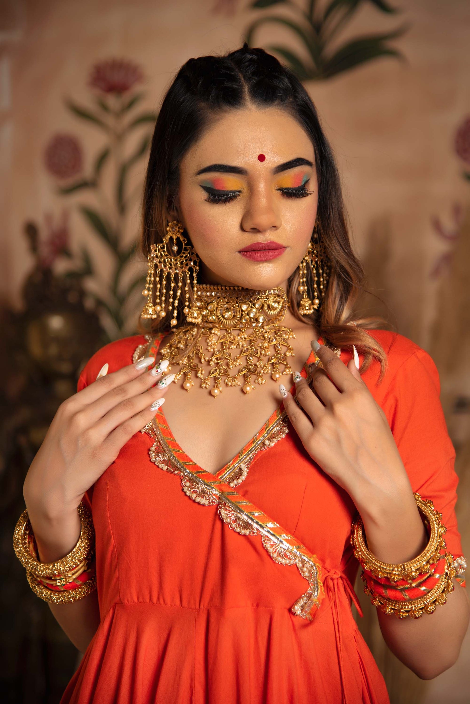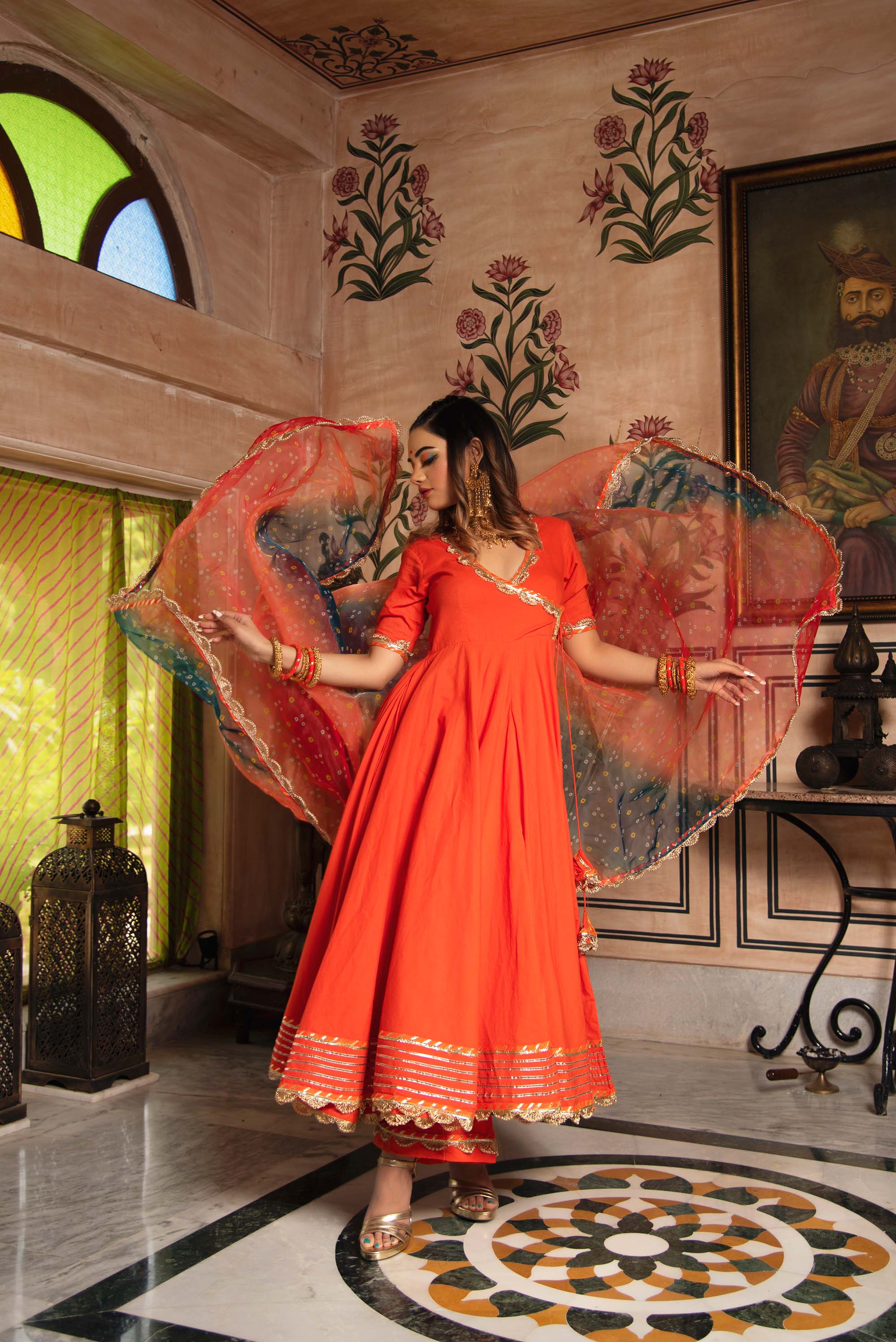 A fiery orange Angrakha suit set with a Bandhej contrasting organza dupatta is all you need to slay this festive season. With trendy patterns and comfortable fabric, this Bandhani Angrakha Kurta offers a beautiful fit! Pair it with matching earrings and wedges, and you are ready to slay every event you go to!