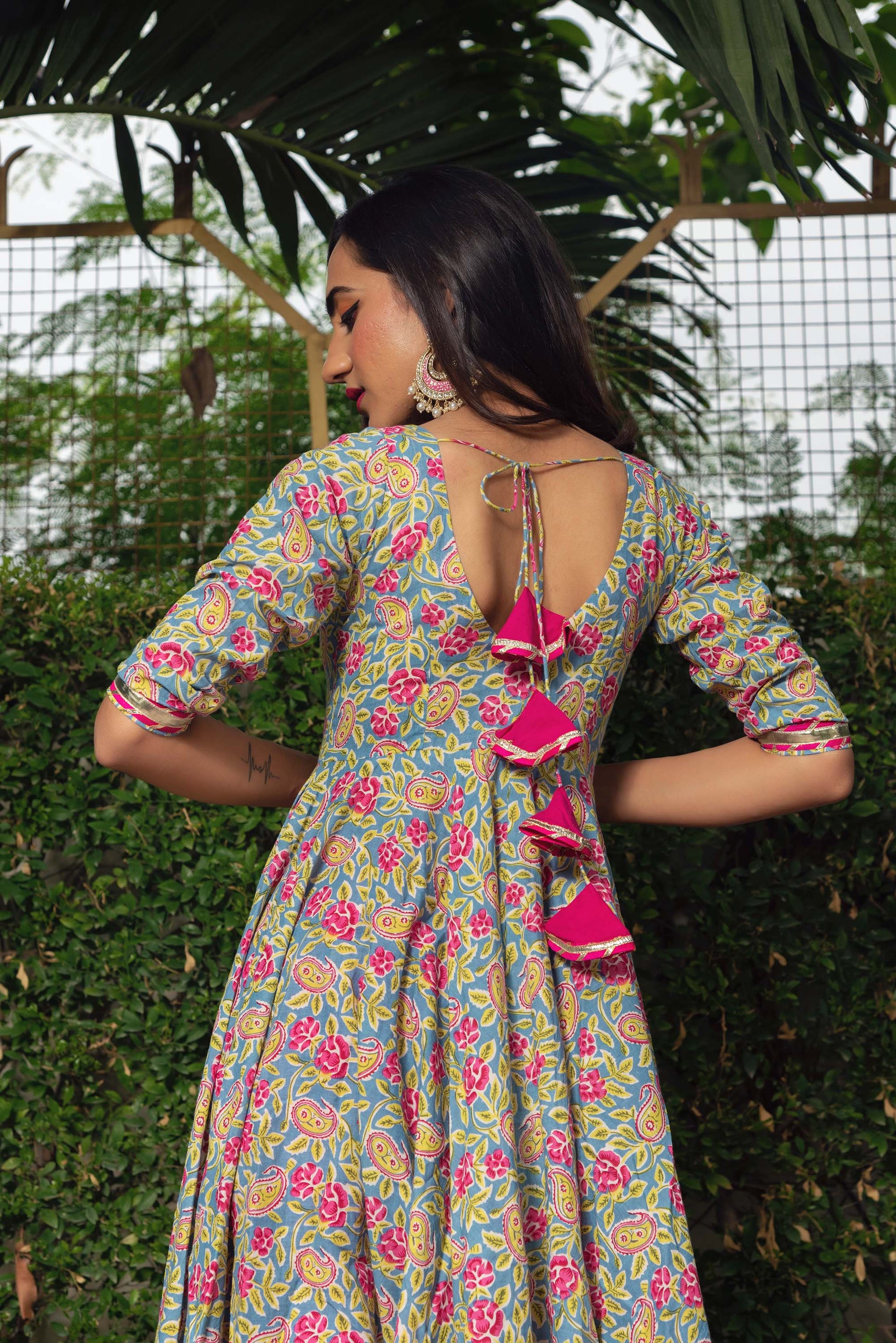 Jarokha Green Jaipuri Hand Block Cotton Anarkali