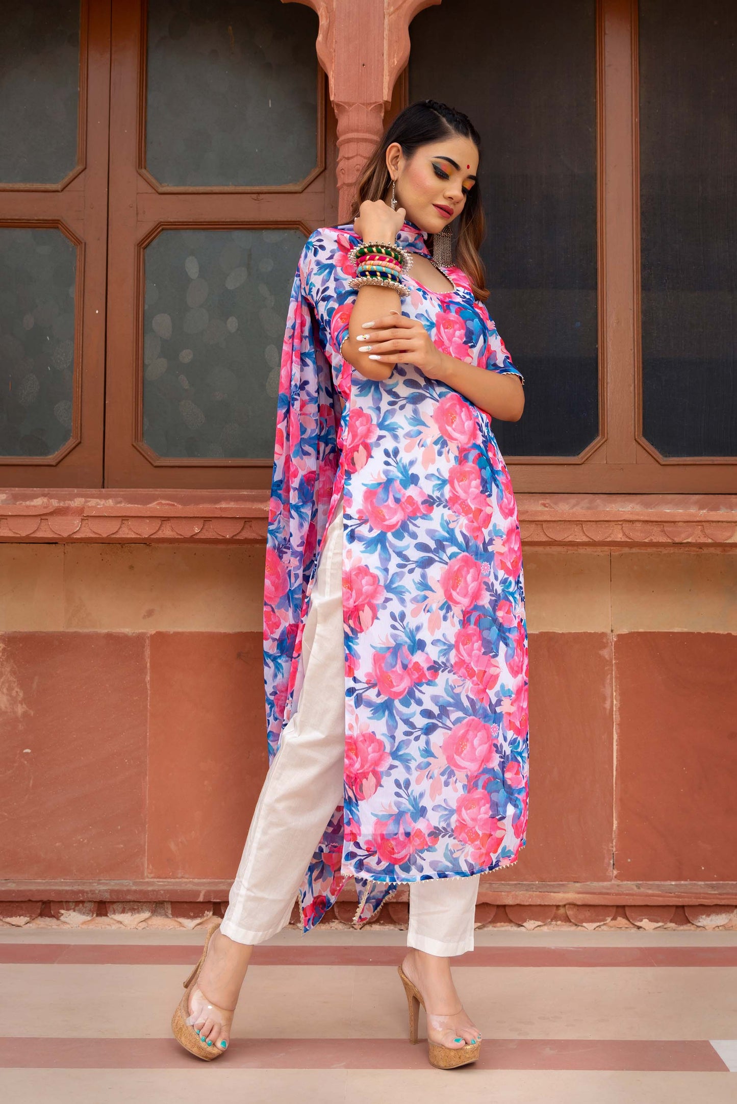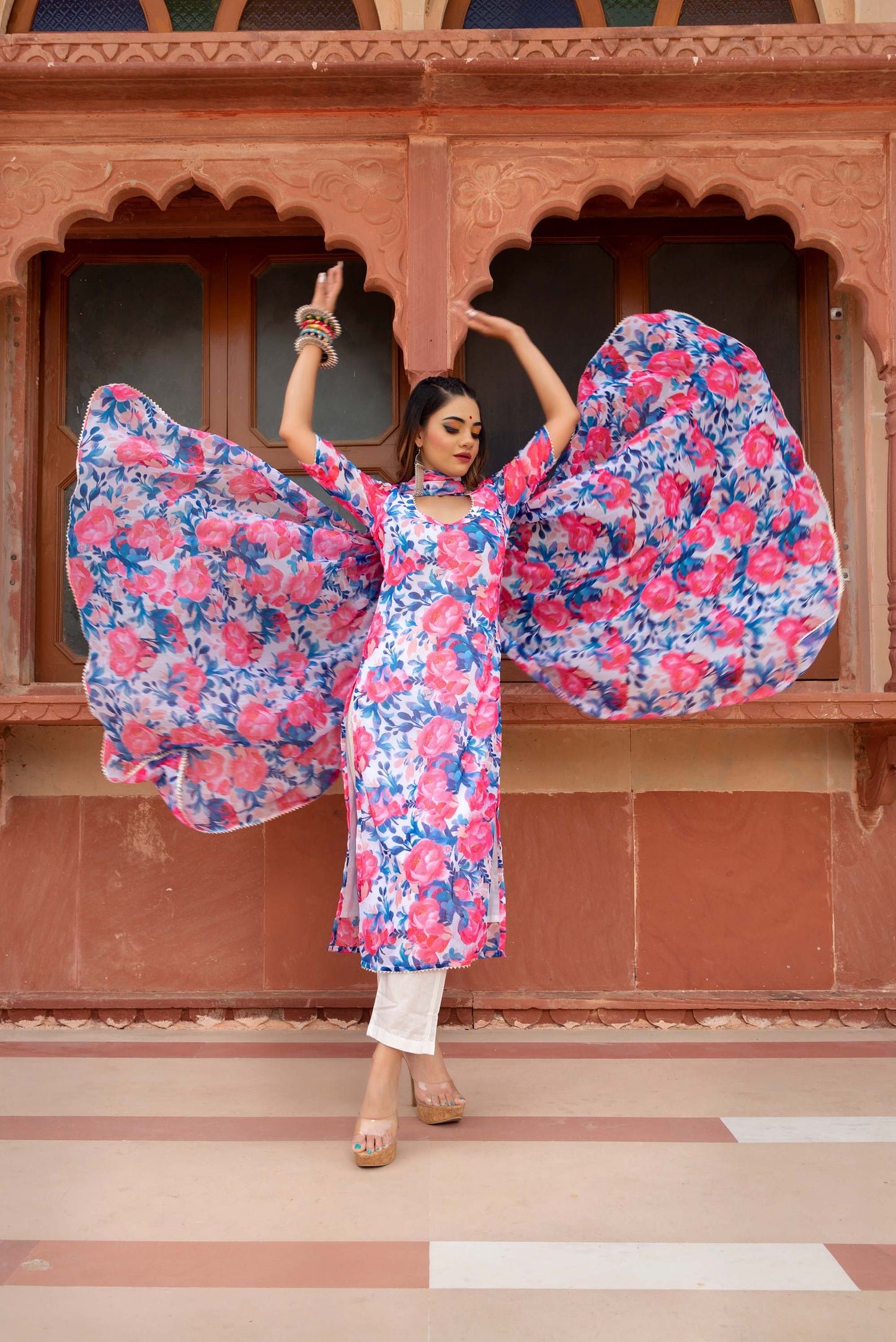Prepare to get overwhelmed with a swirl of compliments by dressing yourself in this beautiful Printed chiffon dupatta suit set. With a chiffon floral print dupatta and straight silhouette, this set is a must-have for after-office parties. Pick from our much-appreciated chiffon suits collection to add a splash of color to your traditional wardrobe.