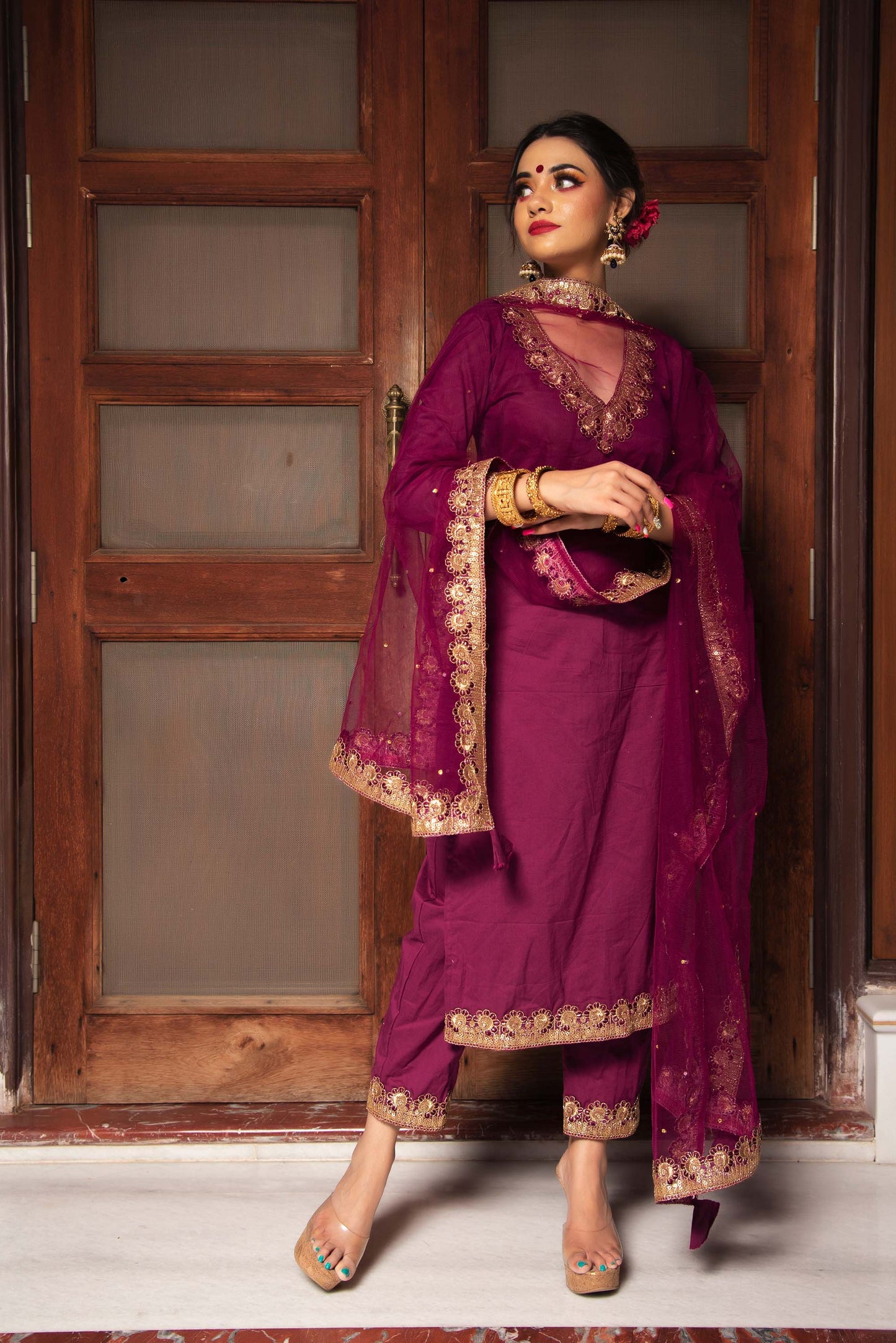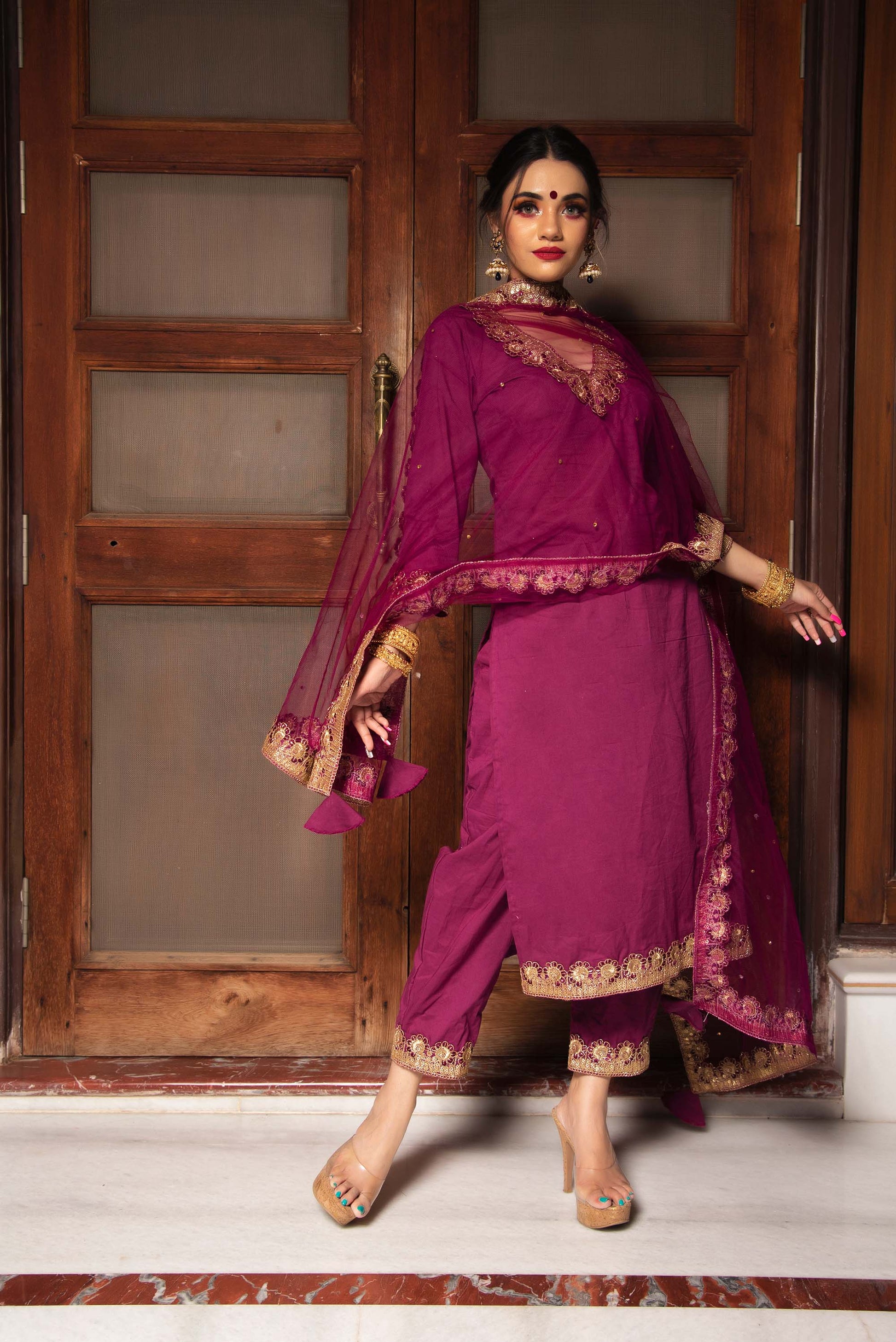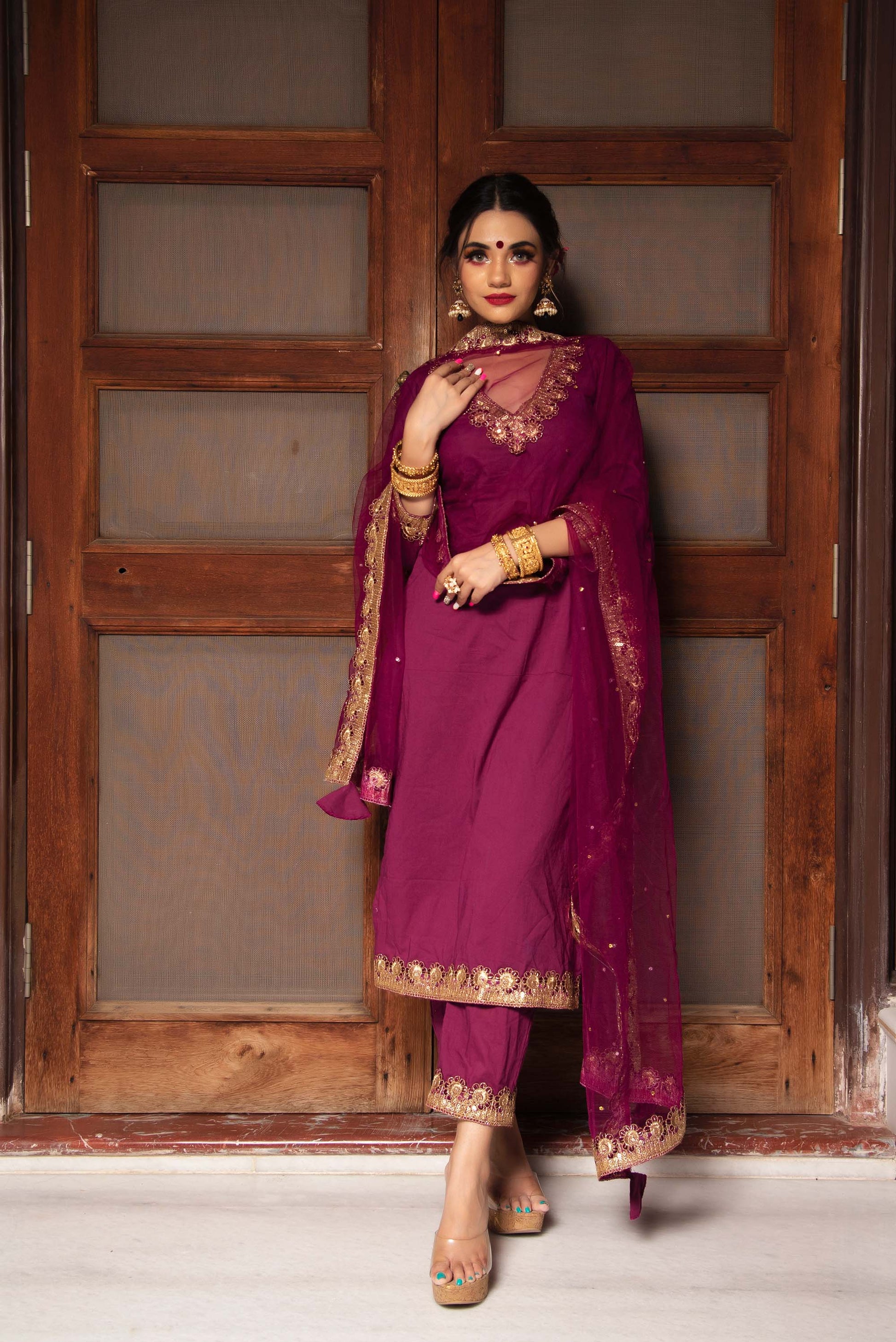 Jarokha Burgundy Plum Cotton Straight Kurta set