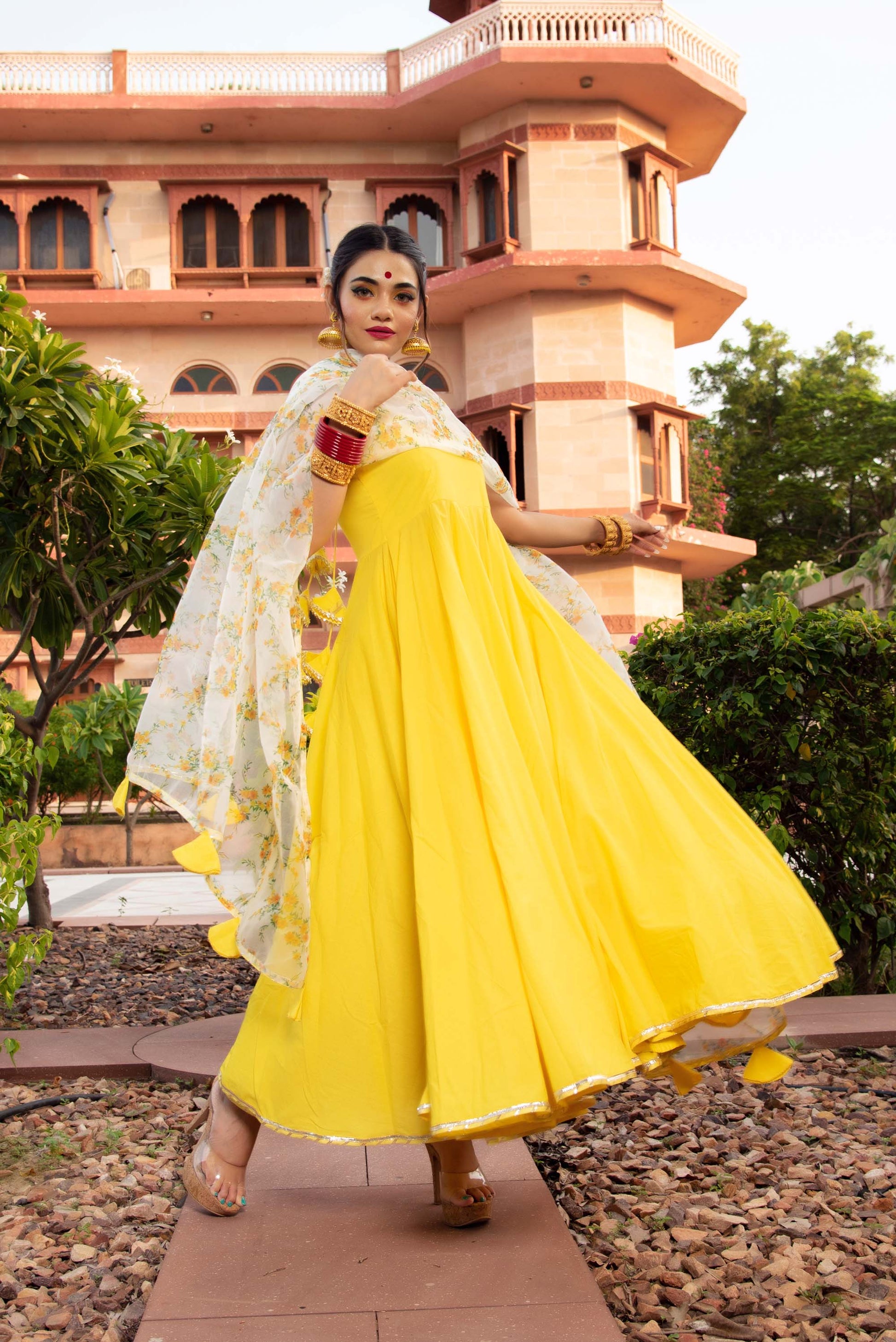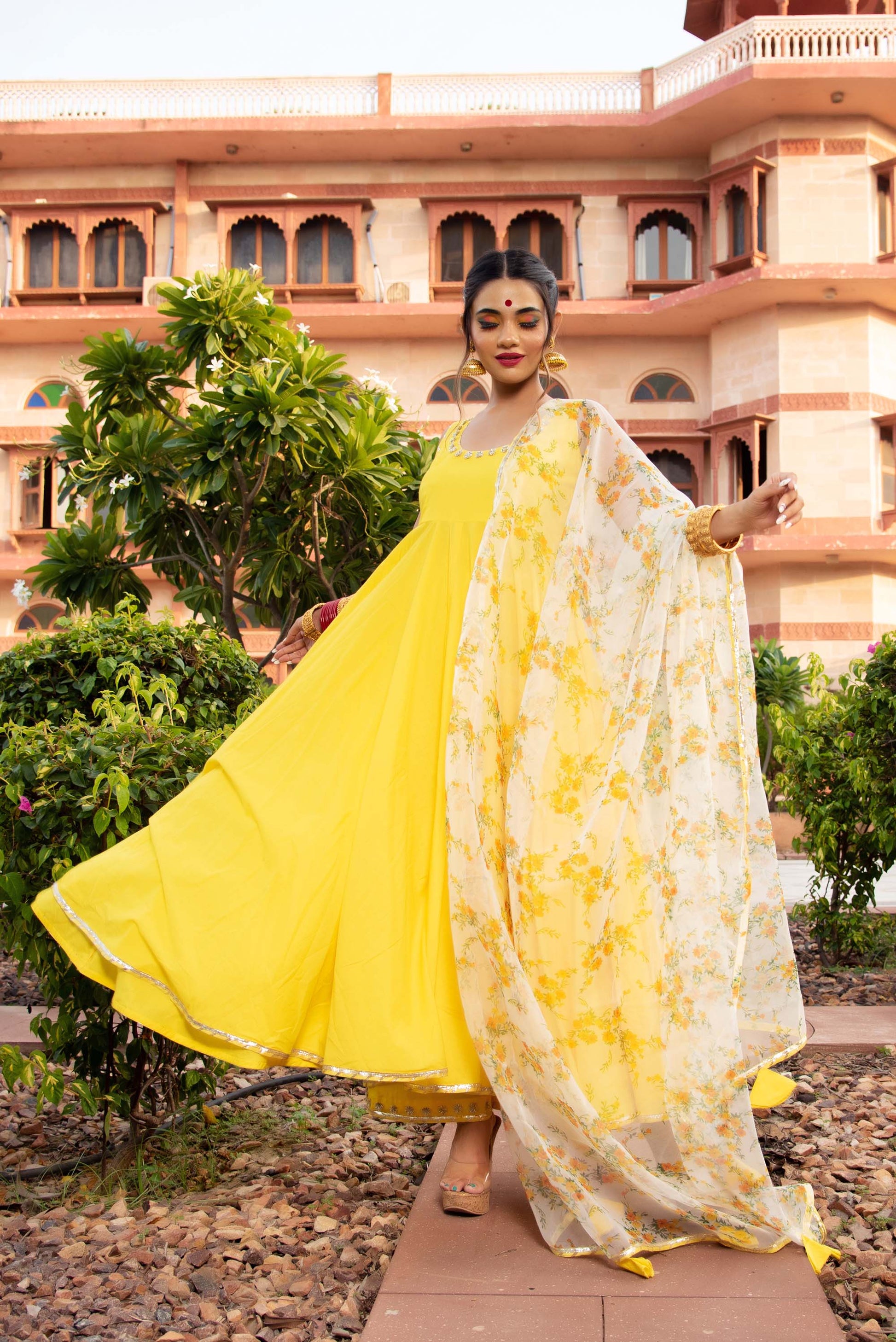 Jarokha Yellow Berry Cotton Anarkali Set