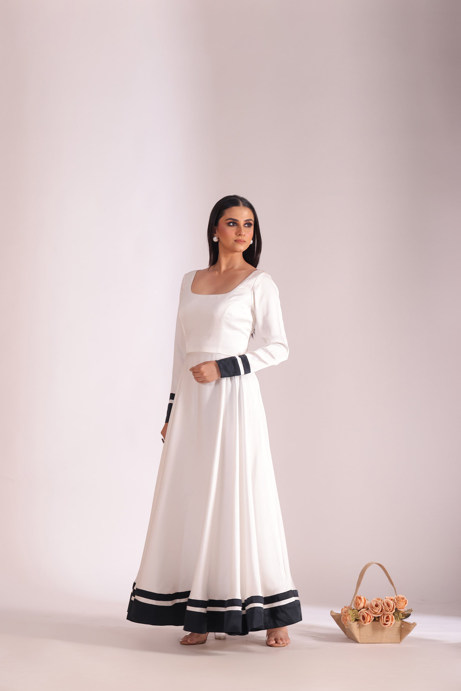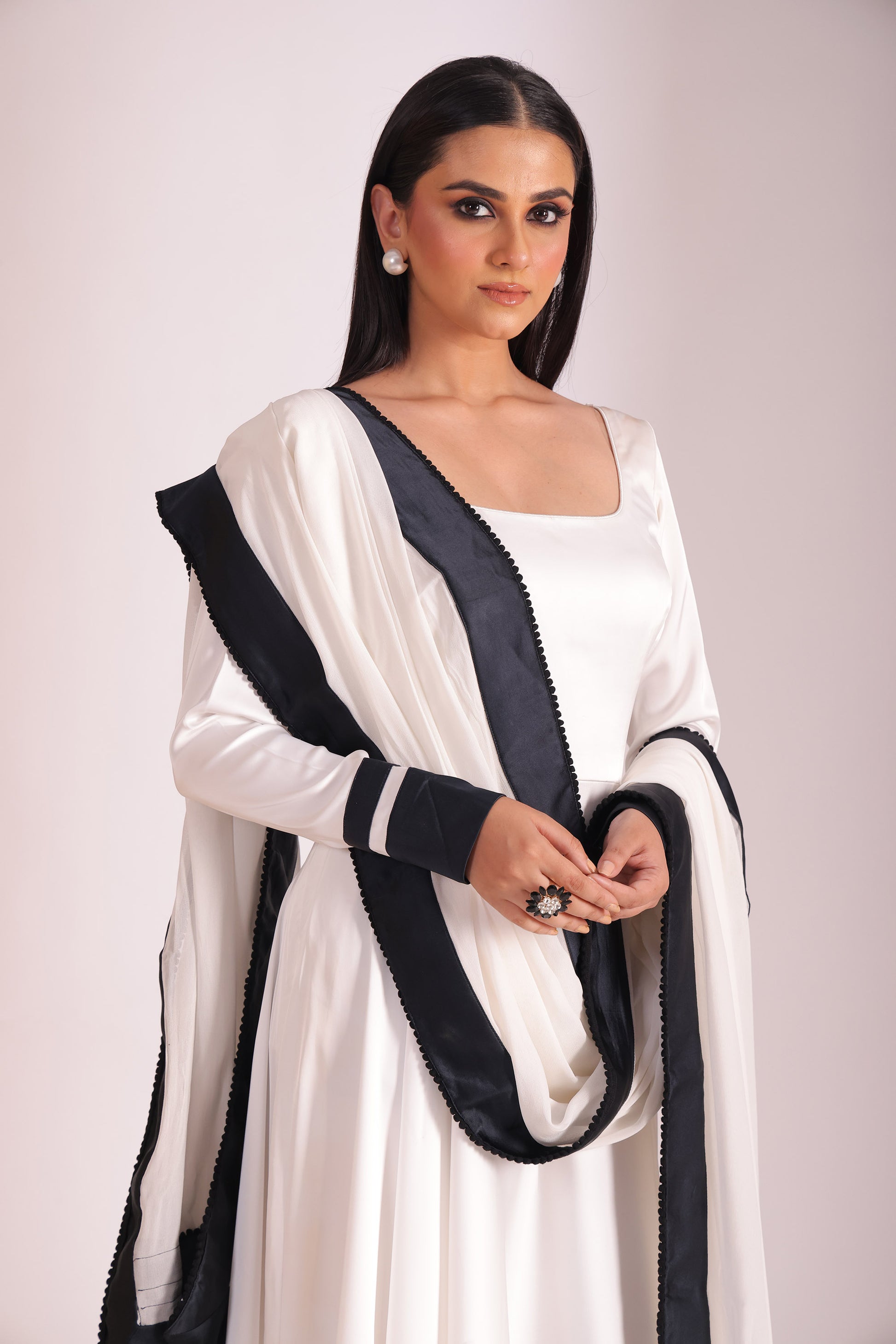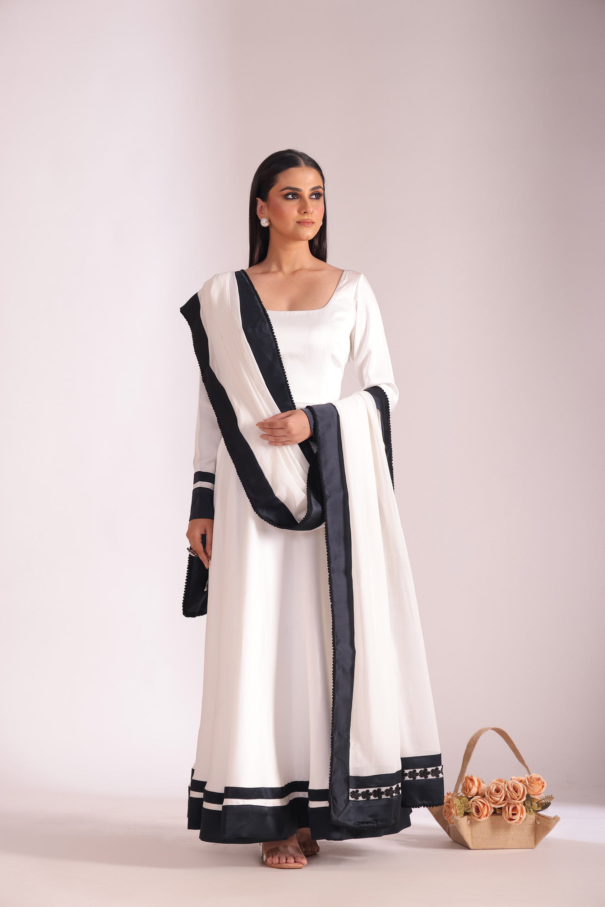 This three piece set includes Anarkali, Chooridar and dupatta White satin round neckline anarkali with black satin border in the hem and sleeves. White chooridar. White gerogette dupatta with black satin border with floral black lace finishings.