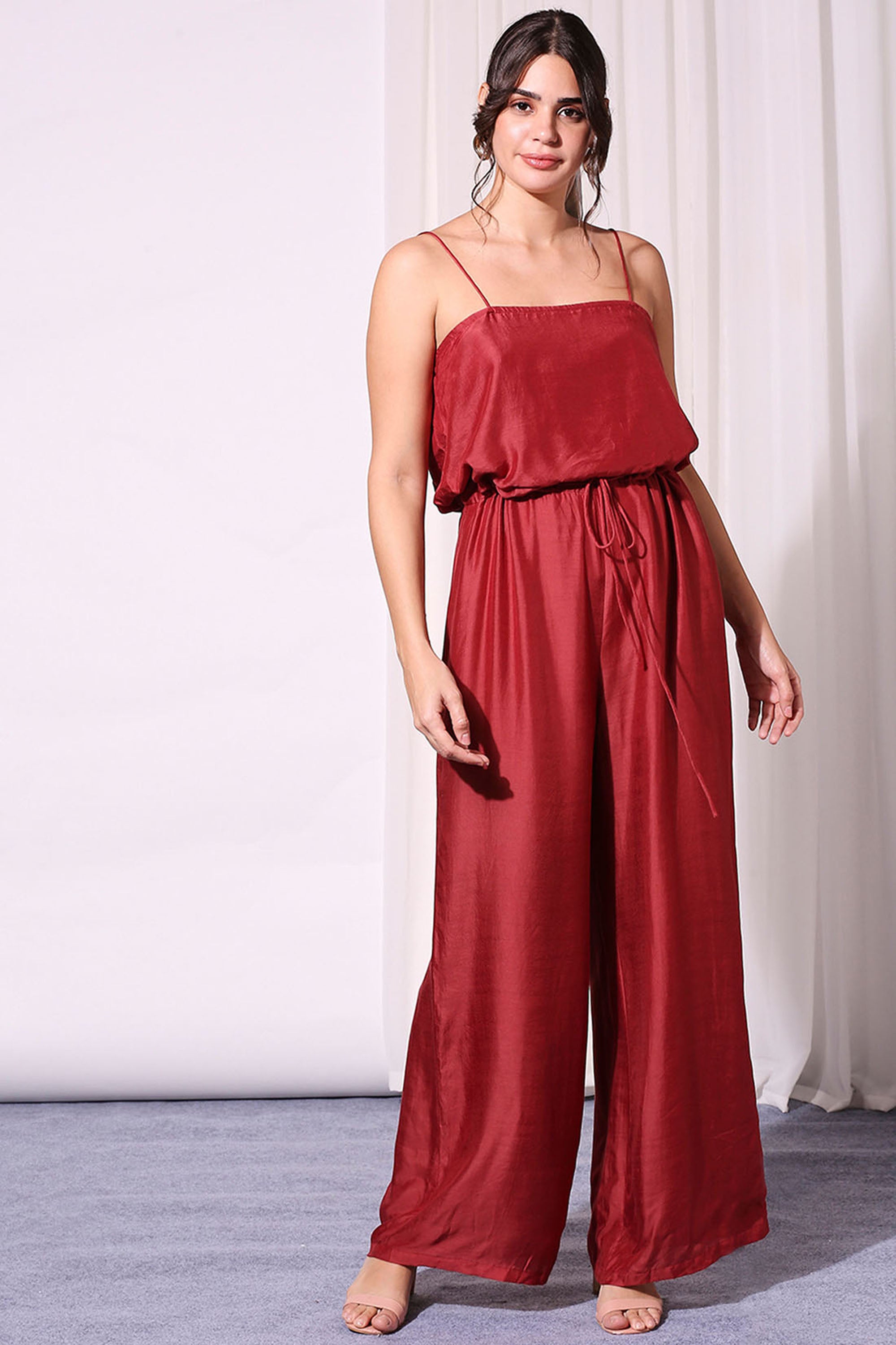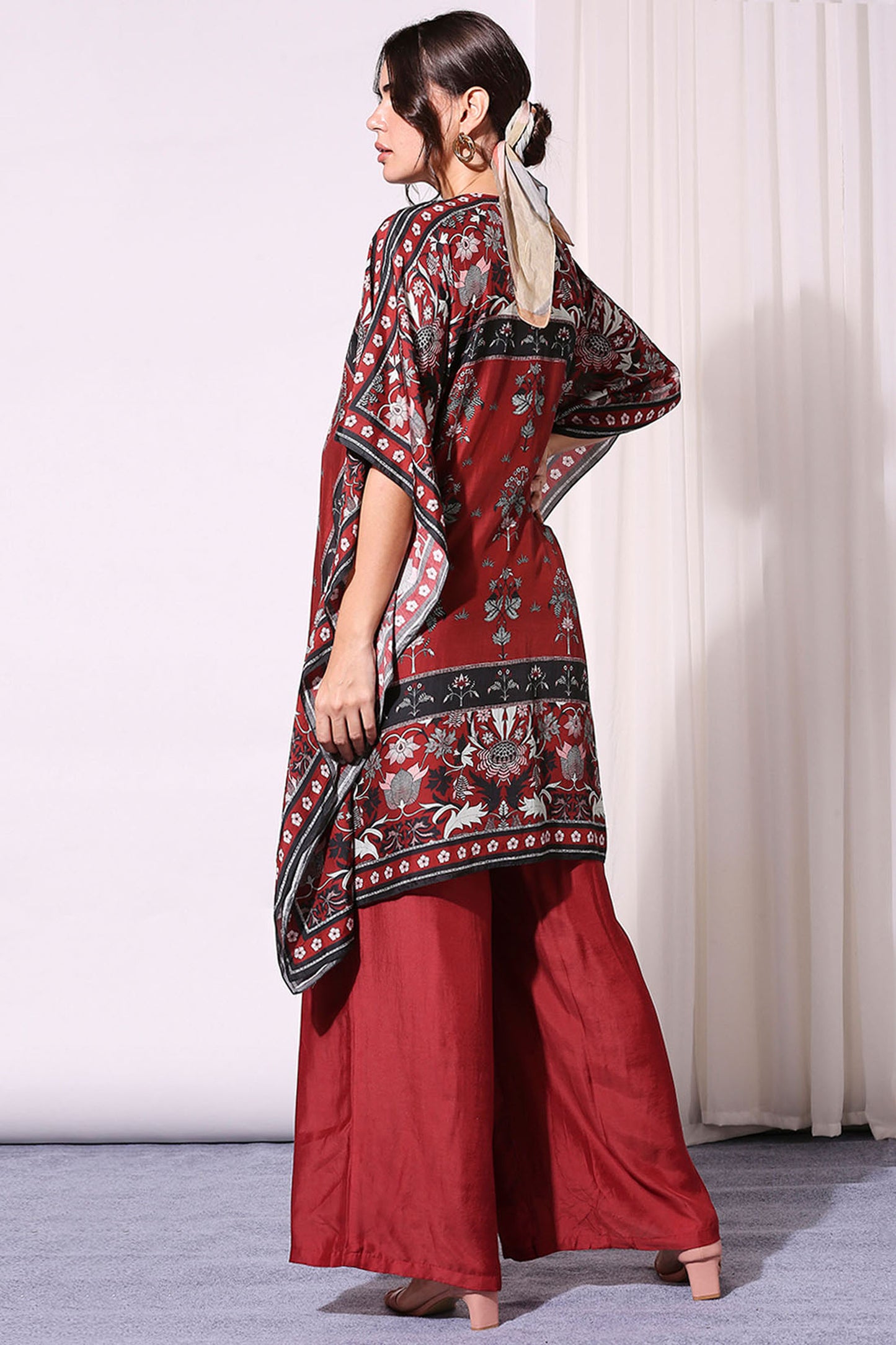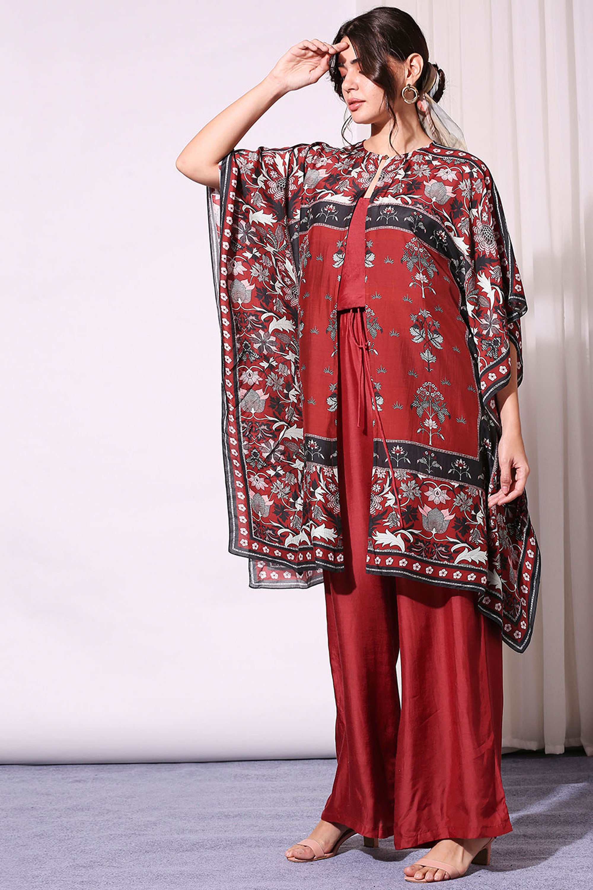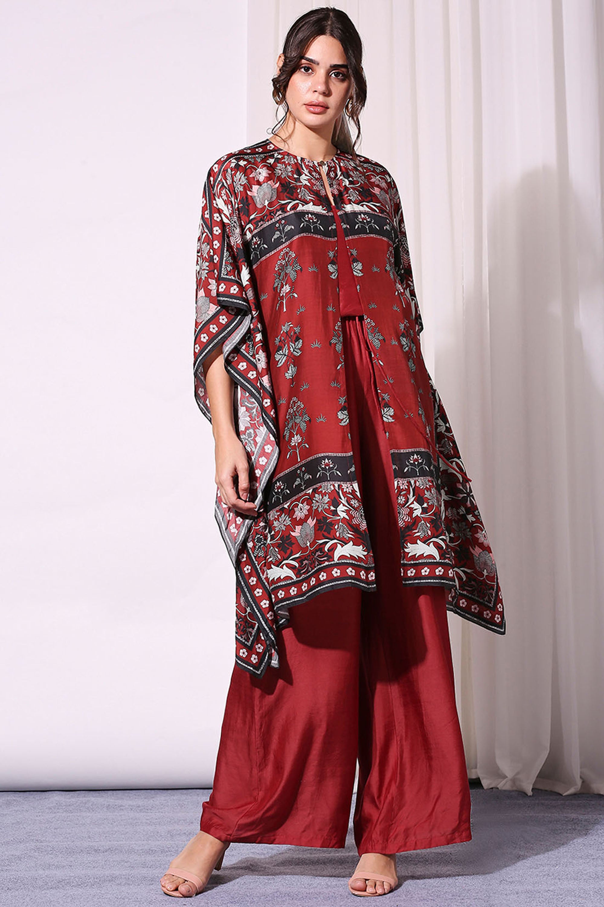 Merlot red Cotton Silk Jumpsuit Paired With Night Floral Kaftaan Jacket from SOUP by Sougat Paul. Indian Wedding Guest dresses USA