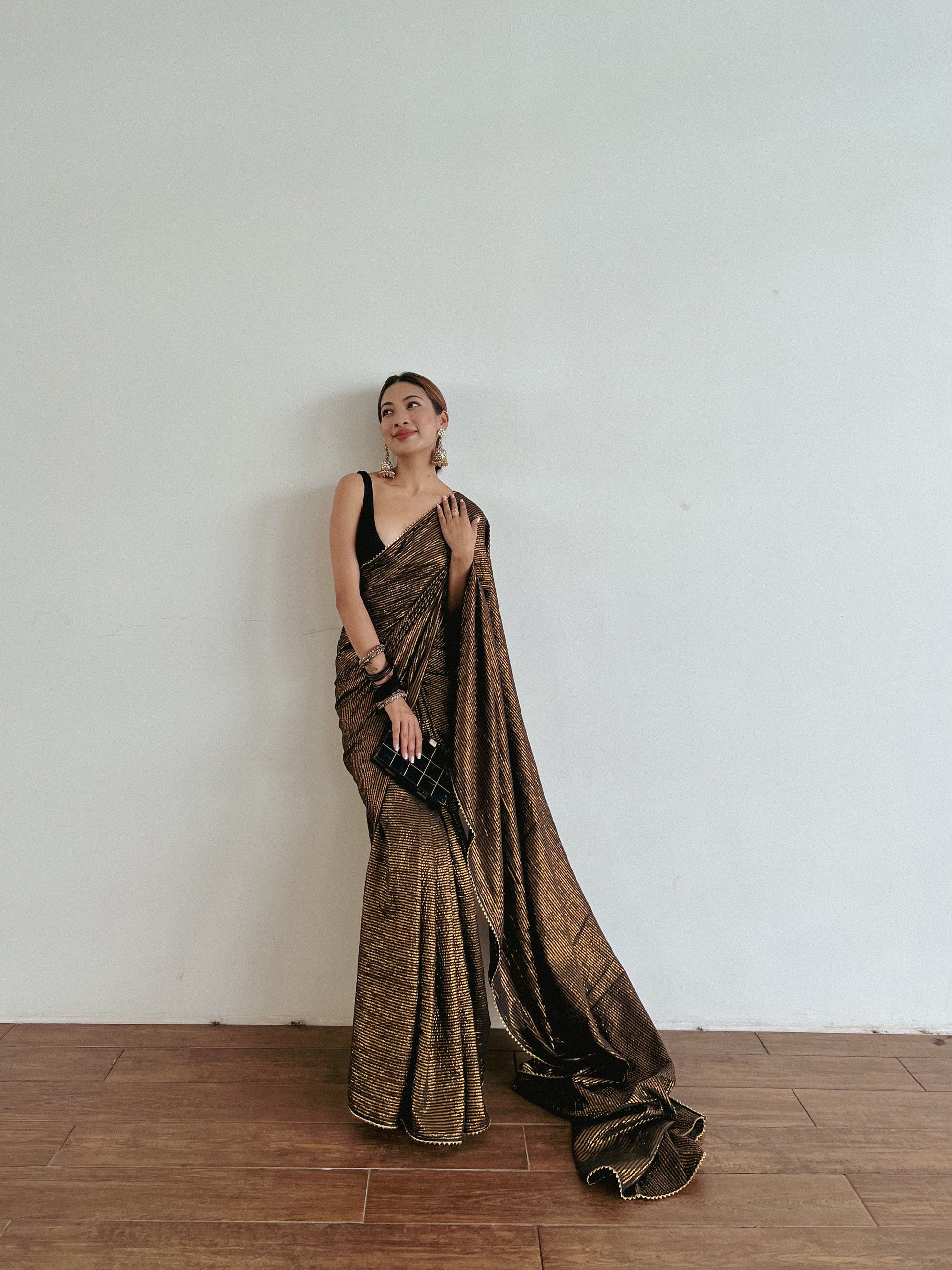 - Dhoti style drape: Opt for exquisite aesthetics by draping a linen Banarasi saree in dhoti style during a cocktail party.
