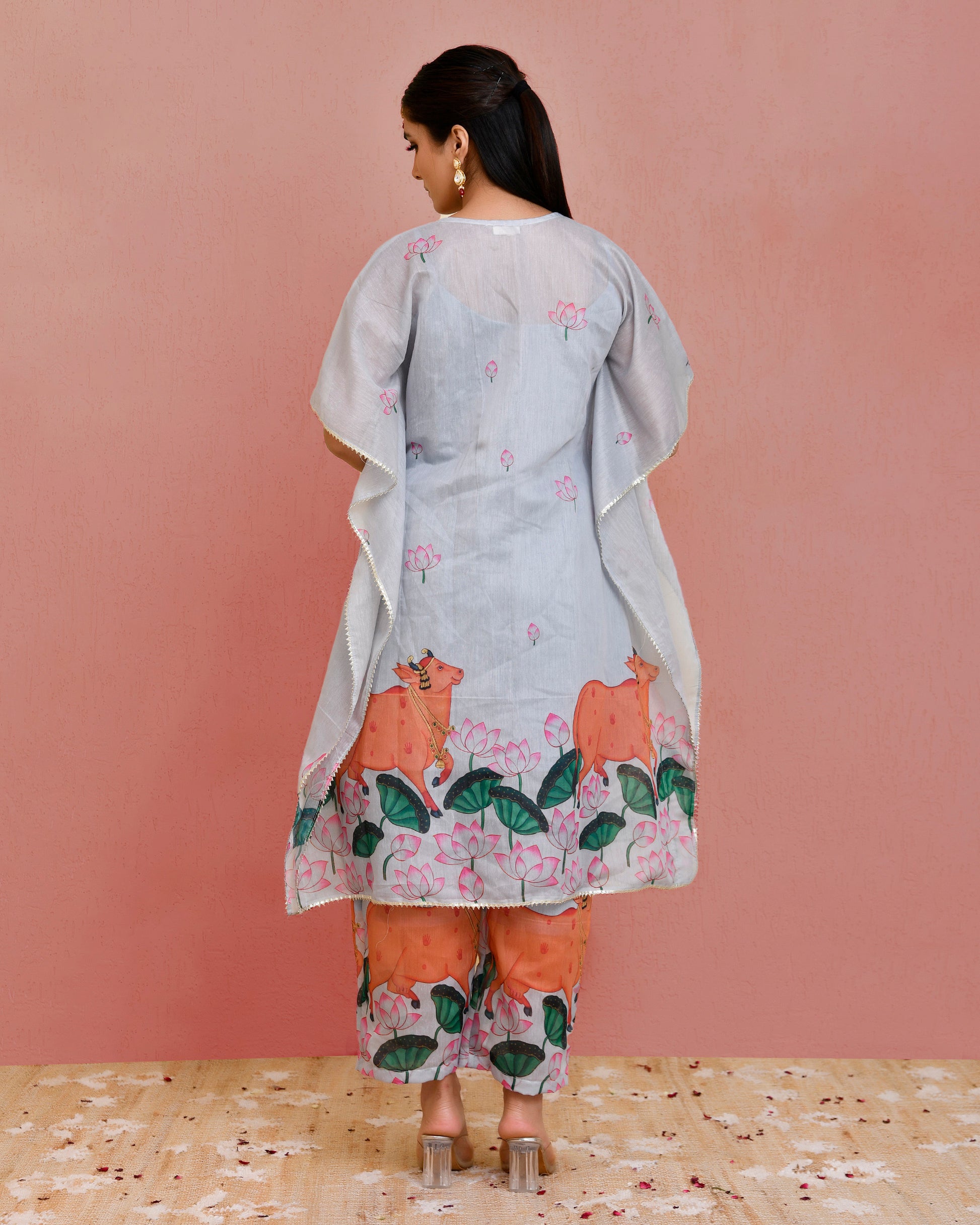 This is a grey pichwai printed, chanderi fabric,lace embellished kaftan and pant set.