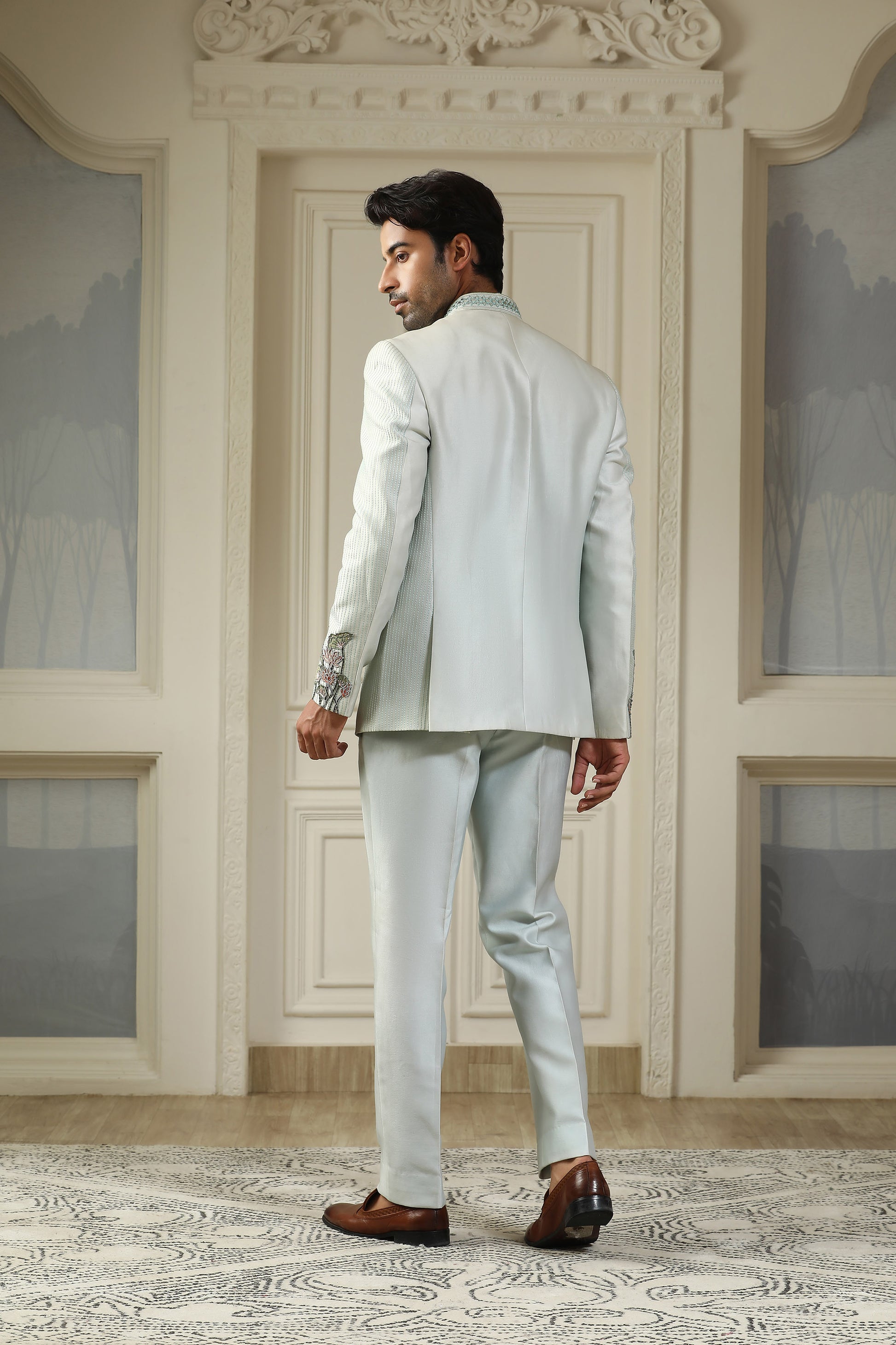 Kashti - Sea Blue Chanderi Silk Handpainted Sangeet Bandhgala Set