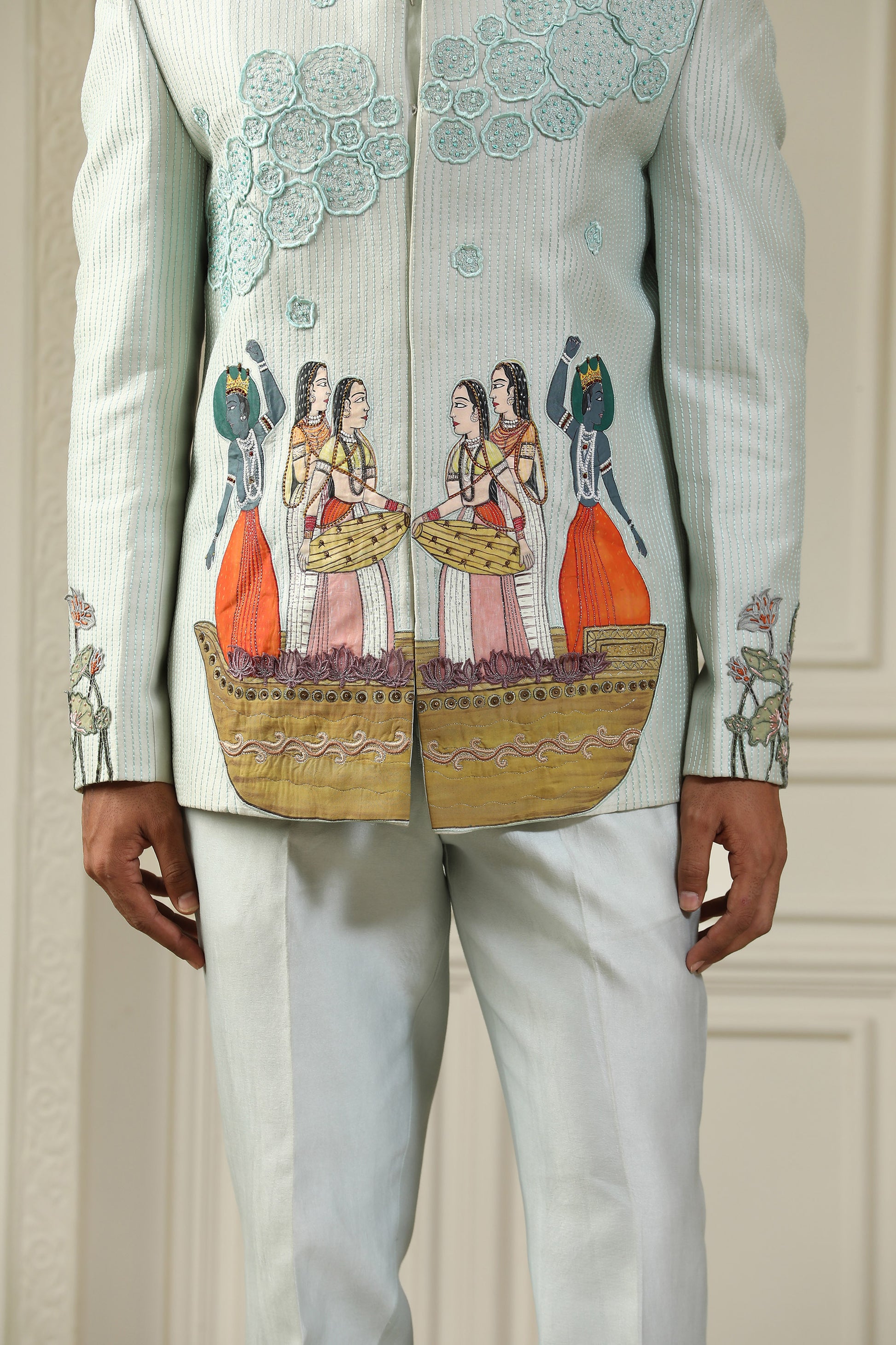 The Kashti bandhgala set is a joyful celebration of culture and craftsmanship. Made in raw silk, it features a hand-painted scene of people dancing on a boat—capturing the spirit of festivity and togetherness. Enhanced with multi-fabric appliqué, delicate pearl embroidery, and artistic net detailing on the sleeves, this piece is a vibrant tapestry of storytelling and fine technique.