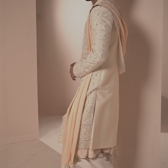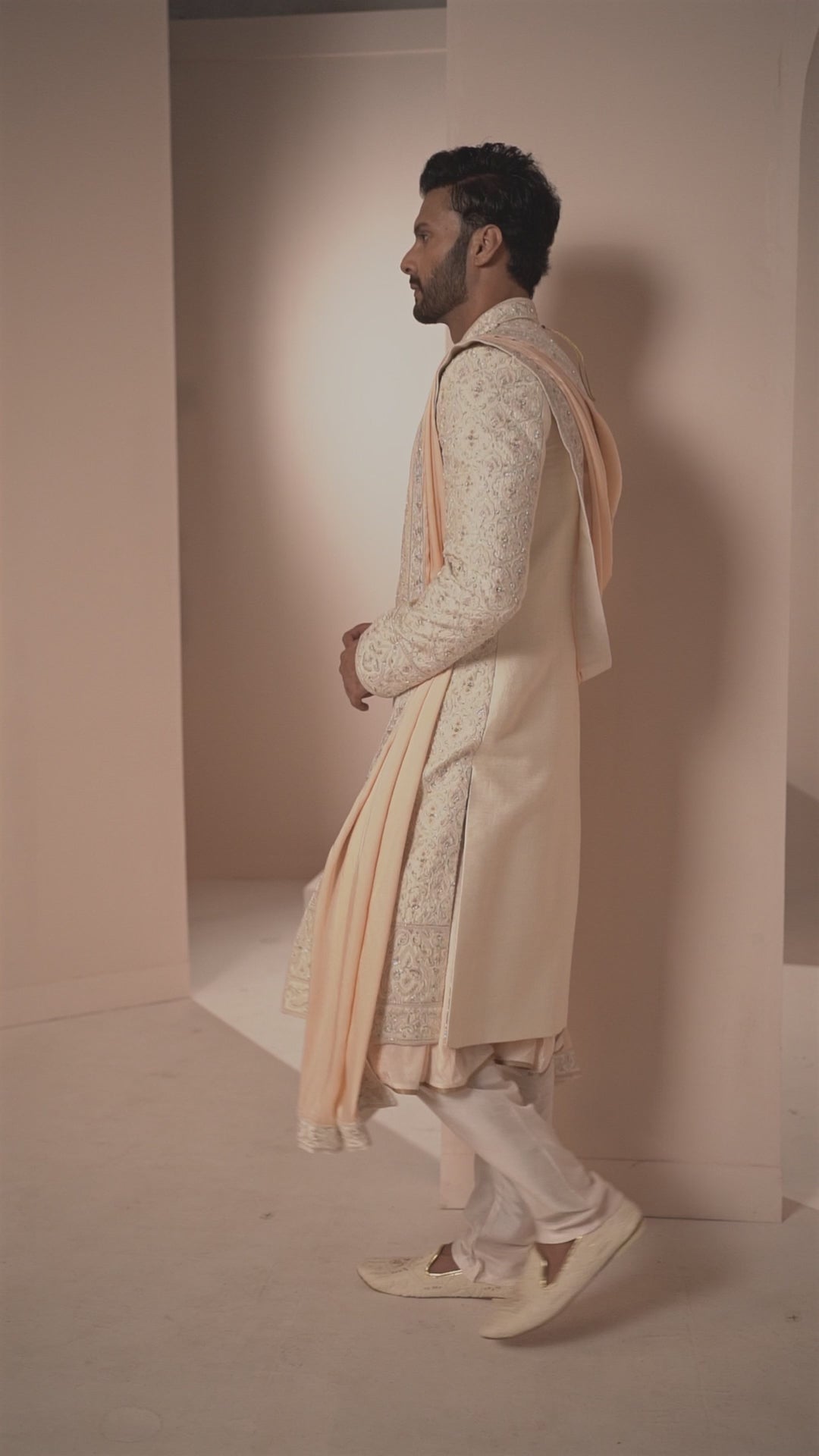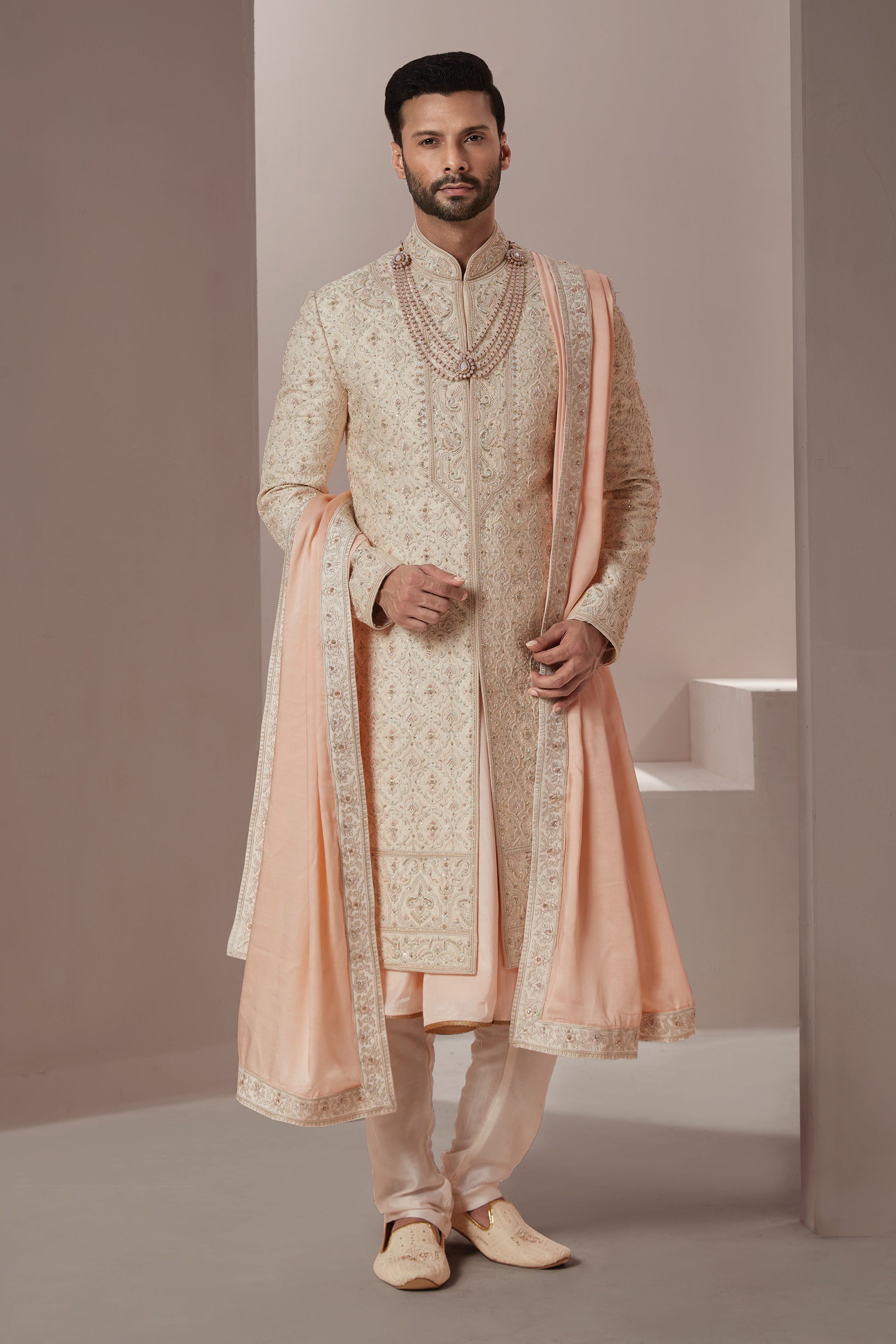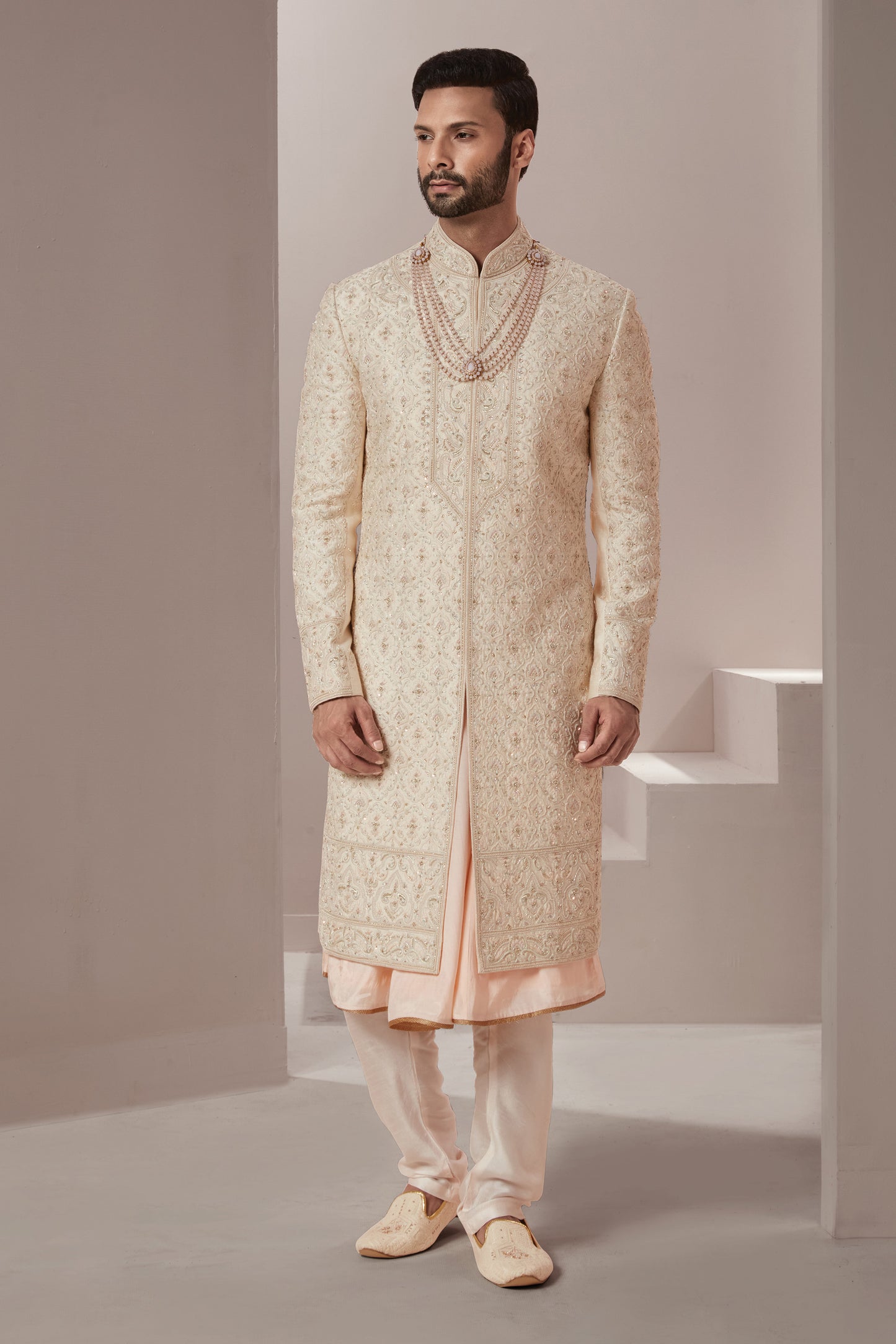 This light gold silk sherwani is embroidered in intricate Self colored thread with accents of pink and powder blue, resham work, kora work, forming overall floral symmetric motfis. It comes with a cotton silk light peach peshwa kurta and cream cotton silk churidar.