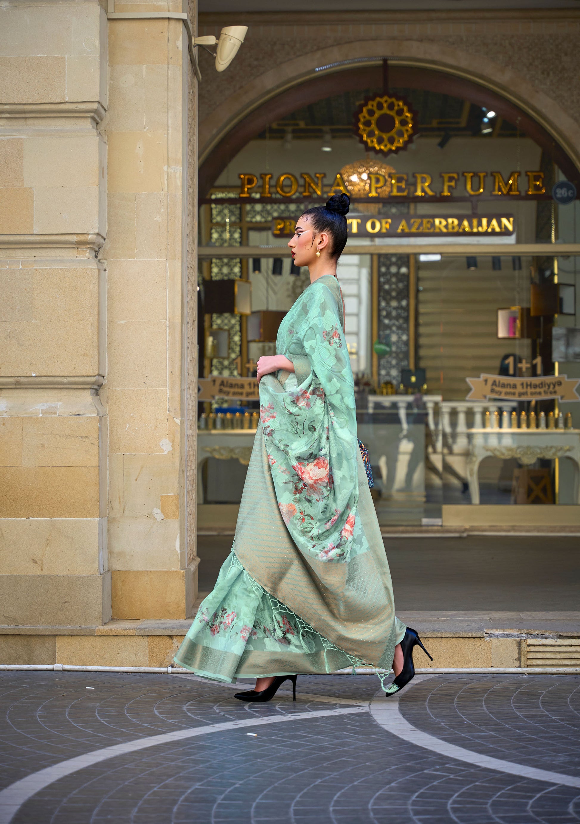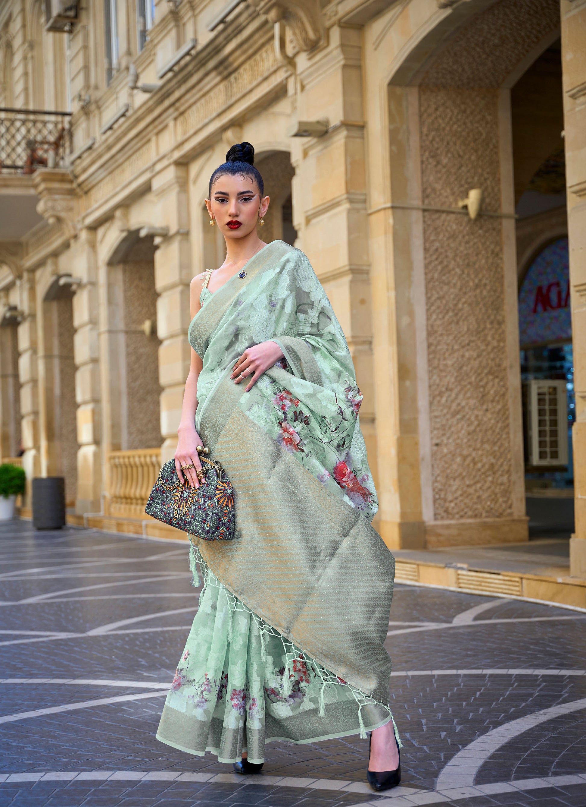 Light Green Floral Kinsel Printed Poly Handloom Saree