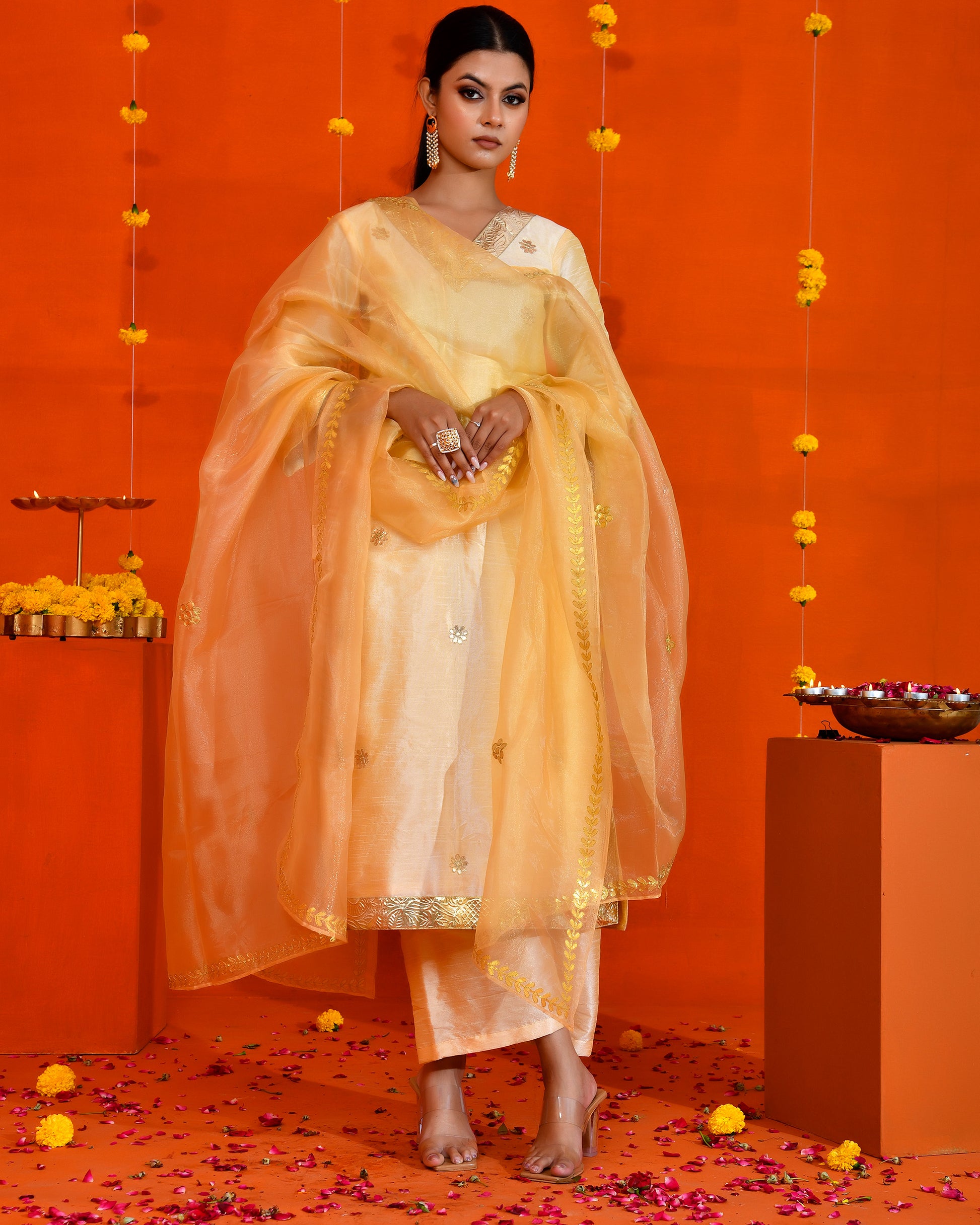 It is a light pastel yellow, gota patti work suit set. It includes raw silk kurta, pant and gota patti work organza dupatta.