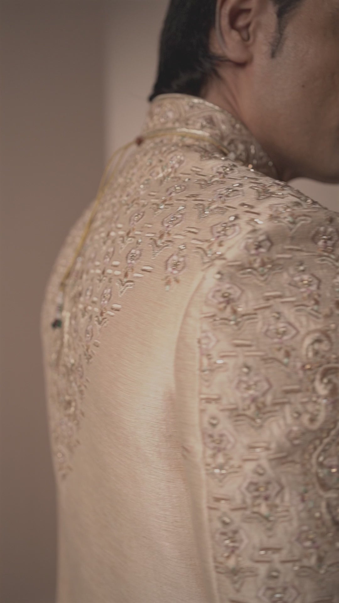 This light peach sherwani is intricately embroidered in Self colored resham work, with salli work, cut-dana and kora work forming repitative geometric and paisley motifs. It comes with a matching cotton silk peshwahi kurta and an off white cotton silk churidar.