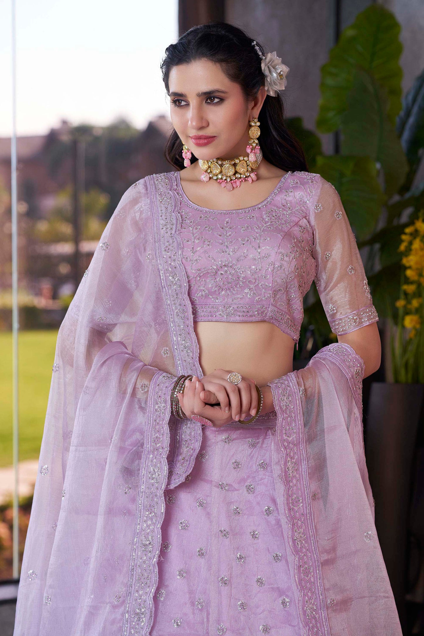 Are you seeking something exclusive? We've got what you require! This Lilac Zarkan and Sequence Embroidery Fendi Silk Bridesmaid Lehenga  with its gorgeous zarkan and sequence embroidery and  lilac color is the perfect option for those seeking to make an impact. You will certainly be the center of attention in this lehenga if you wear it to a wedding , an engagement party, or a sangeet. Pictured here is a bridesmaid wearing the Lilac Zarkan and Sequence Embroidery Fendi Silk Bridesmaid Lehenga , which you can purchase today!