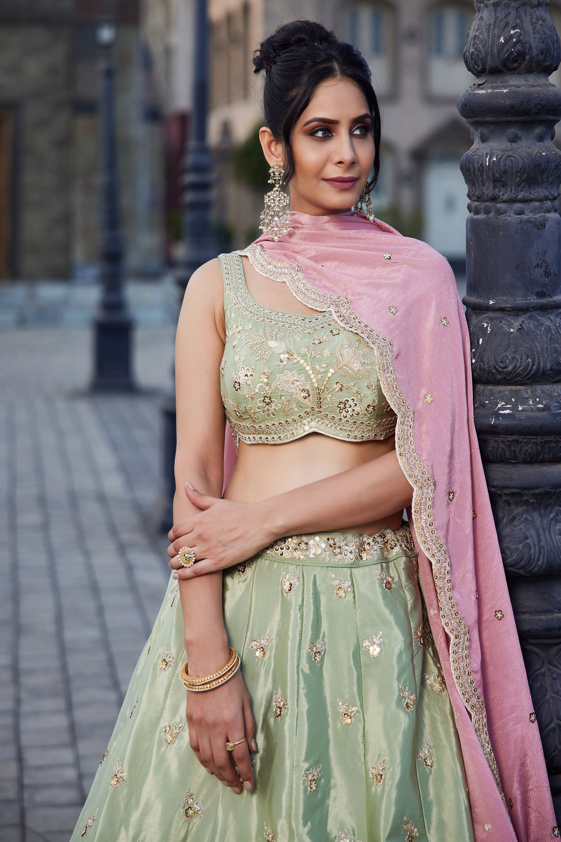 Lime green Satin Silk Sequins embroidery Lehenga choli & Dupatta