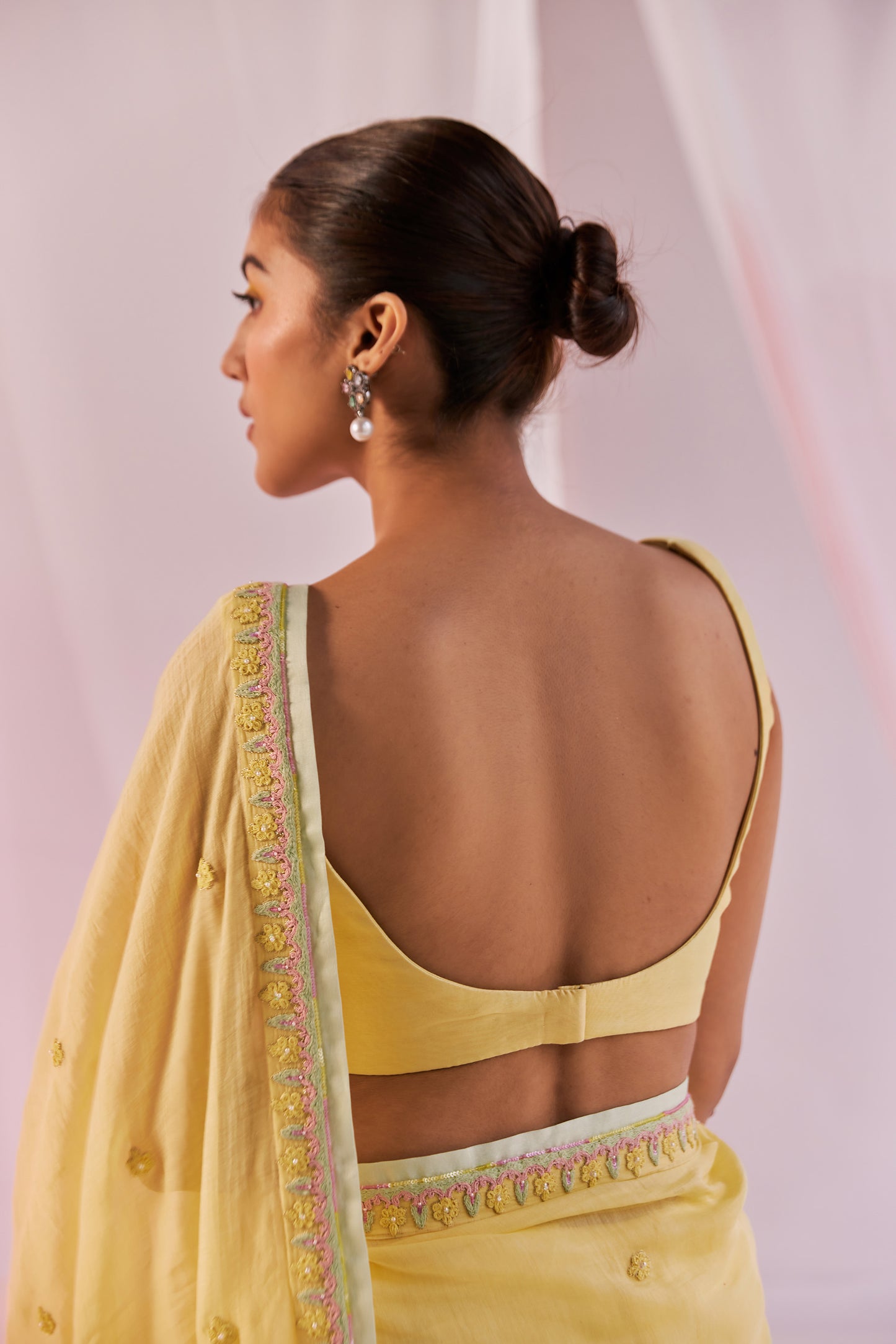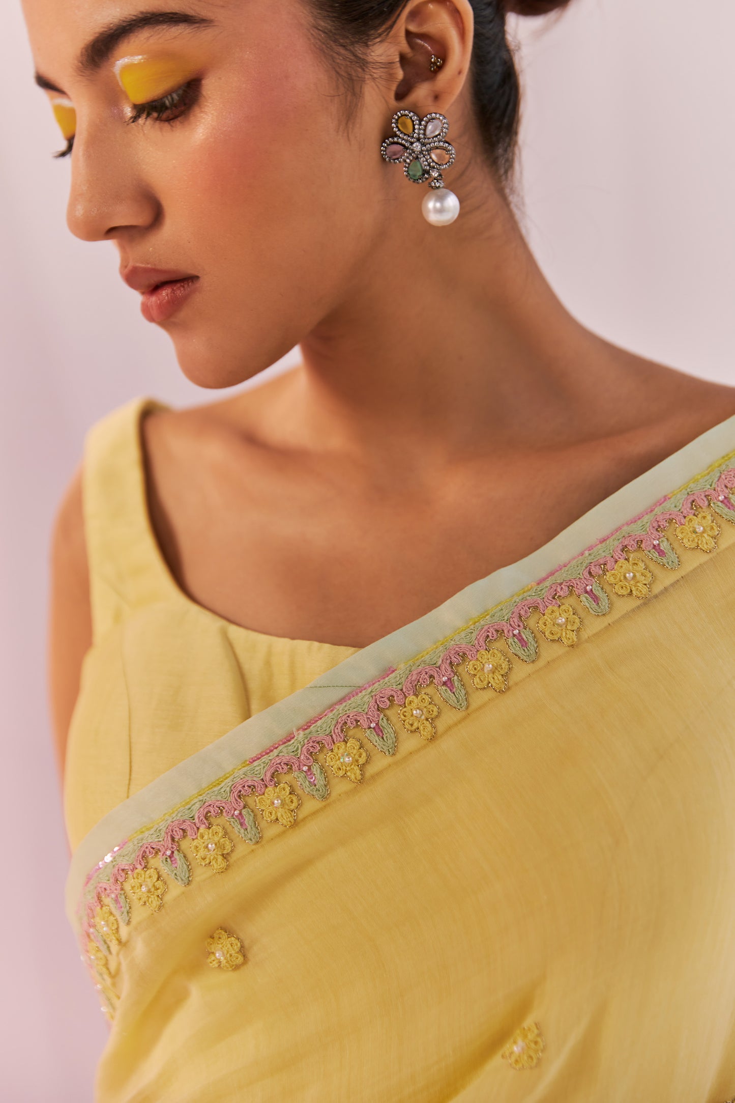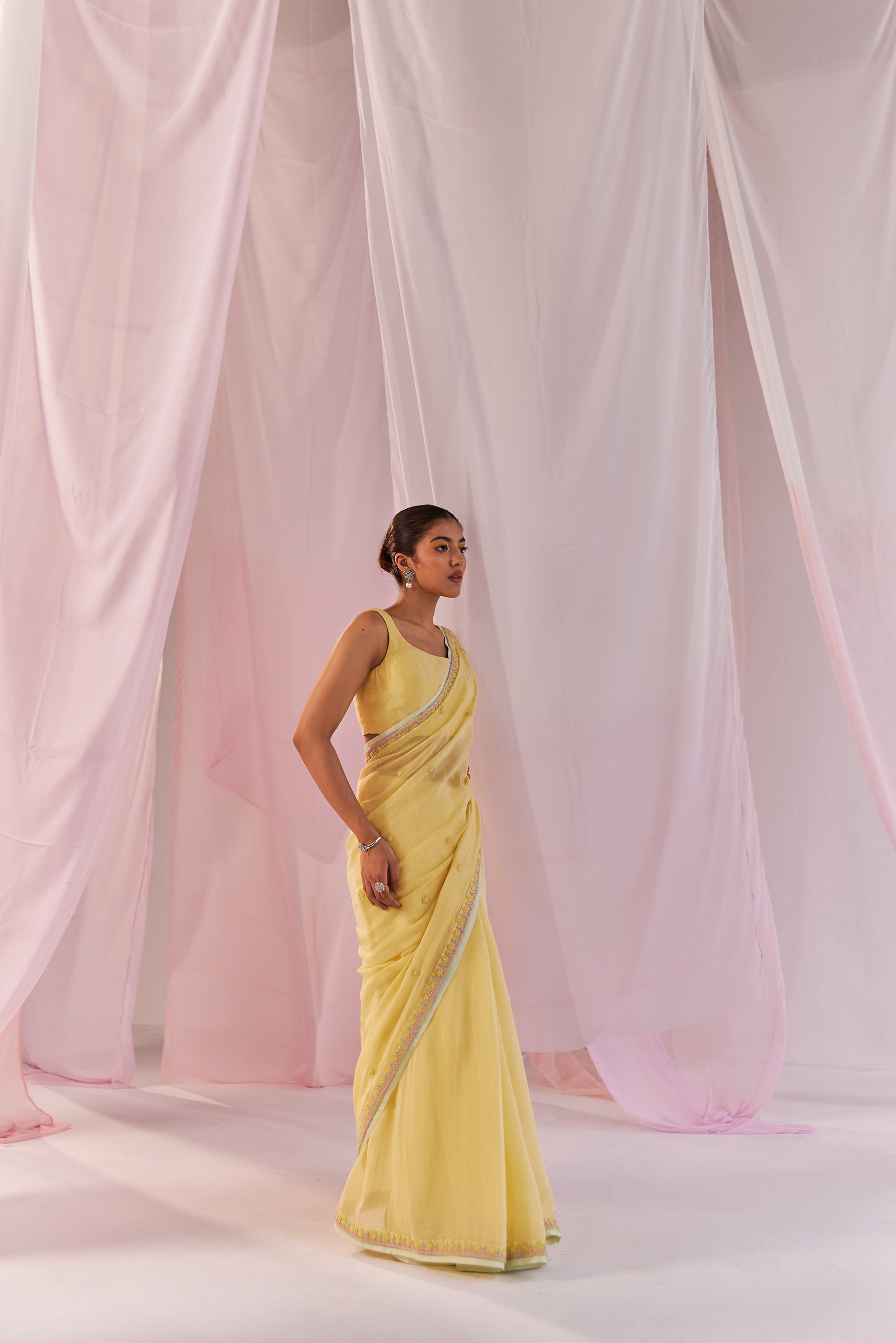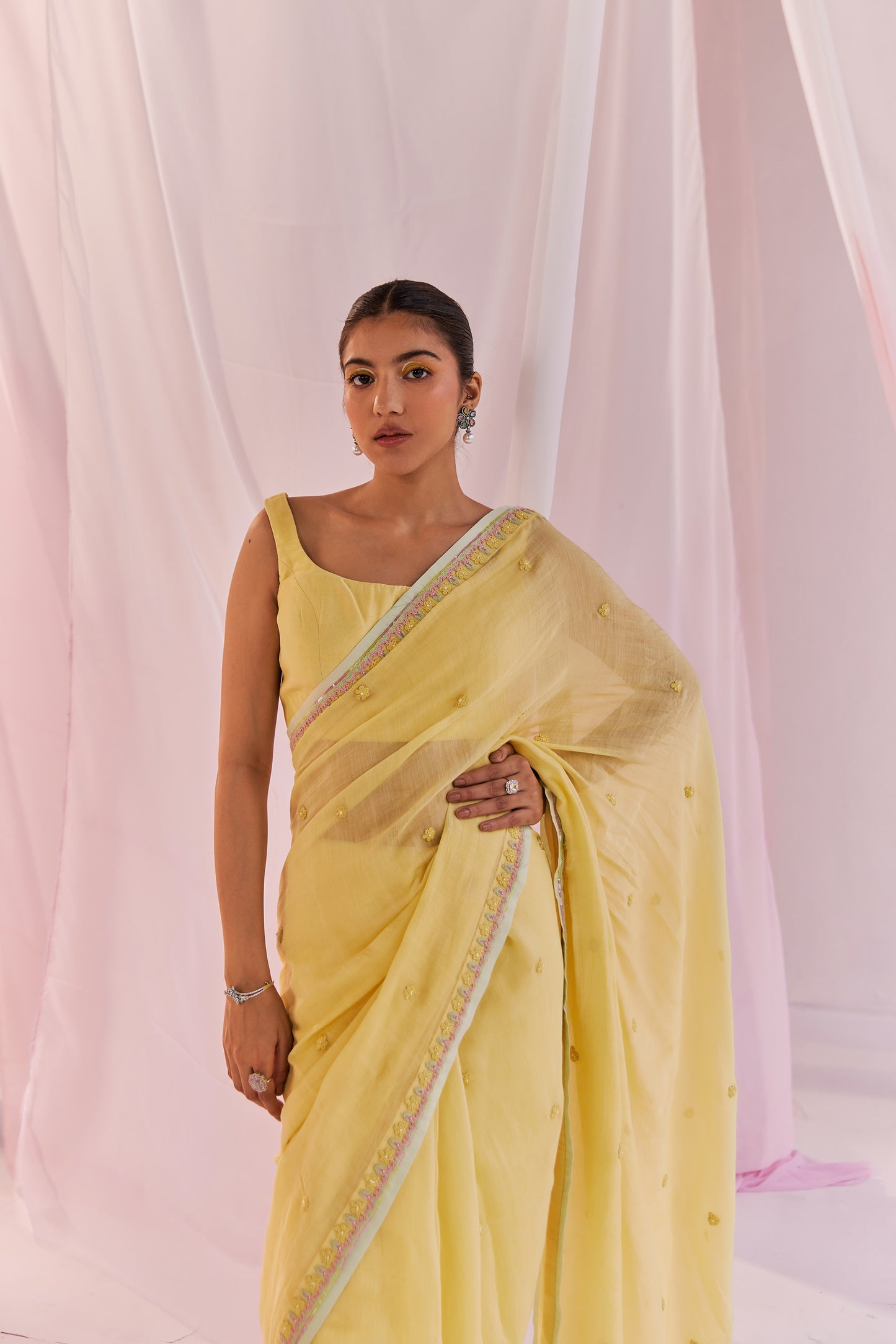 MAAHIRI SAREE - Featuring a Yellow Saree in Silk Chanderi base and with Dori embroidery, sequin and pearl embellishments. It is paired with a matching square neck Silk Chanderi sleevelss blouse.