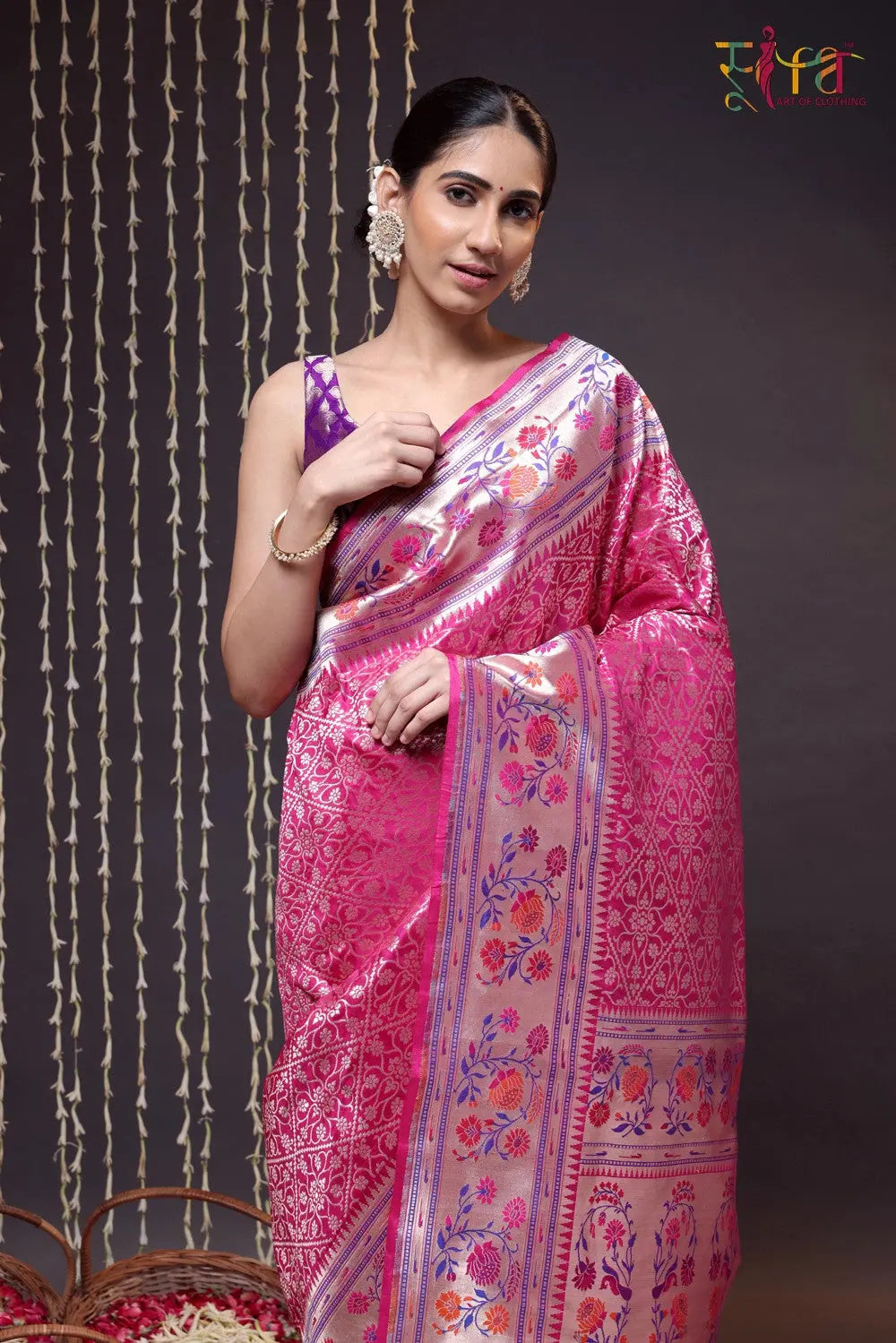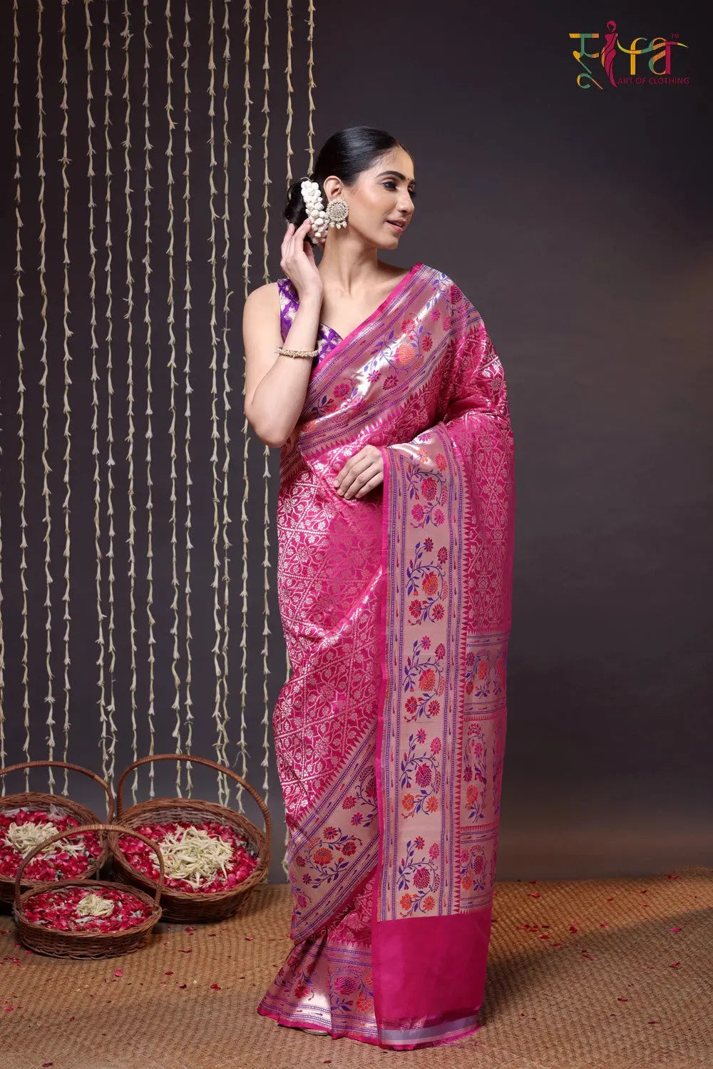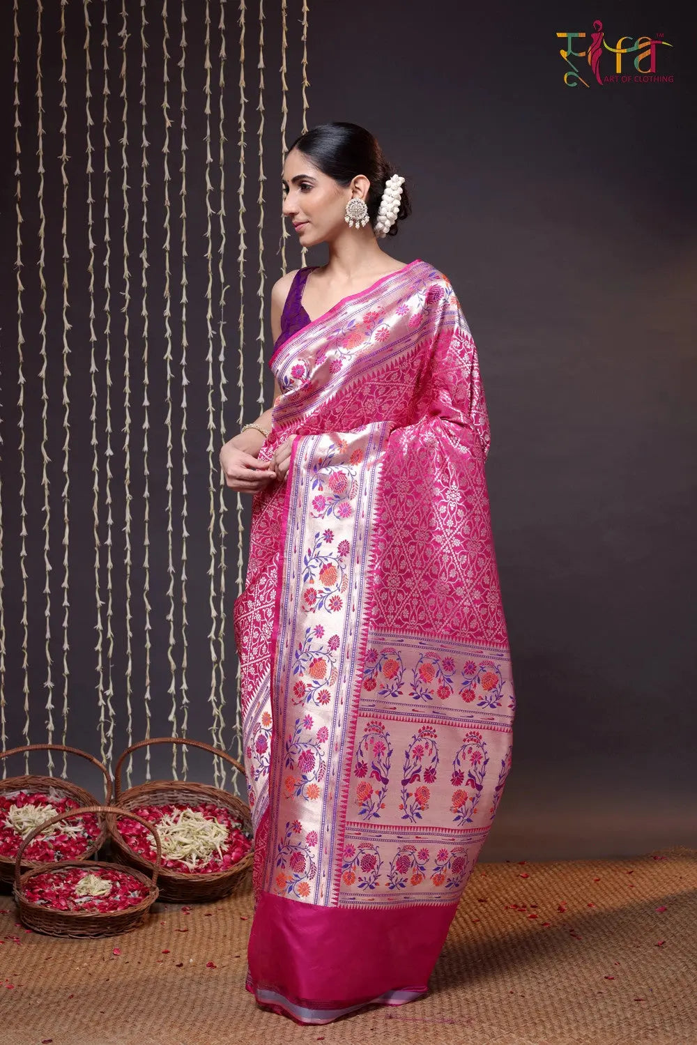 Discover the Handloom Magenta Pure Silk Banarasi Paithani Saree, a harmonious fusion of Banarasi opulence and Paithani finesse. With intricate zari work on rich magenta silk, this masterpiece exudes elegance. Ideal for weddings and bridal wear, it flawlessly blends traditional motifs with contemporary style. Enhance the look with a chic messy bun and timeless jhumkas, striking the perfect balance between classic and modern. Embrace the artistry and heritage of this saree, as it transforms you into the center of attention on any special occasion.