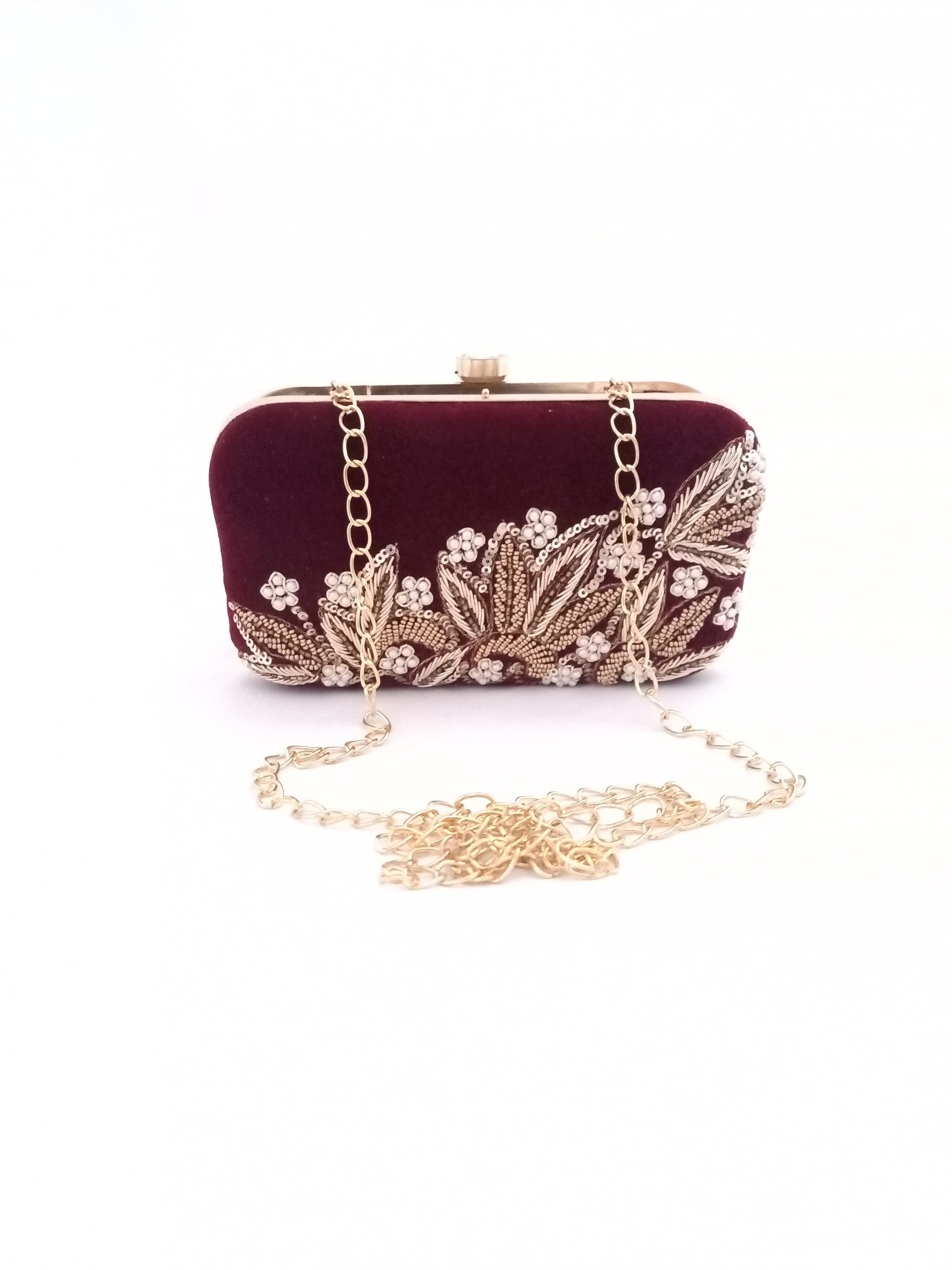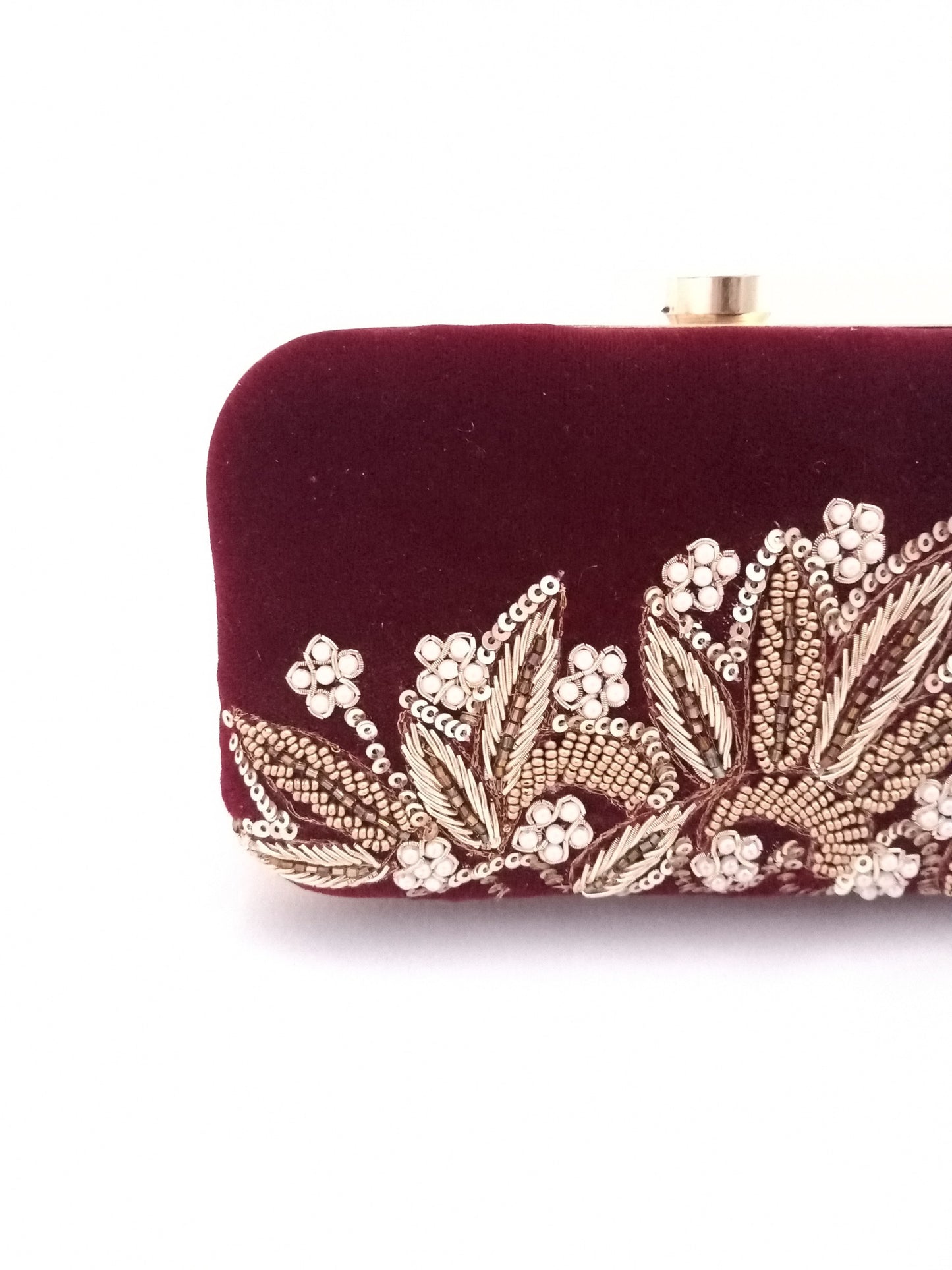 Maroon Dabka Leaf Hand Embroidered Clutch