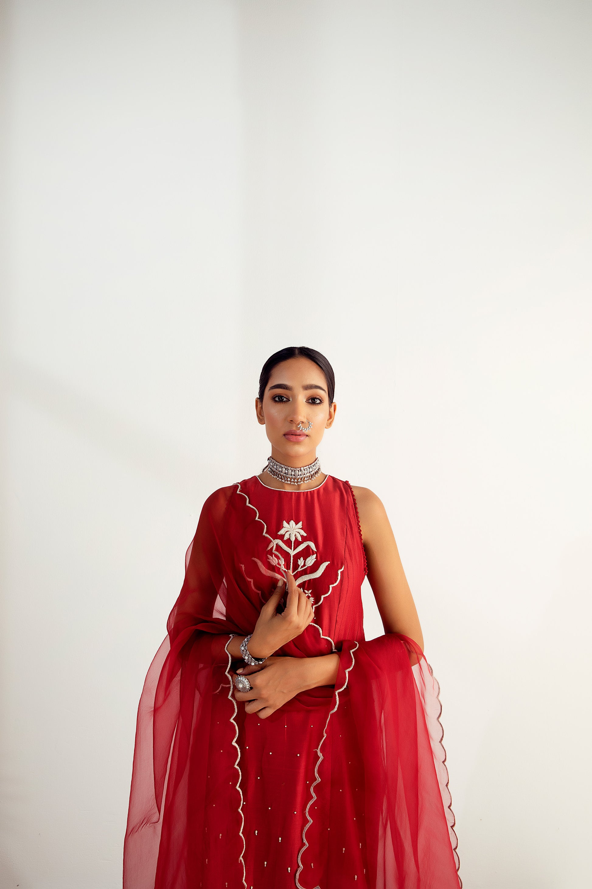 Featuring a maroon kurta in silk chanderi base with dori, badla, and pearl embroidery. It is paired with matching pants and a silk organza dupatta.