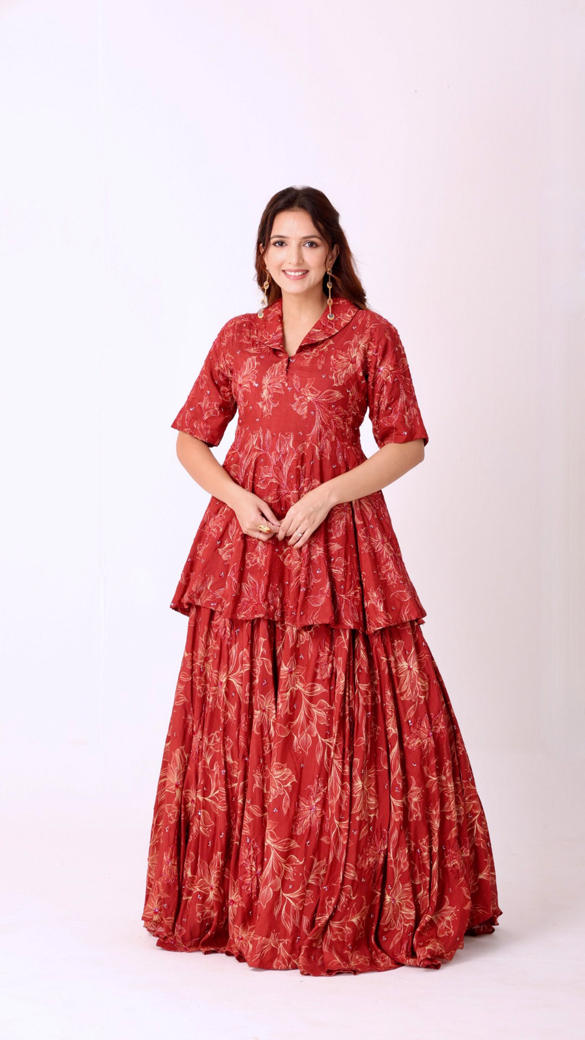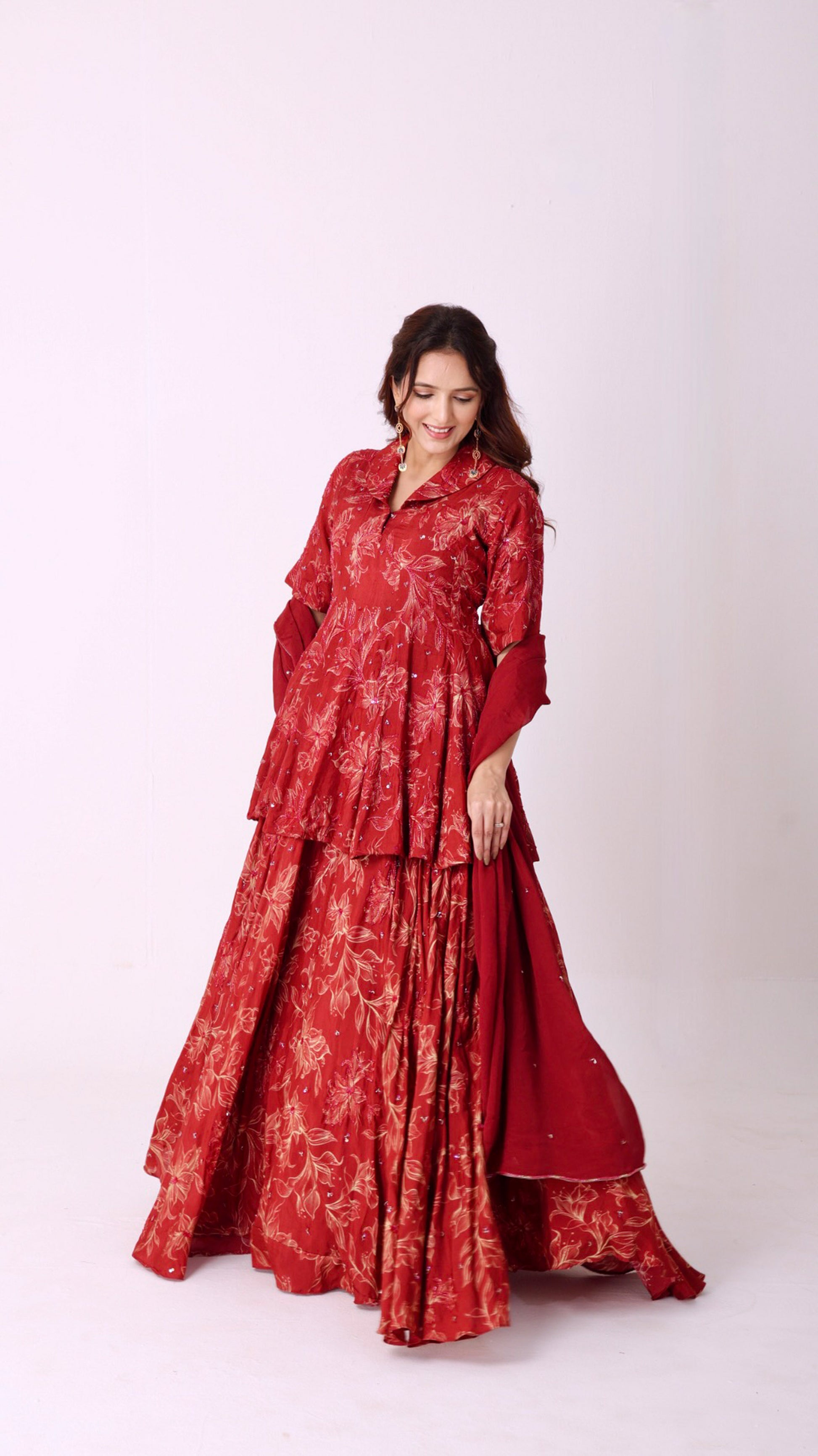 Maroon Hand-embroidered floral peplum kali kurti blouse paired with lehenga & dupatta