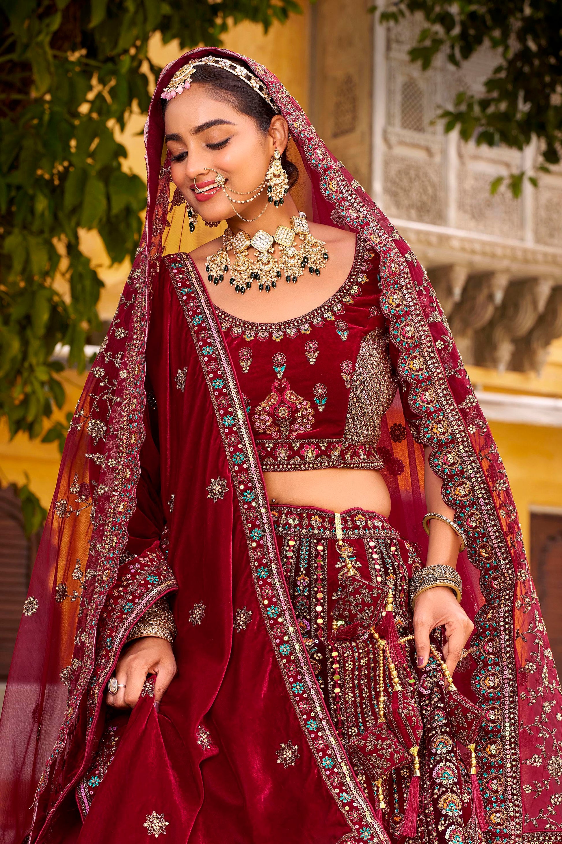 Red Velvet Bridal Lehenga With Hand Embroidery