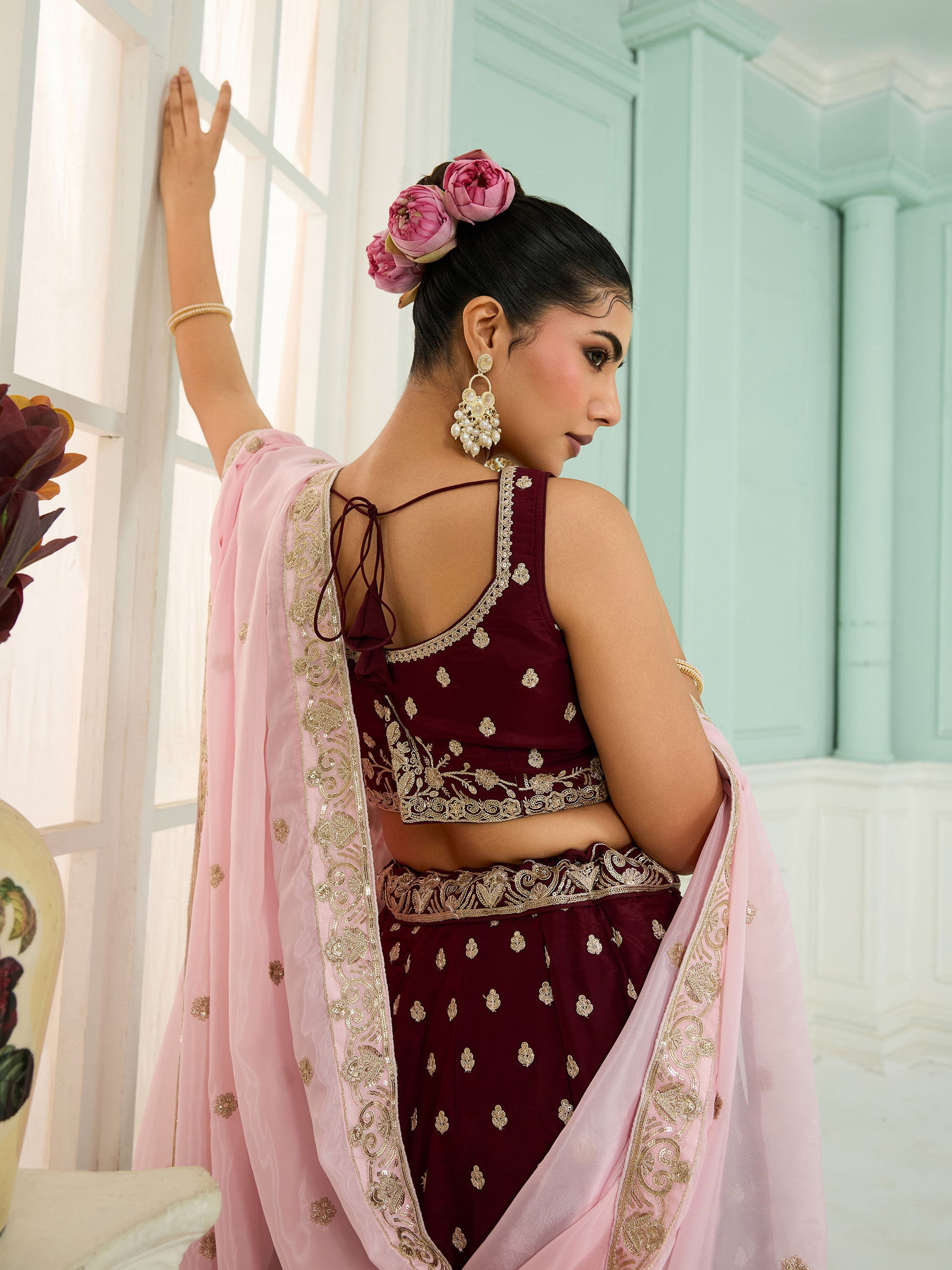 Maroon Organza Sequins Embroidery Bridesmaid Lehenga