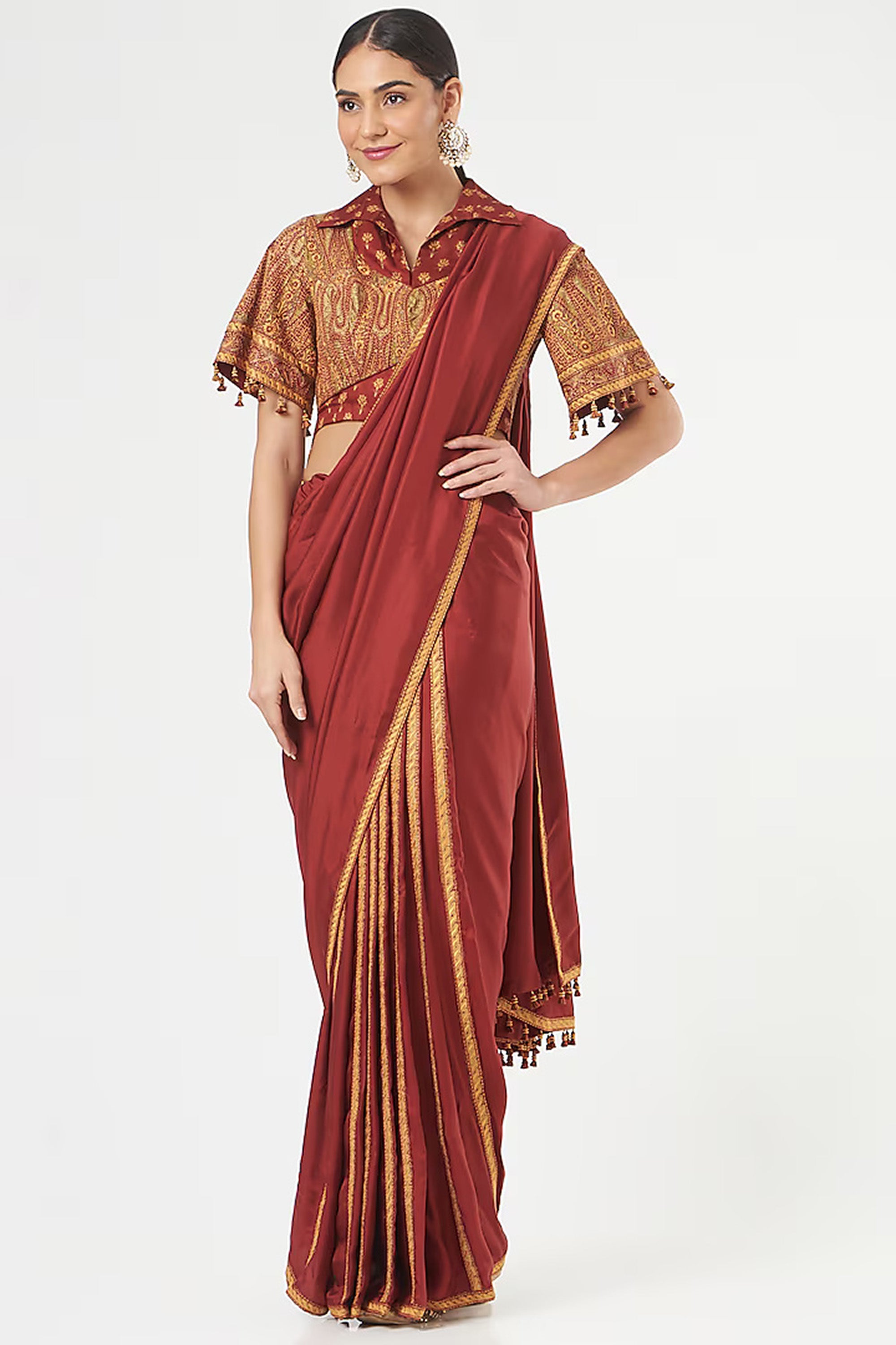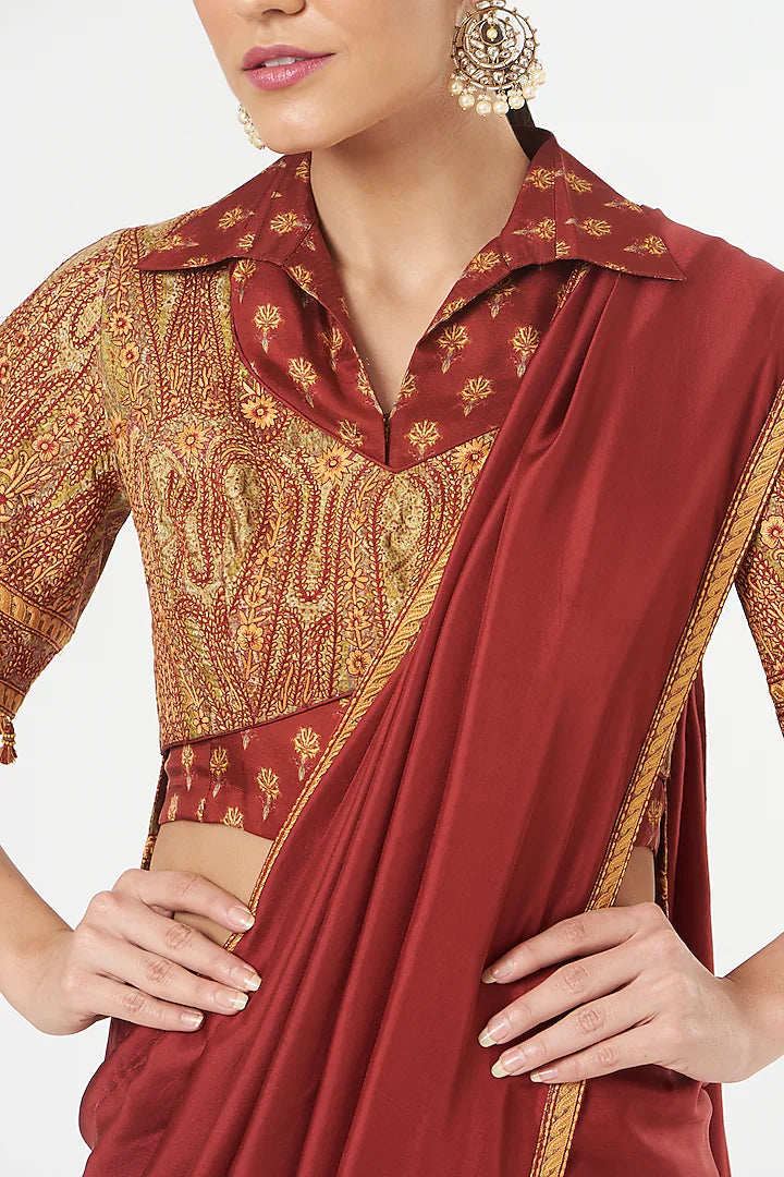 Featuring a maroon saree in pure silk base with kashmiri stitch thread embroidery. It is paired with a matching kashmiri paisley embroidered blouse and a shirt blouse with kashmir print.