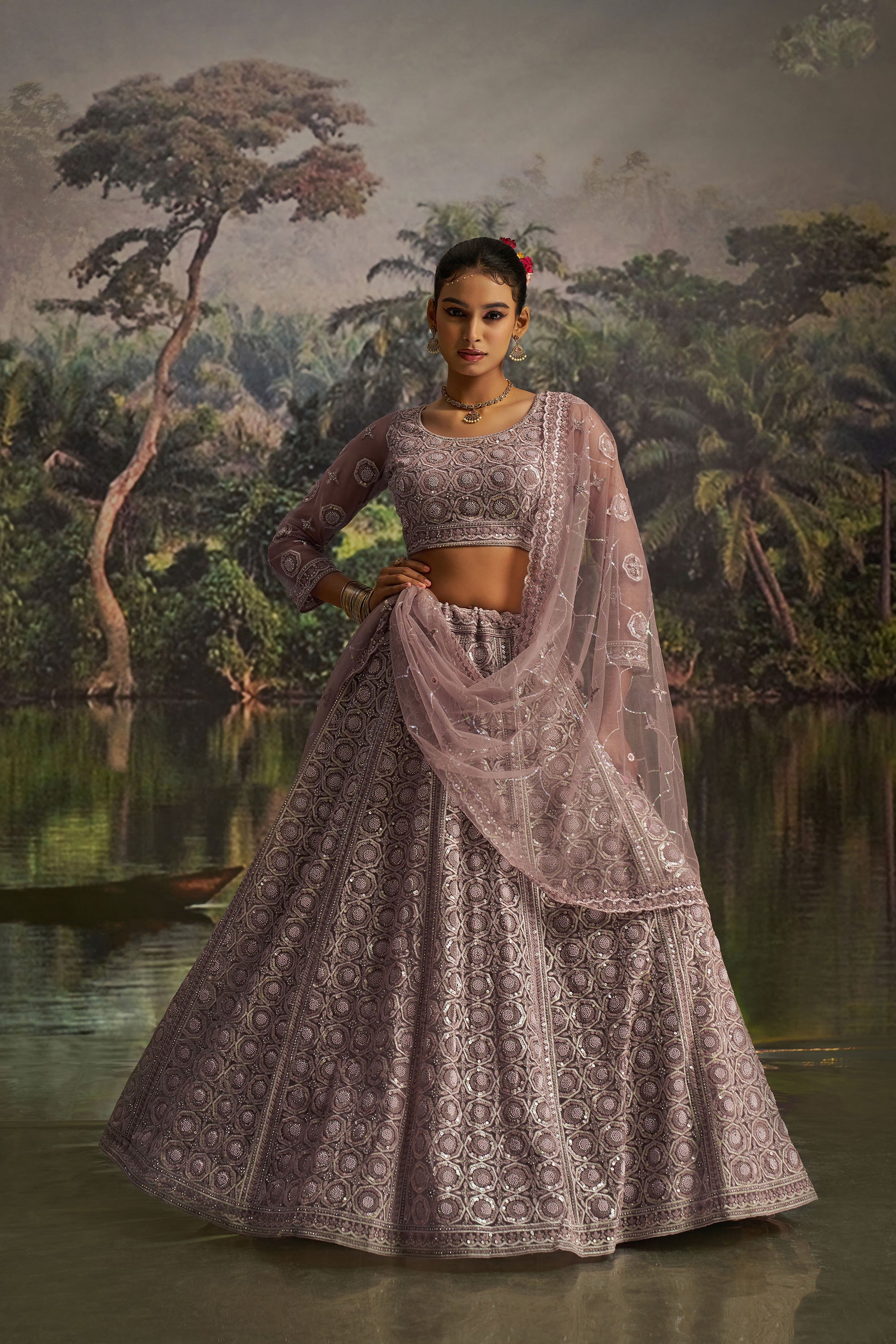 Mauve Soft Net Dori, Zarkan & Sequins Embroidered Sangeet Lehenga