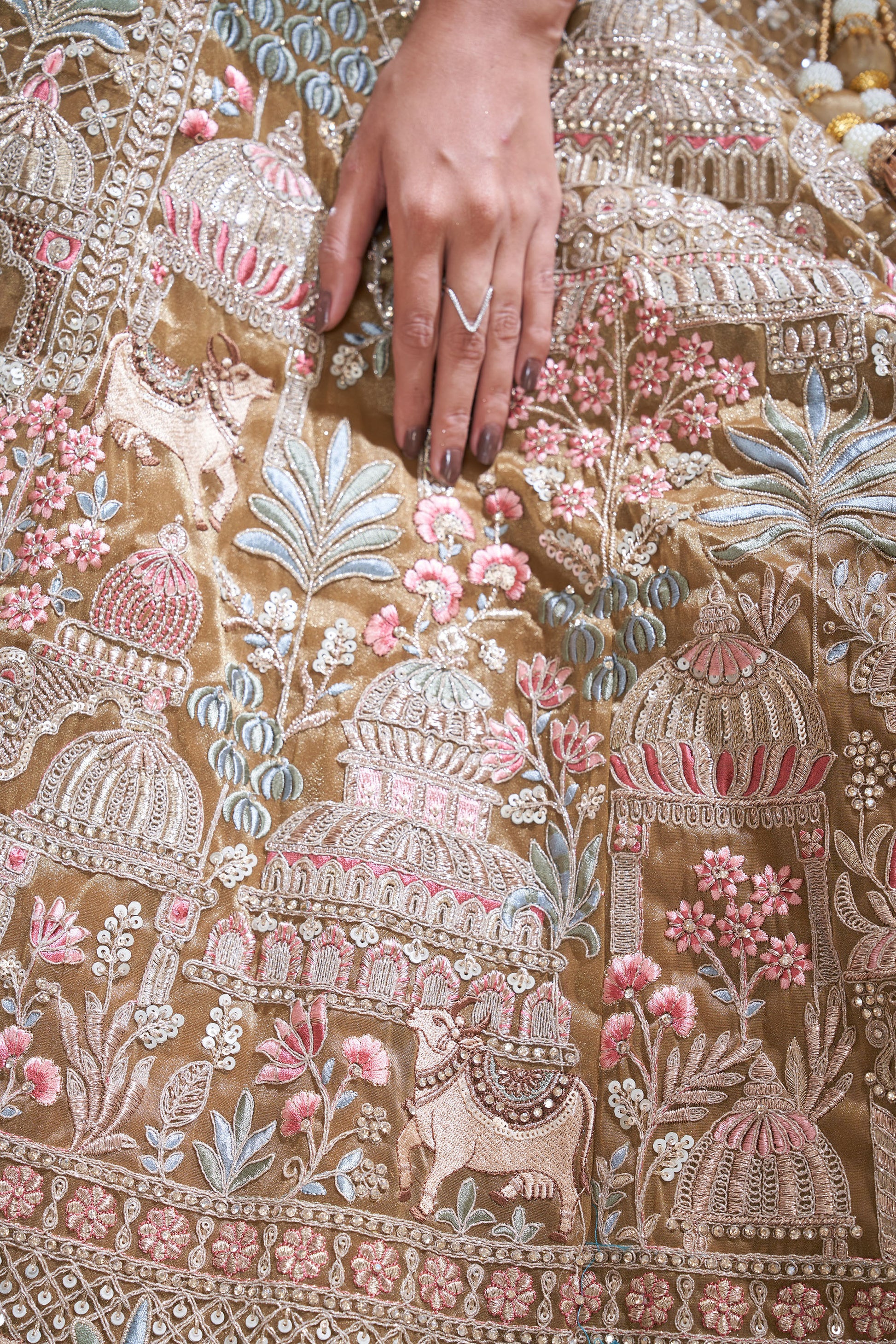 Designer Bridal Lehenga exquisite temple and auspicious cow motifs, symbolizing purity, blessings, and tradition. Beautifully crafted with rich zari, resham, and sequins embroidery, this lehenga reflects the grandeur of Indian heritage. This Lehenga is perfect choice for brides who cherish culture and artistry. Paired with an intricately embroidered blouse and a graceful dupatta.