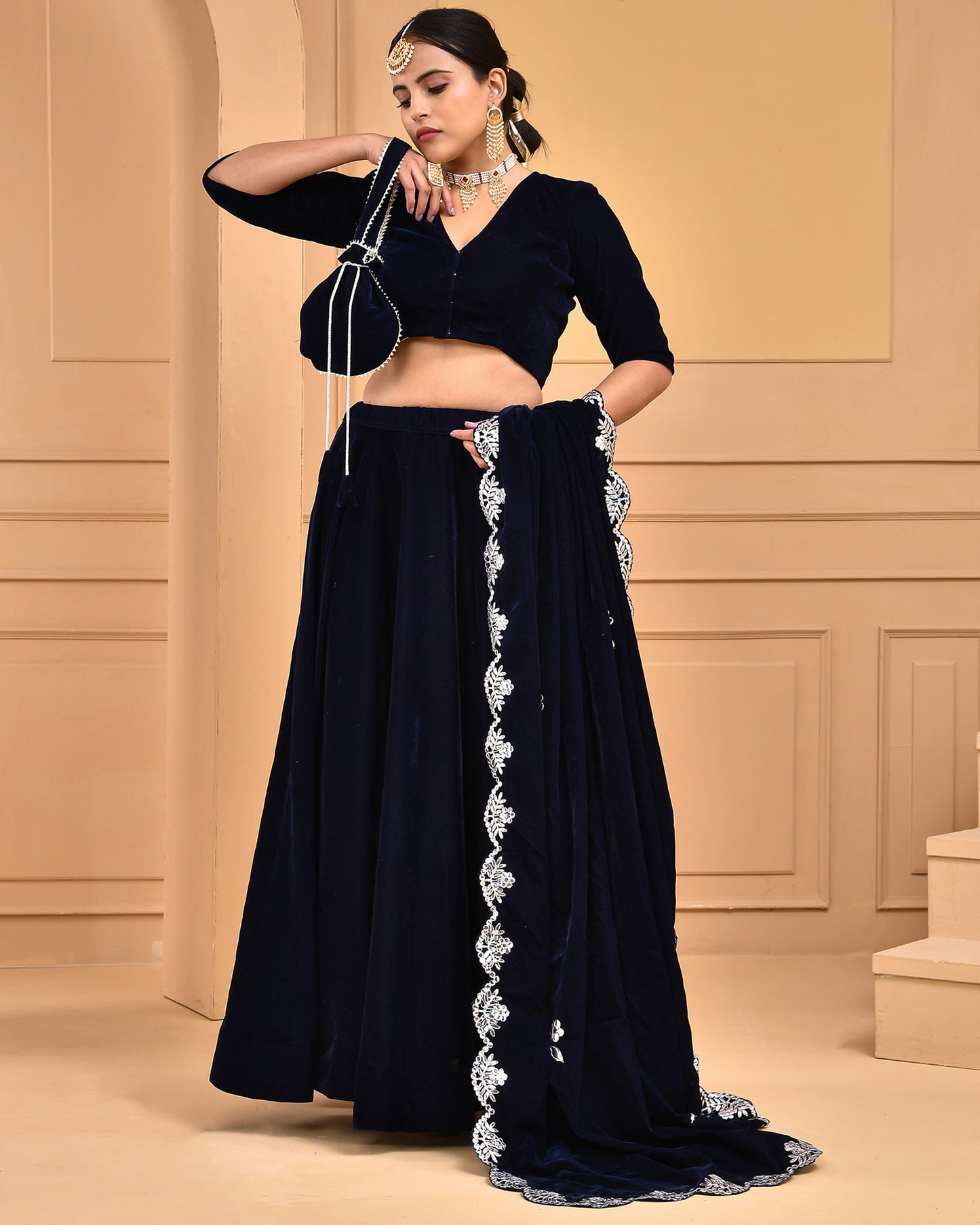 This midnight blue velvet lehenga set exudes elegance and grace. The luxurious velvet material offers a soft and smooth feel, while the heavy dupatta complements the intricate design of the lehenga.