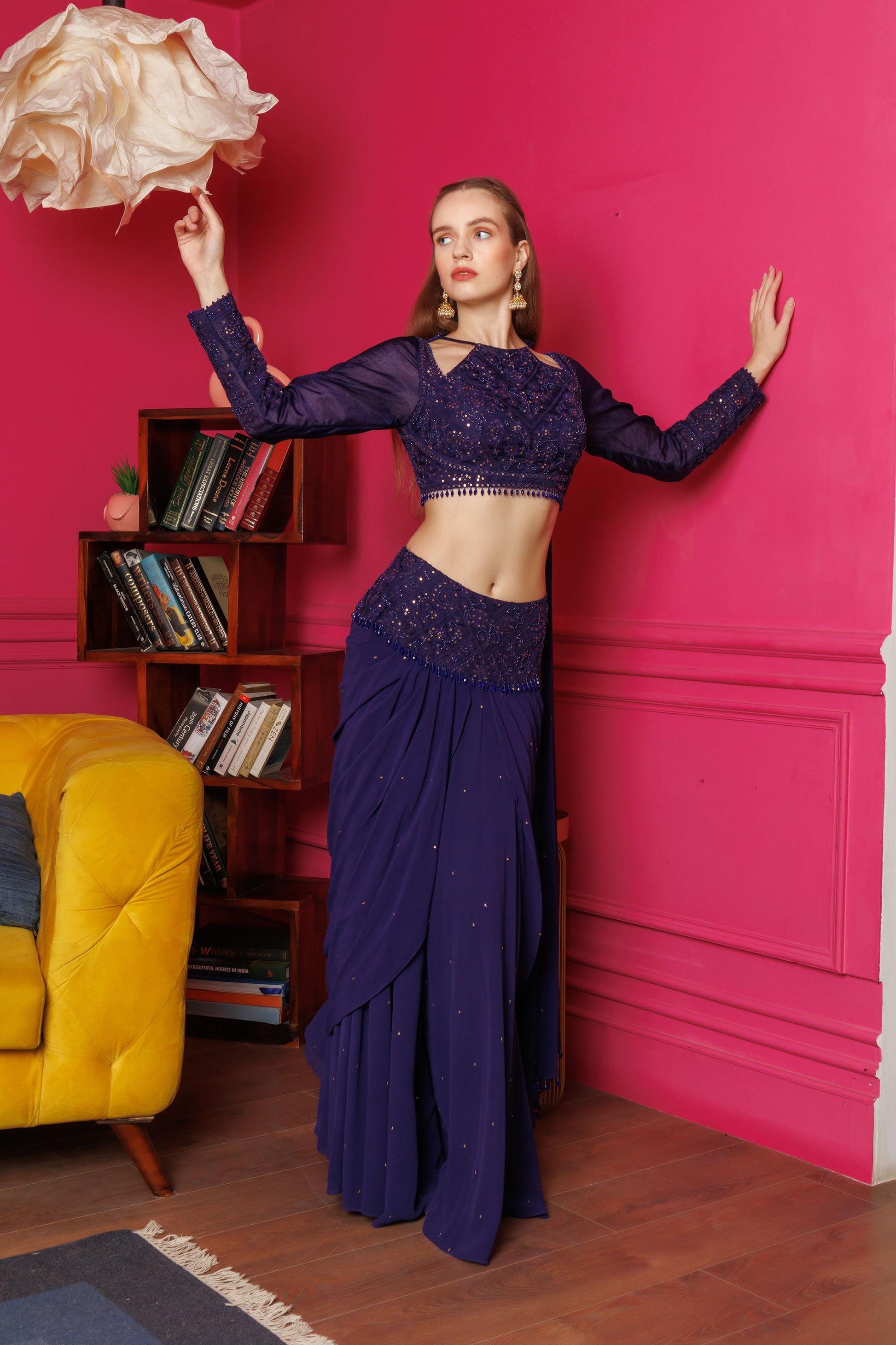 A stunning vision in midnight blue, this draped skirt and cold-shoulder blouse set is sure to be a showstopper. Made in organza and georgette, this look is lightweight and easy to carry. It is a contemporary take on the traditional lehenga choli. Complemented by an attached dupatta, this look features intricate thread and sequin work on the blouse and around the skirt waistband, enhanced with hanging beads and handmade tassels.