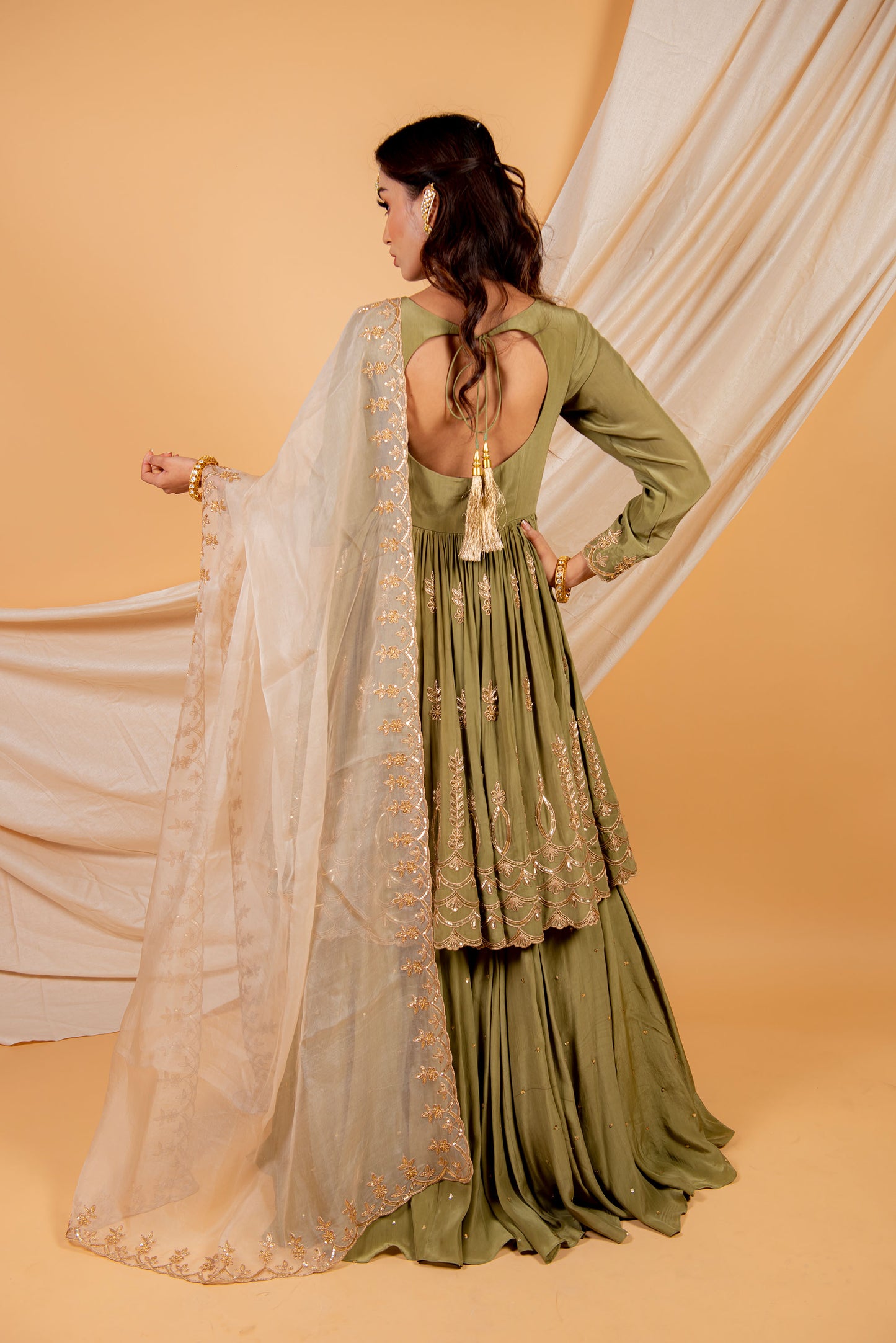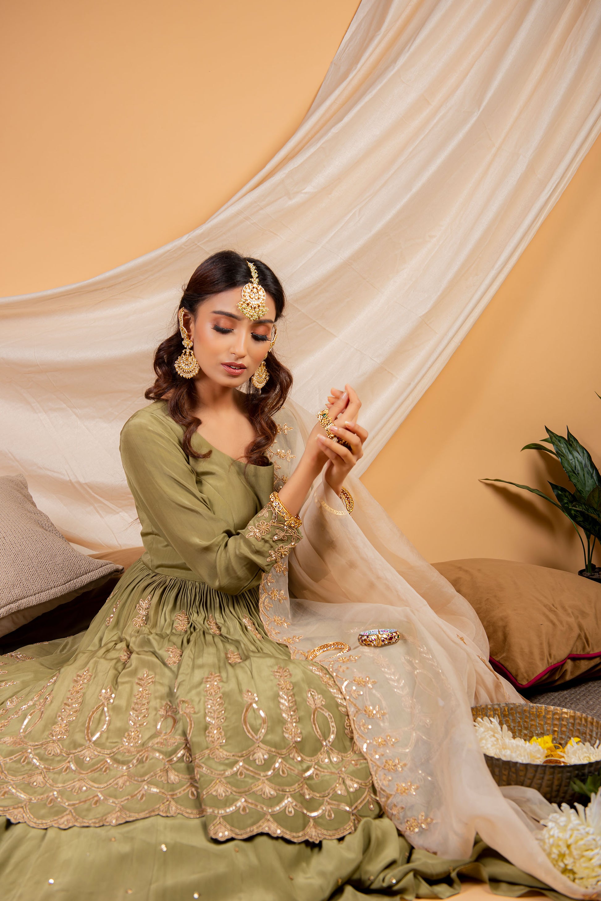 Mint Green Floral Embroidered Kurta Lehenga Set