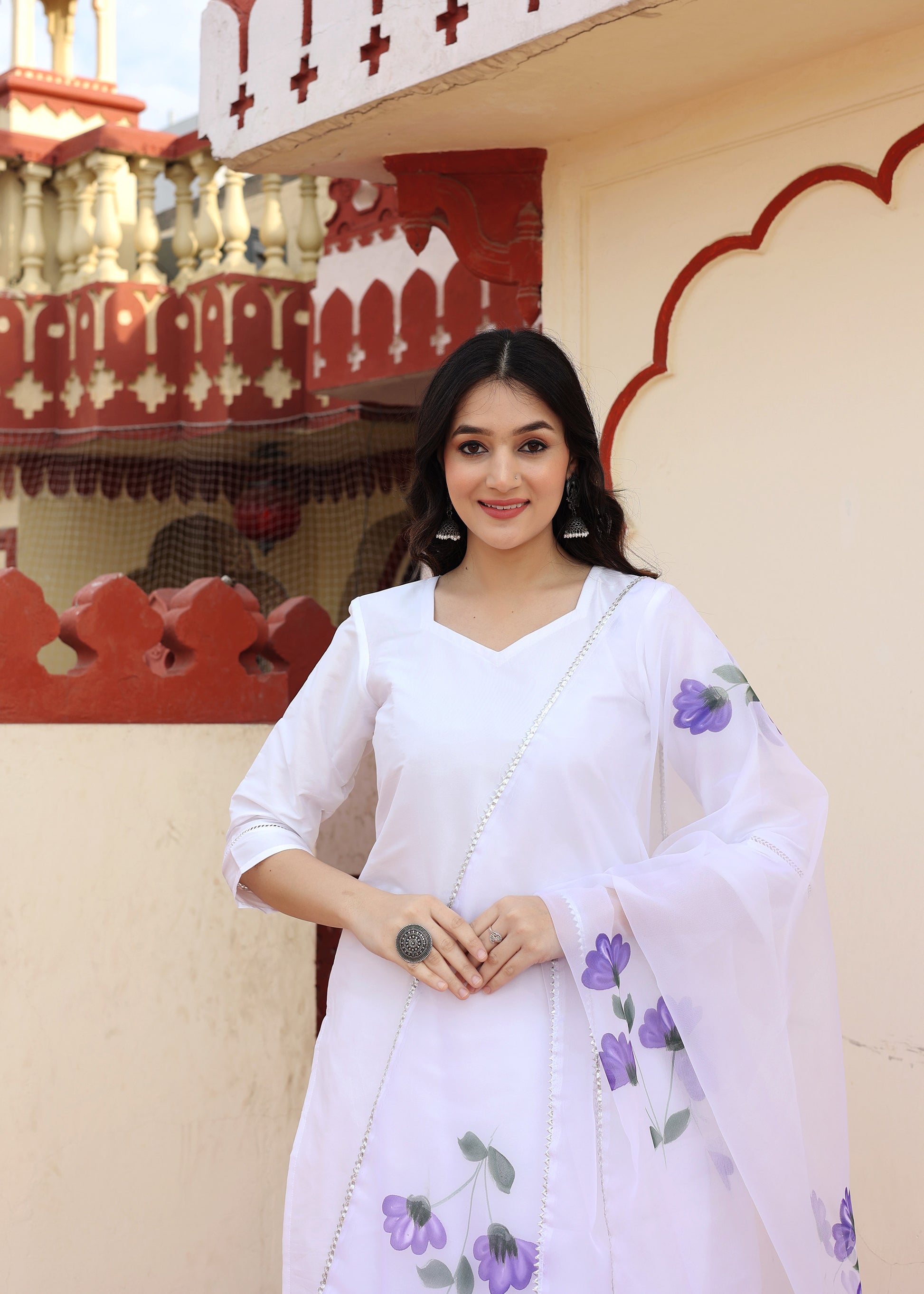 Morning Glory Taffeta Silk White Hand Painted Suit Set