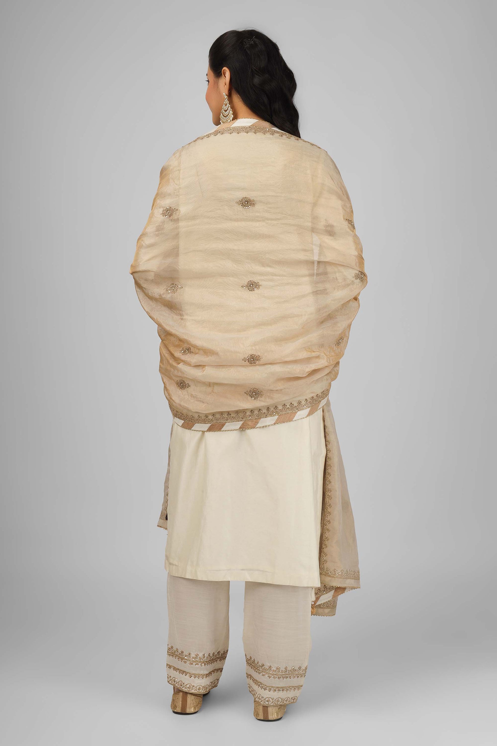 Featuring off white embroidered silk chanderi kurta with matching viscose dupion pallazo and organza dupatta