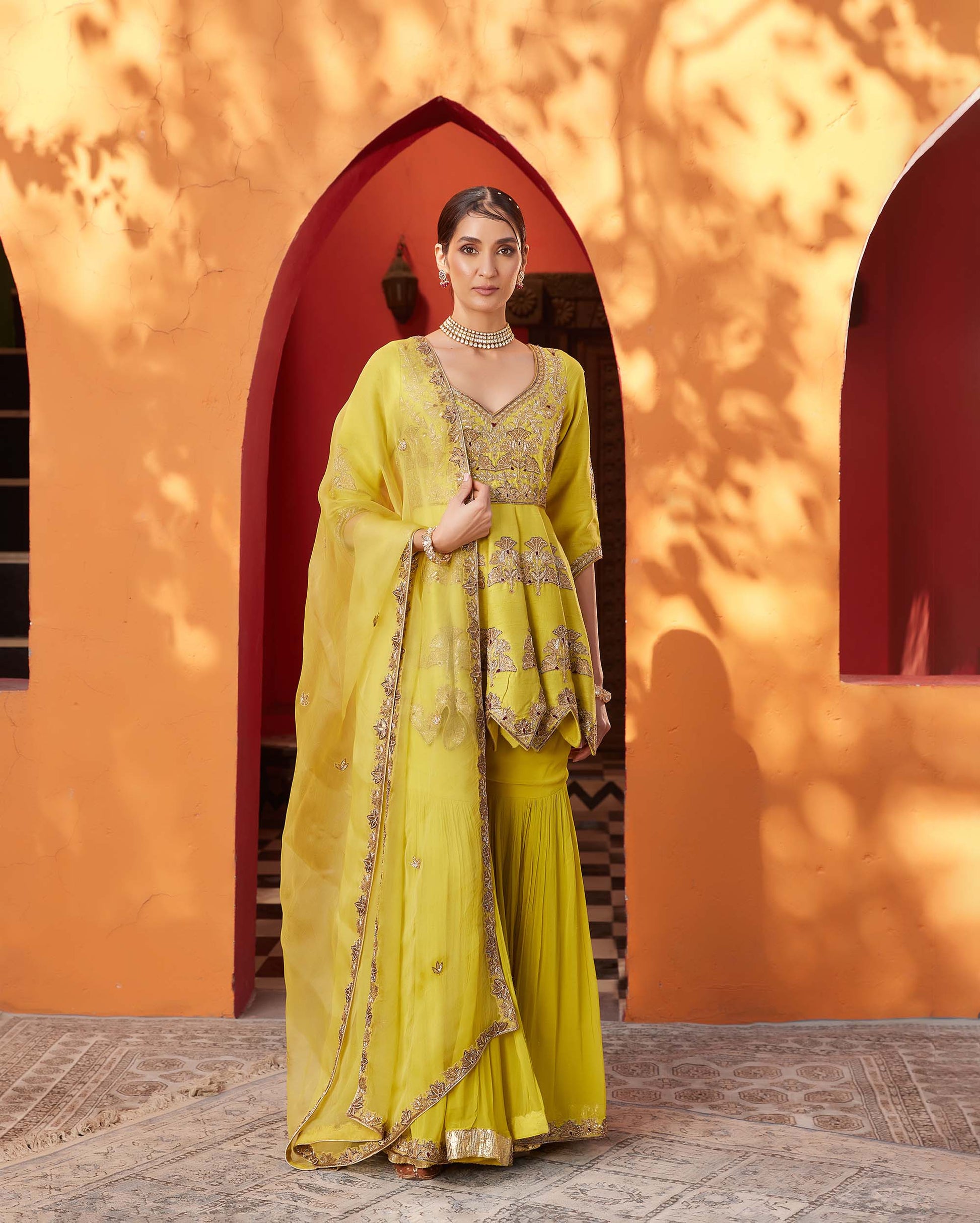 Featuring yellow embroidered raw silk peplum kurta with matching sharara and organza dupatta set