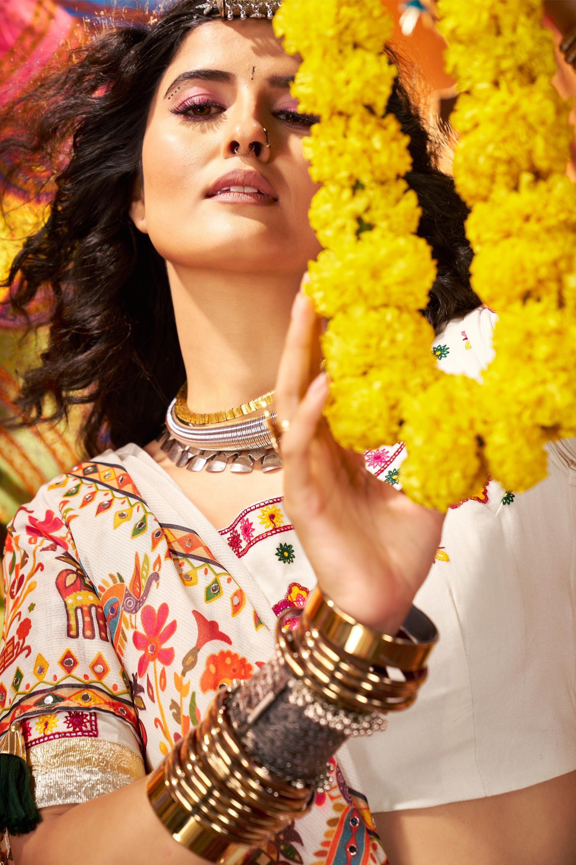 Traditionally, women wear chaniya choli—a traditional Gujarati three-piece outfit comprising choli (a blouse), a chaniya (long flared skirt), and an embellished dupatta (long scarf). Chaniya cholis are paired with glittering bangles, payals (ankle bracelets), necklaces, and belts.