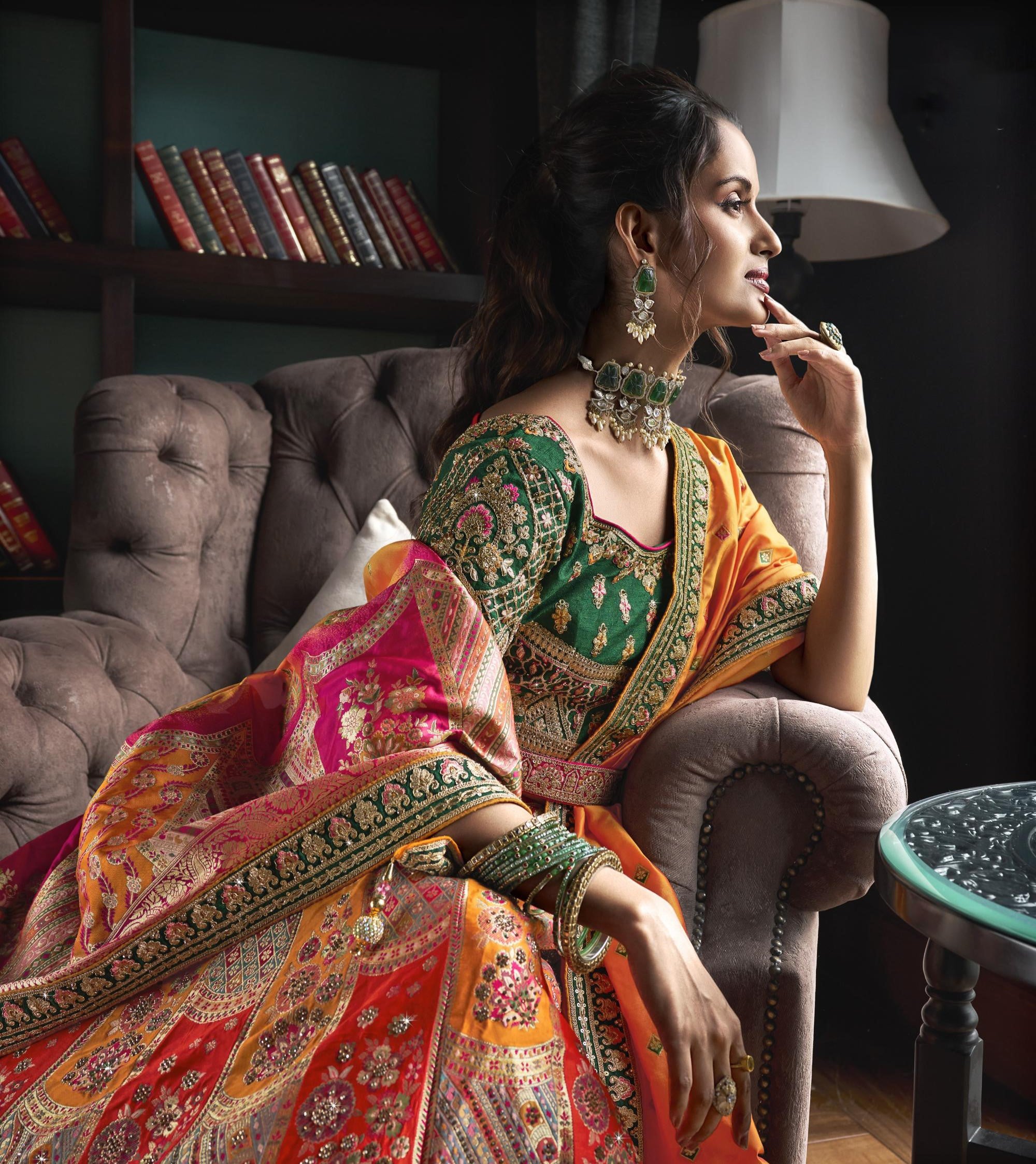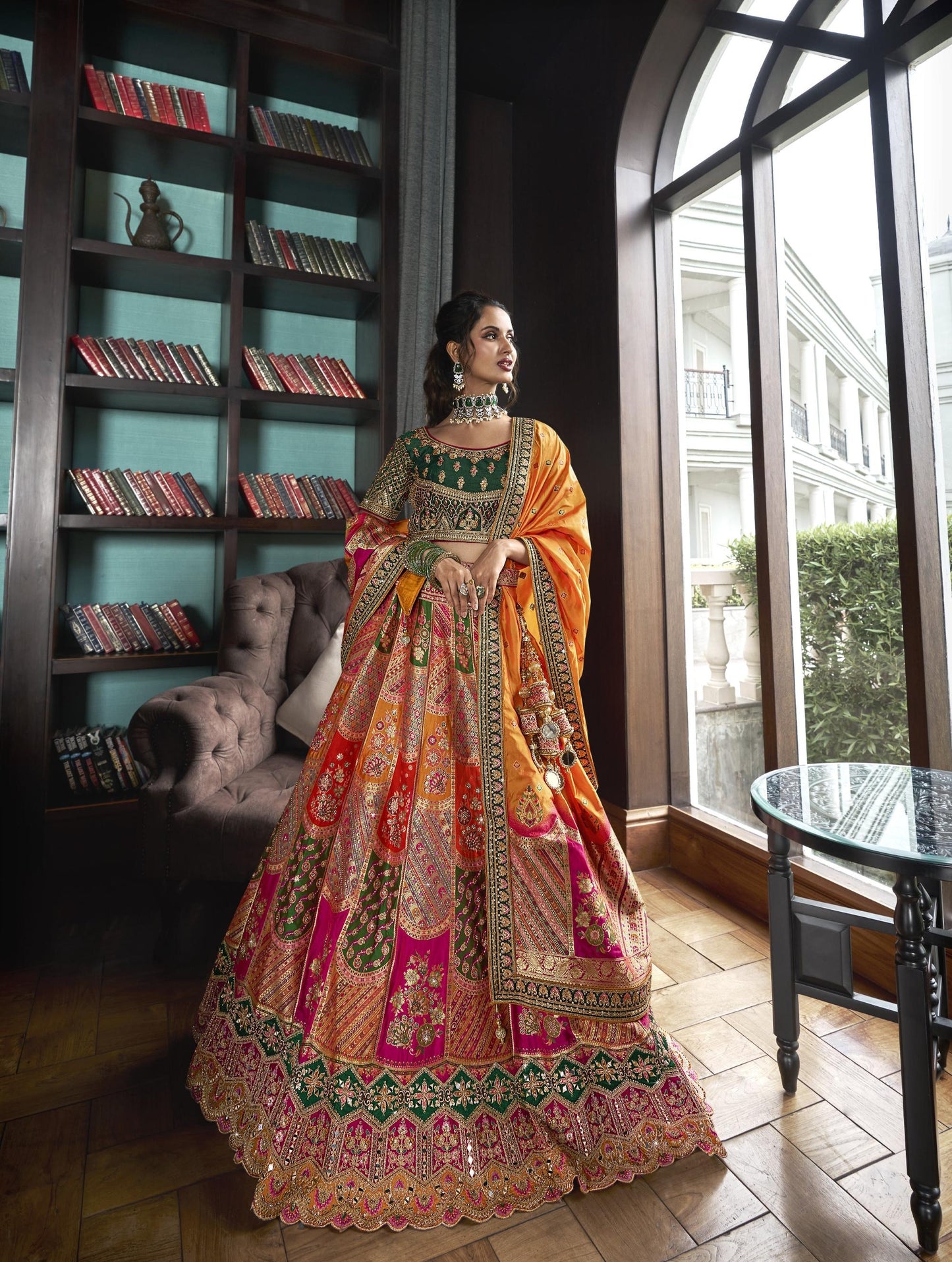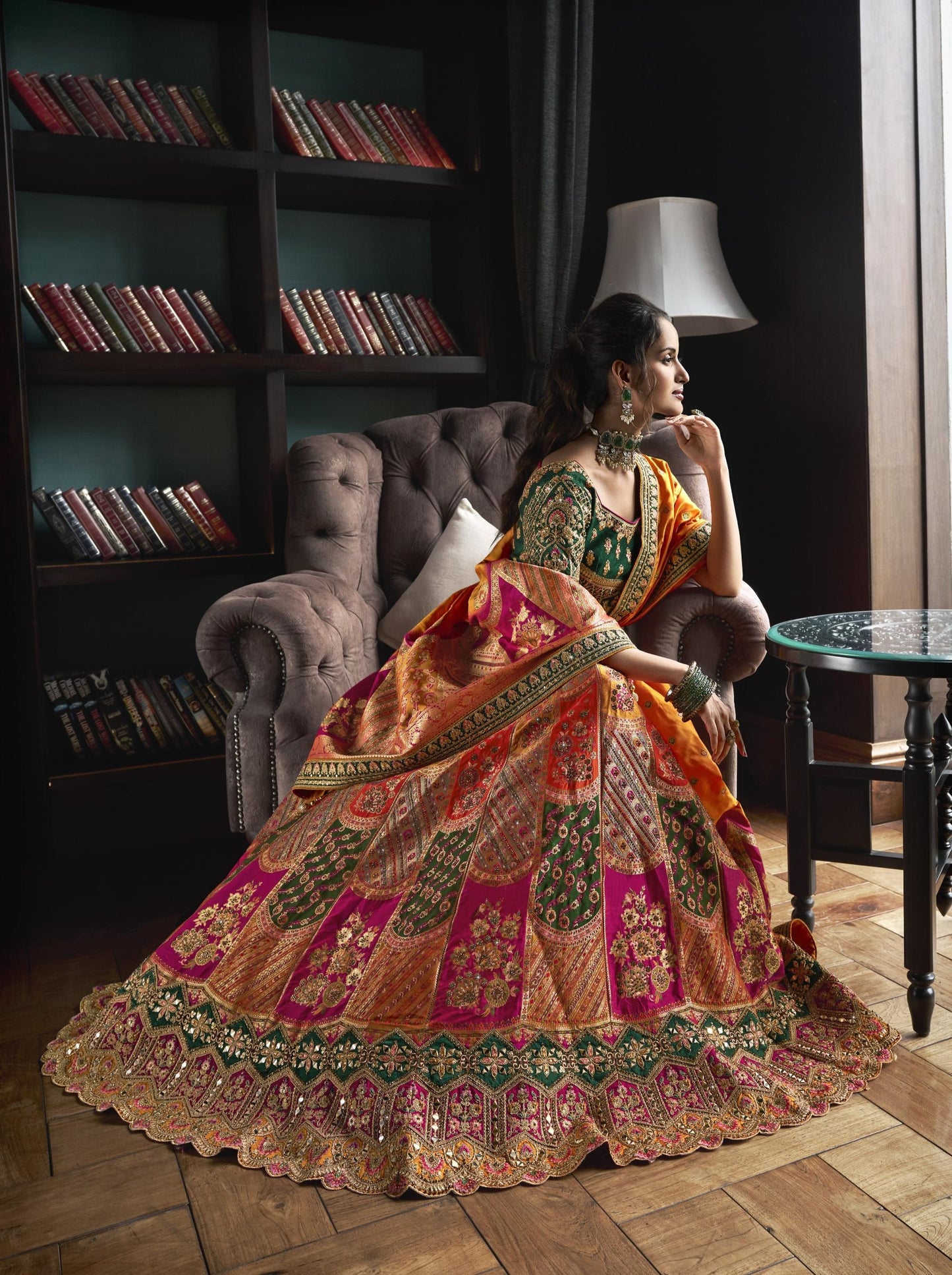 Mustard-Green Zarkan Embroidered Banarasi Silk Bridal Lehenga