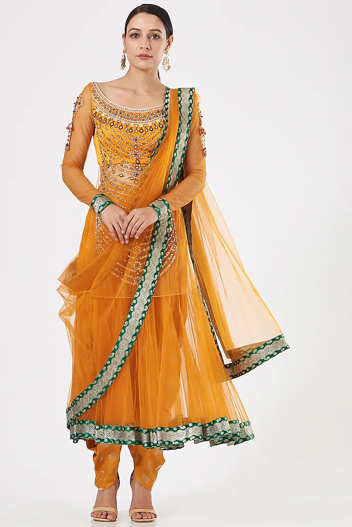 Featuring a mustard dhoti saree in french net and pure banarasi silk base with embroidery. It is paired with a matching long blouse. Accentuate it with statement jewellery and heels for a haldi ceremony or festive occasion.