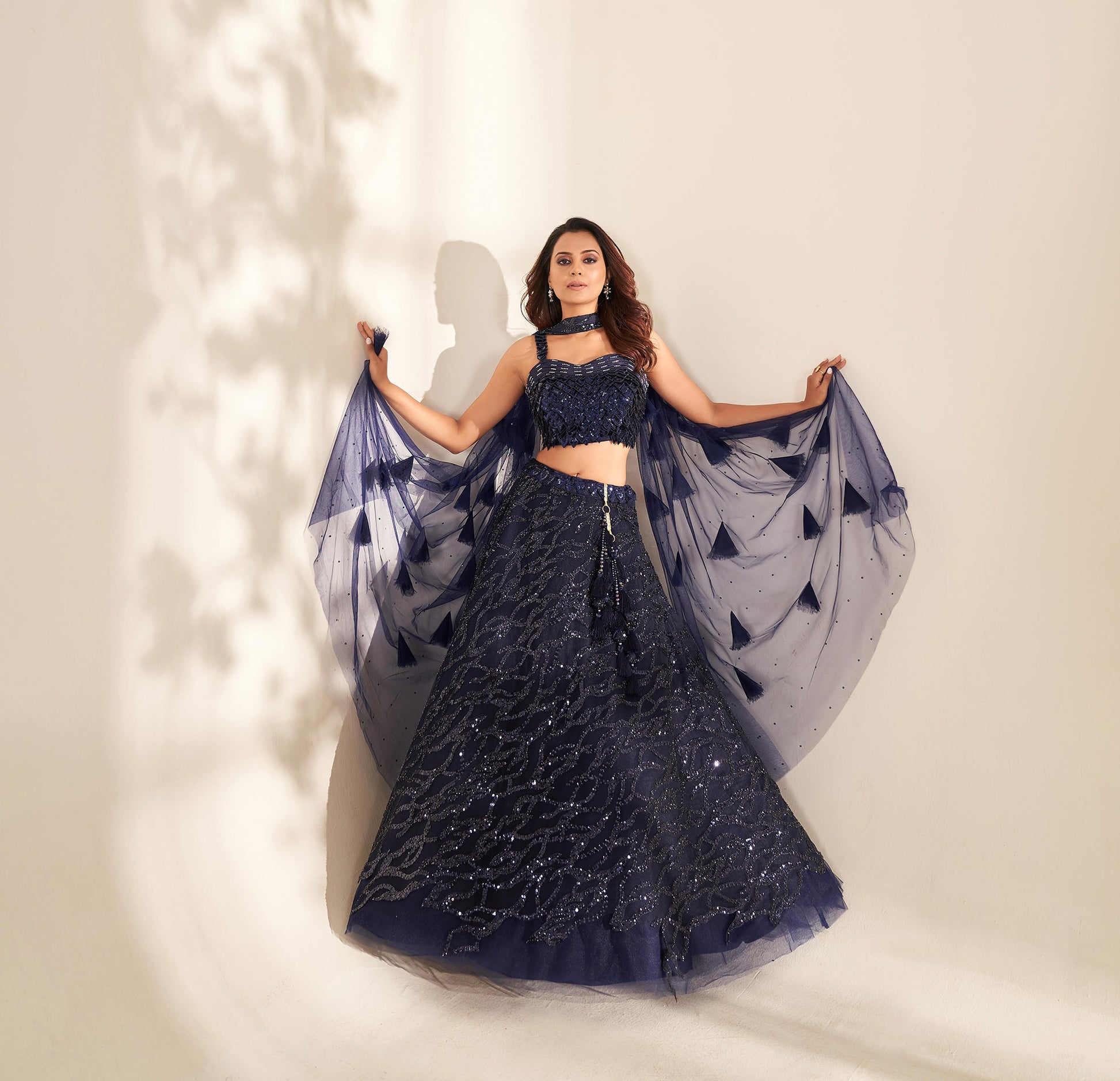 Navy Blue Heavy Sequins Embroidery Net Party Wear Lehenga