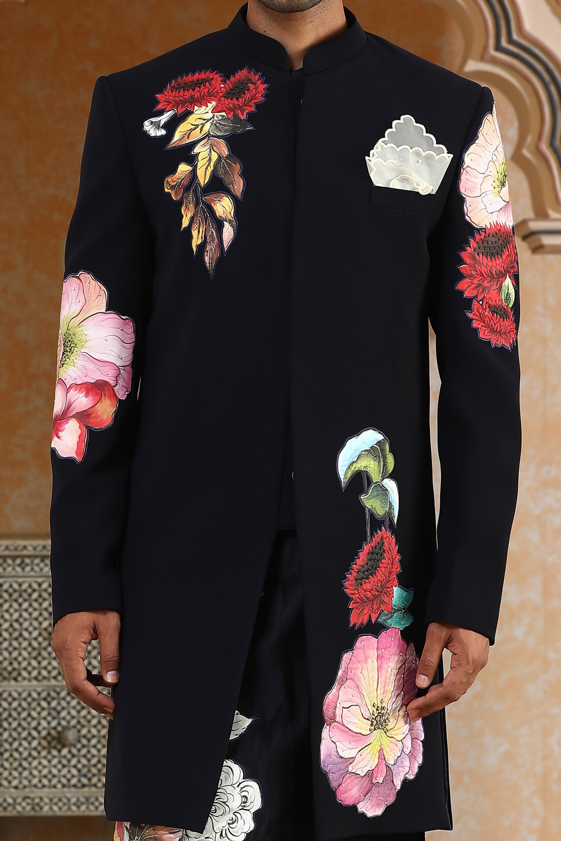 Rooted in regal elegance, this navy blue Indo set is a tribute to the blooming grandeur of royal gardens. The jacket is crafted in a rich blend of Italian viscose and Chanderi silk, hand-painted with delicate floral motifs that echo Mughal frescoes. Embellished with subtle pearl moti and zari embroidery, each detail glistens like dew on midnight petals. Paired with a coordinating kurta and tailored pants, this ensemble blends artisanal romance with modern refinement—perfect for weddings, soirées, or when you want to wear your heritage like art.
