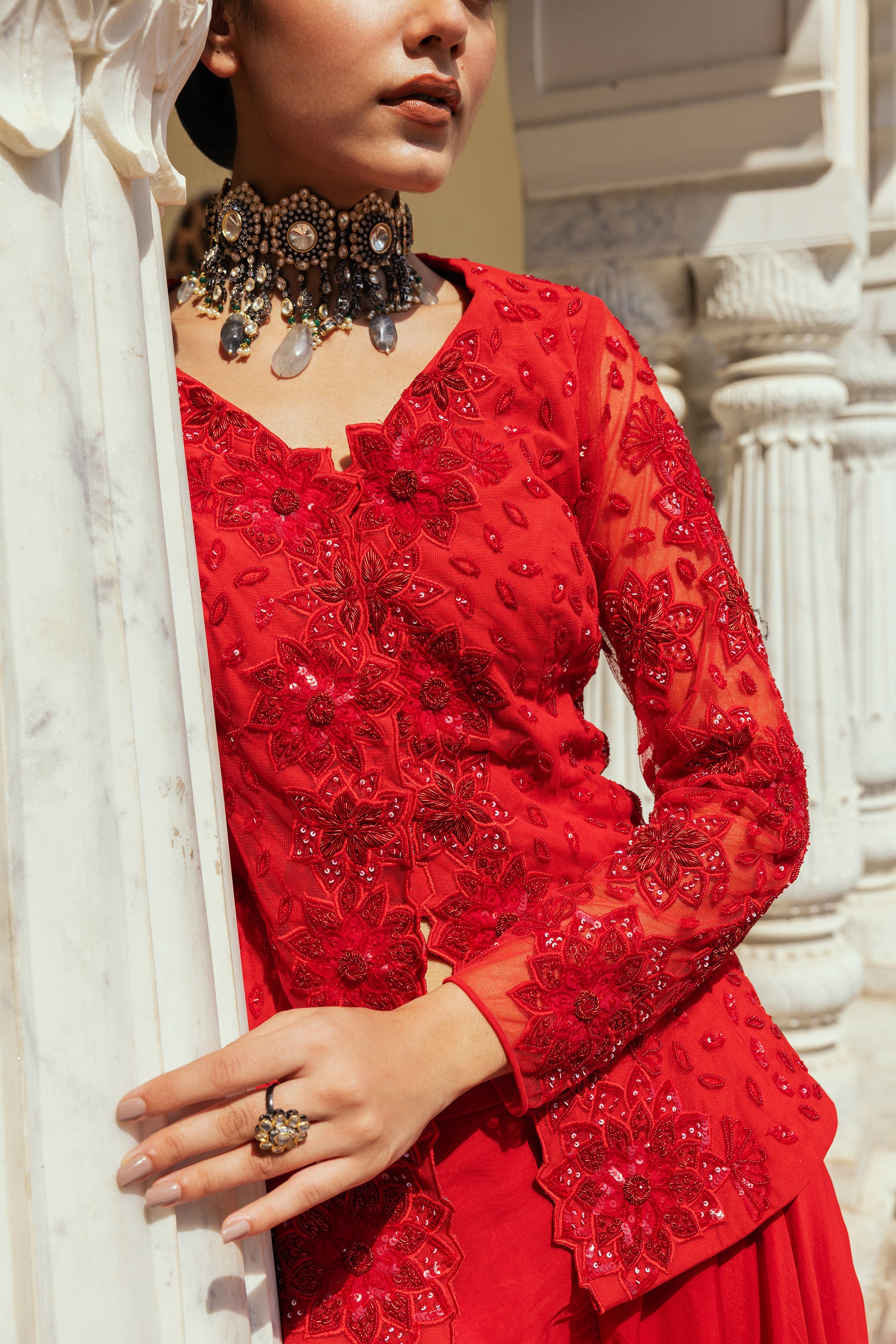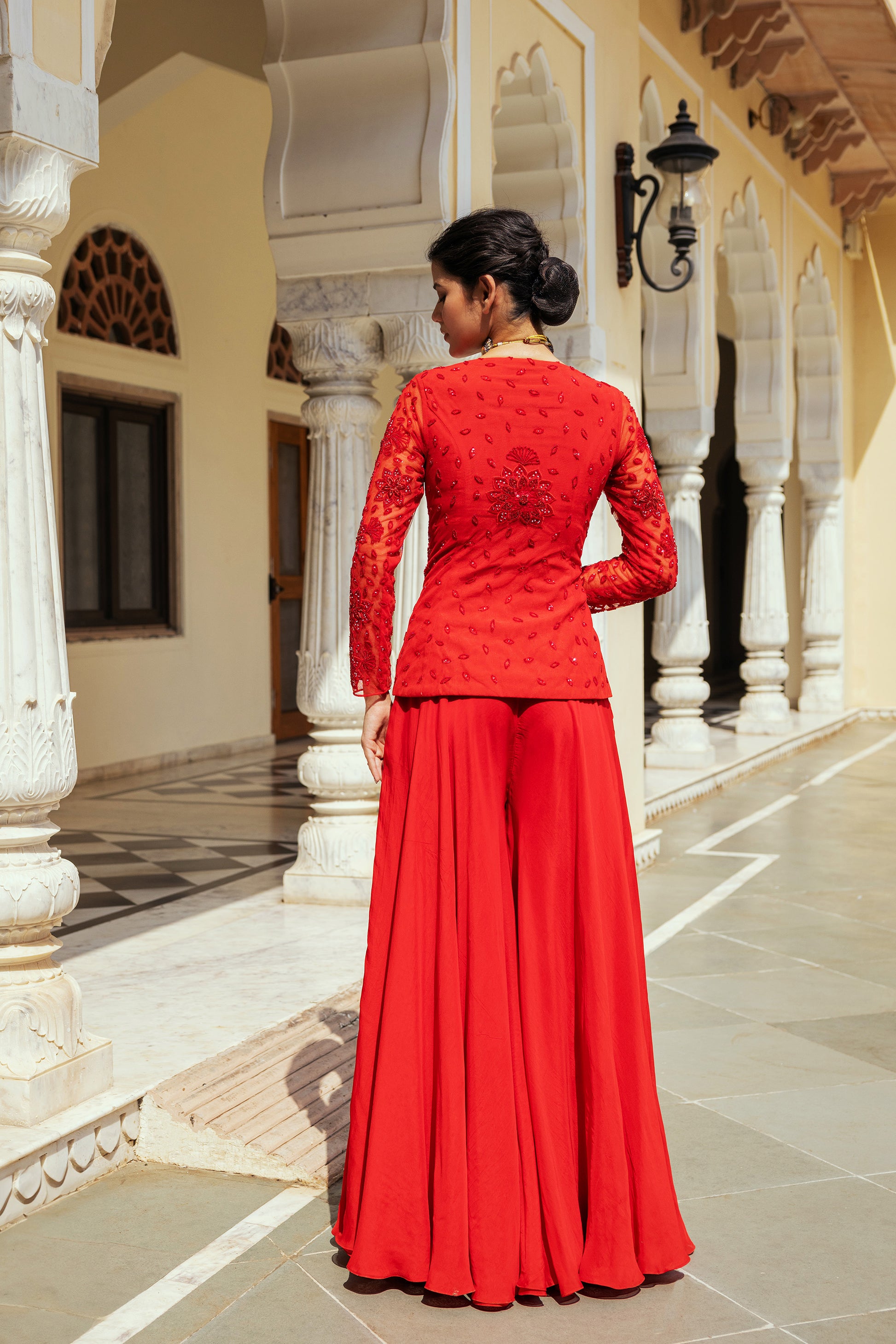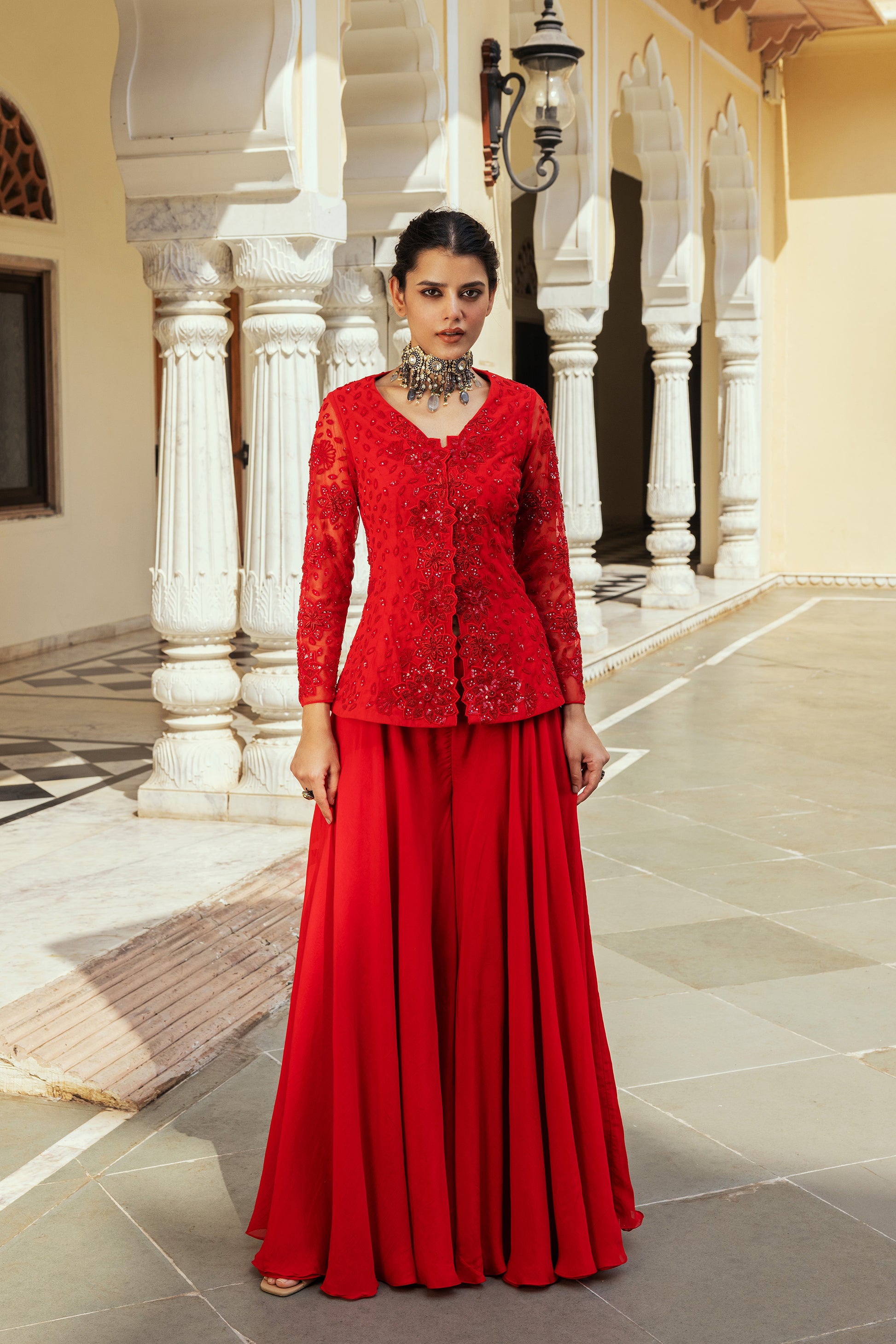 NIMRA SHARARA SET - Featuring a hand embroidered Red jacket in net base with beautiful zardozi and resham work, hand embroidered sequins and cut daana. It is paired with matching flared organza sharara.