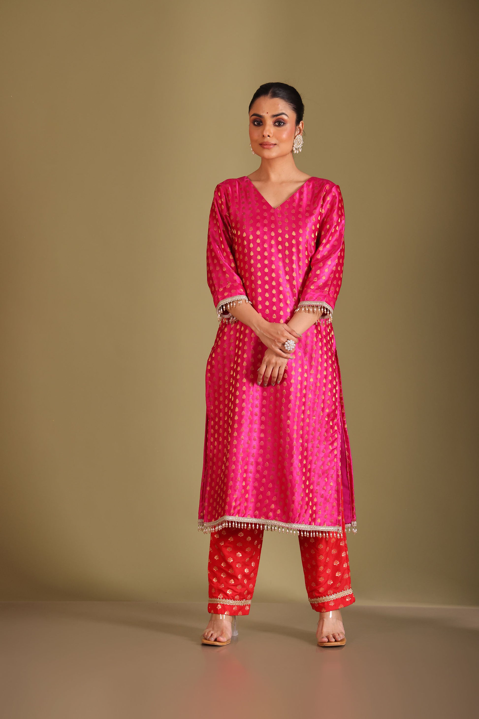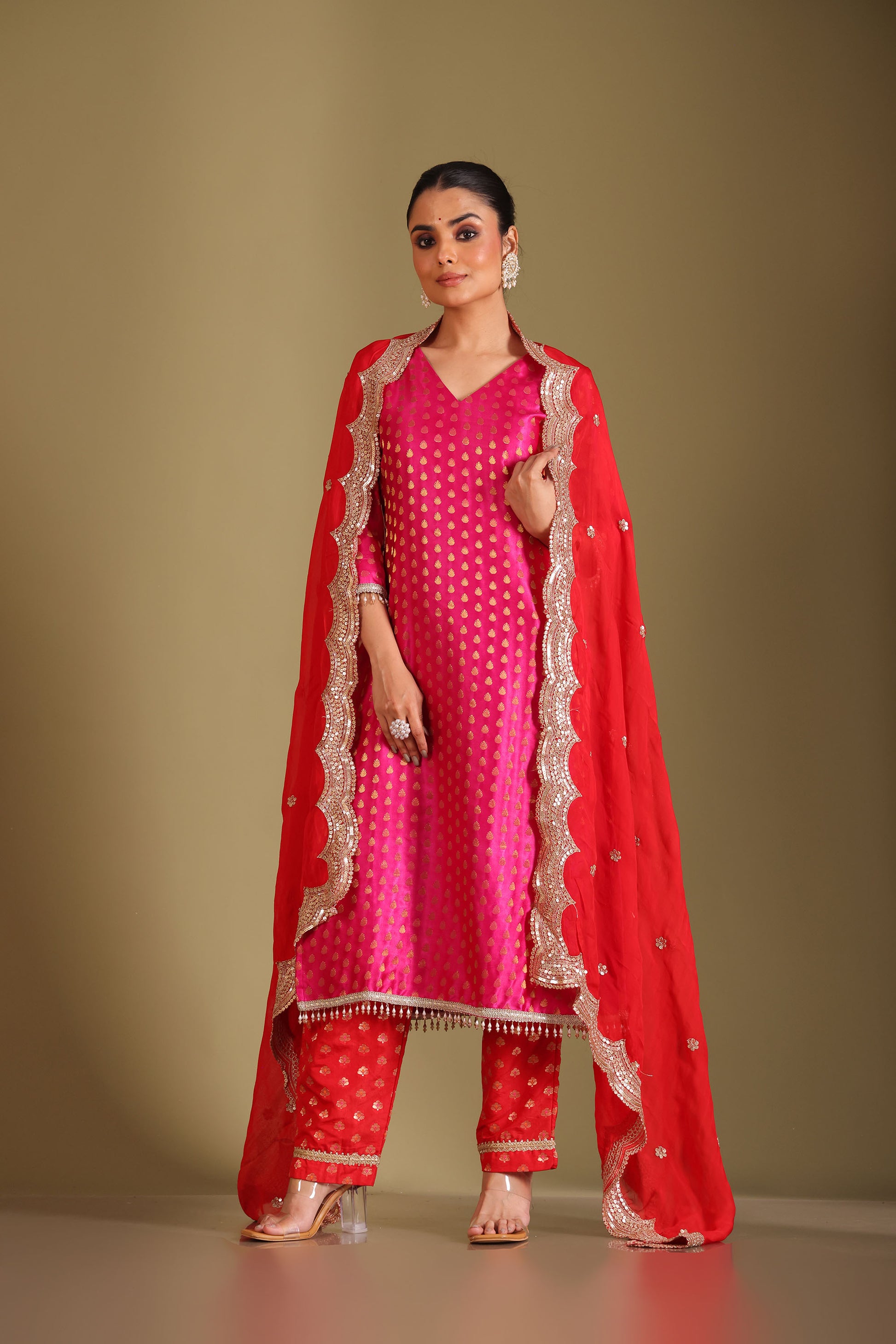 This three piece set includes Kurta, Pant and Dupatta The Pink silk kurta and pants are adorned with golden motifs, exuding a regal charm. The kurta features a V neckline and intricate pearl sequins and pearl detailing at the kurta hem and sleeve cuffs. Paired with a red organza dupatta highlighted with delicate hand-embellishments and border detailing, this outfit is perfect for festive gatherings or elegant evening occasions.
