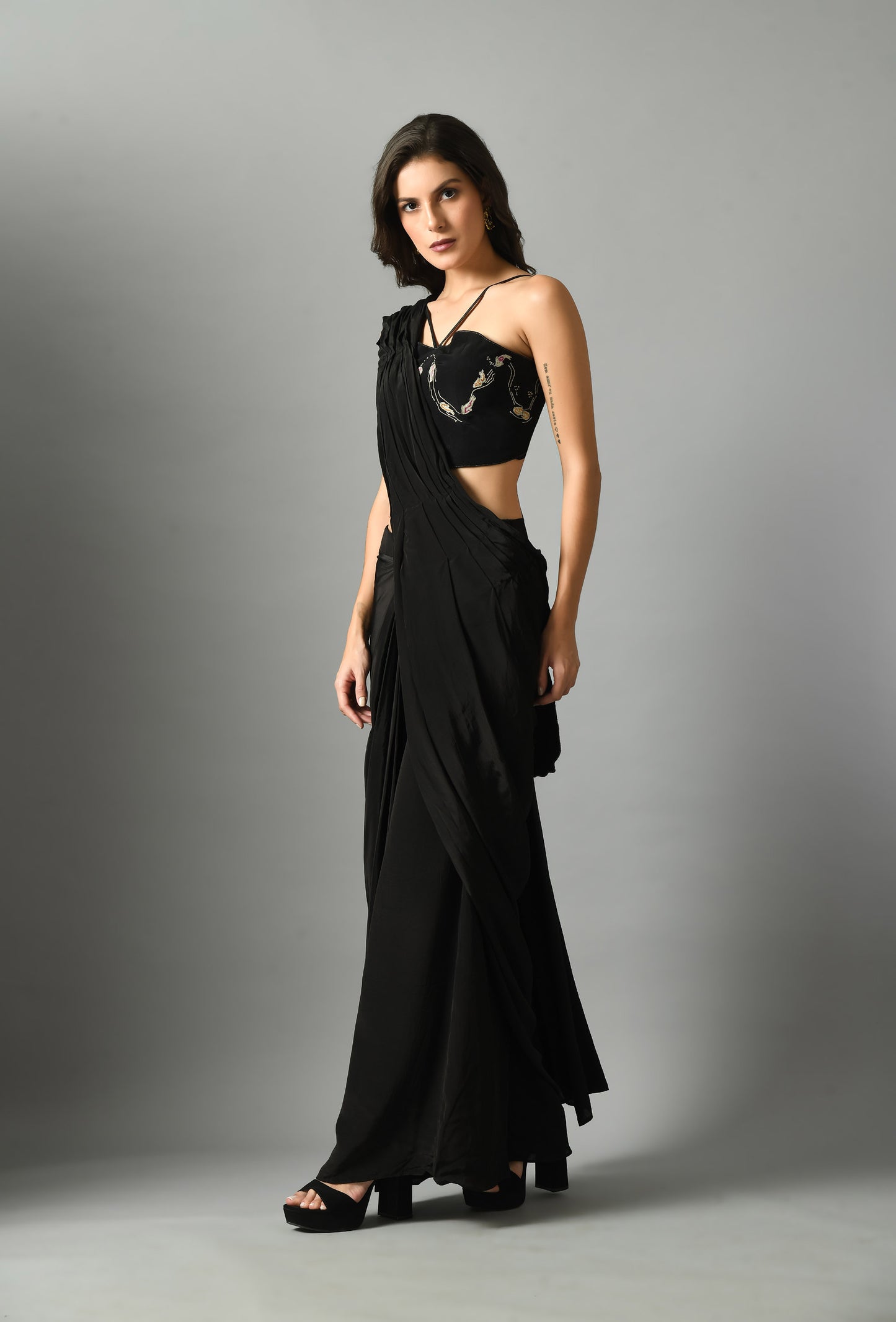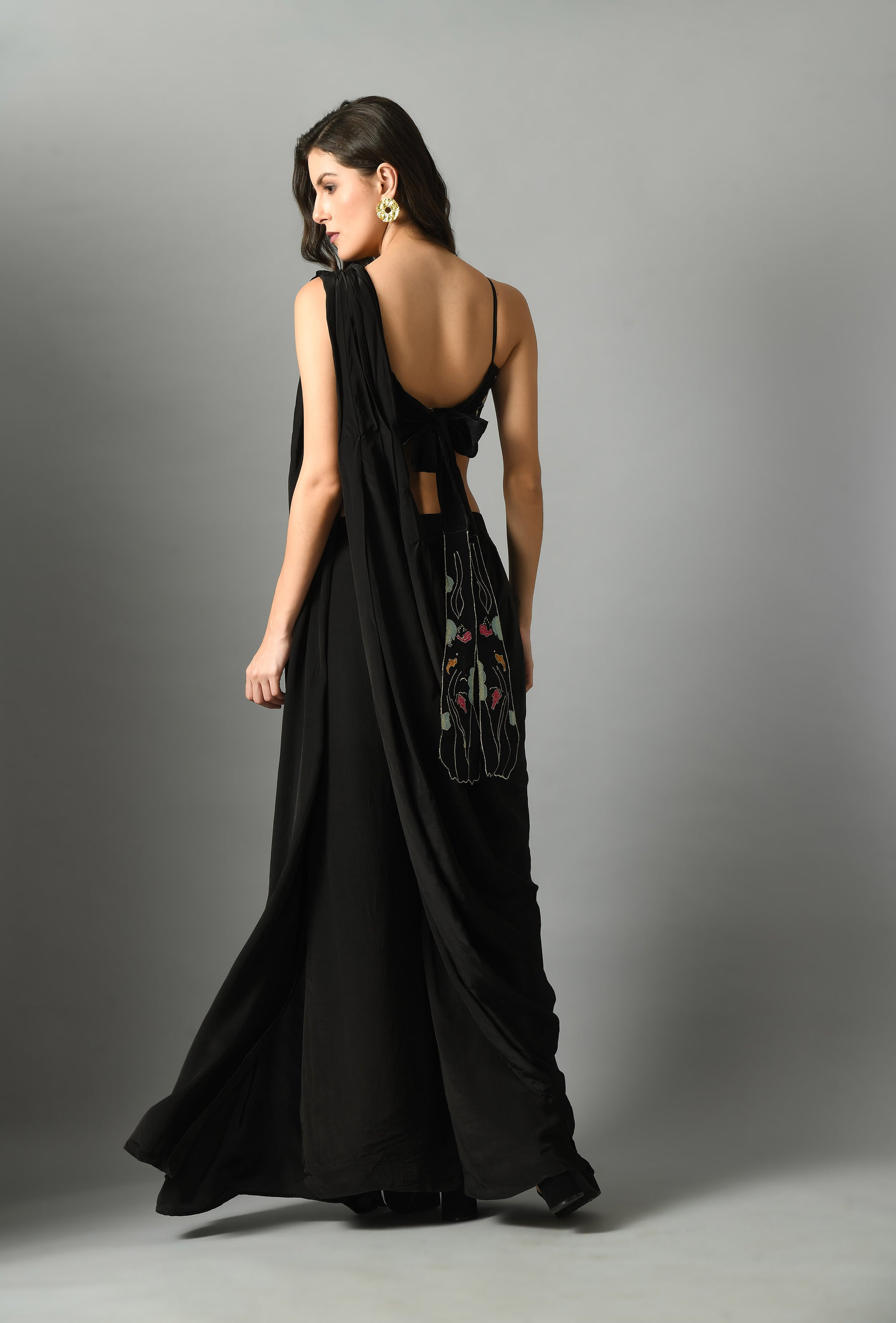 The Nur Bustier with Moonshine pre draped saree is a luxurious statement piece, crafted with fine crepe silk and our pre-draped saree in black and it is elegant and fuss-free and detailed embroidery on bustier. The black color adds a stylish twist to any look and the silk provides a lightweight feel with long-lasting comfort.