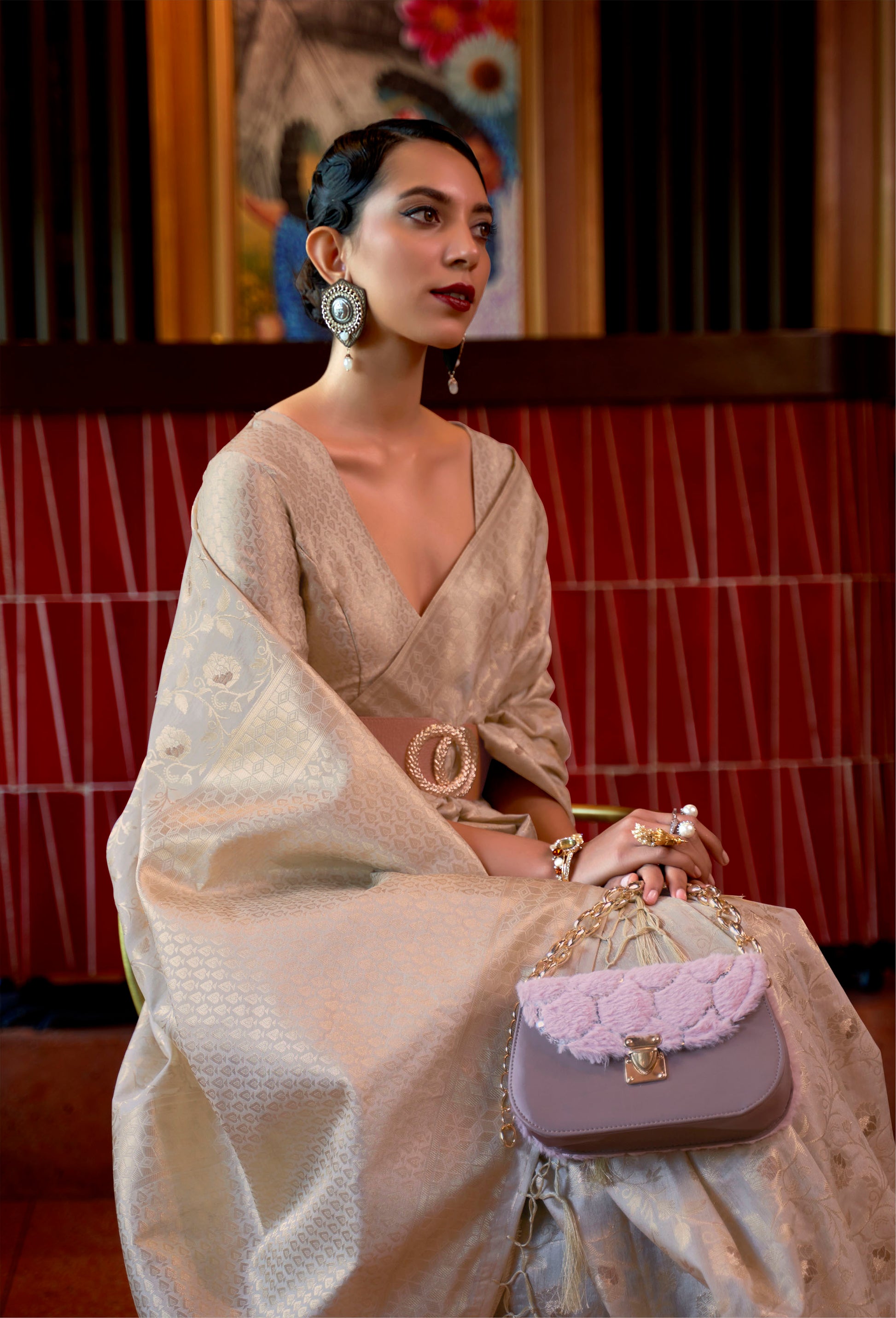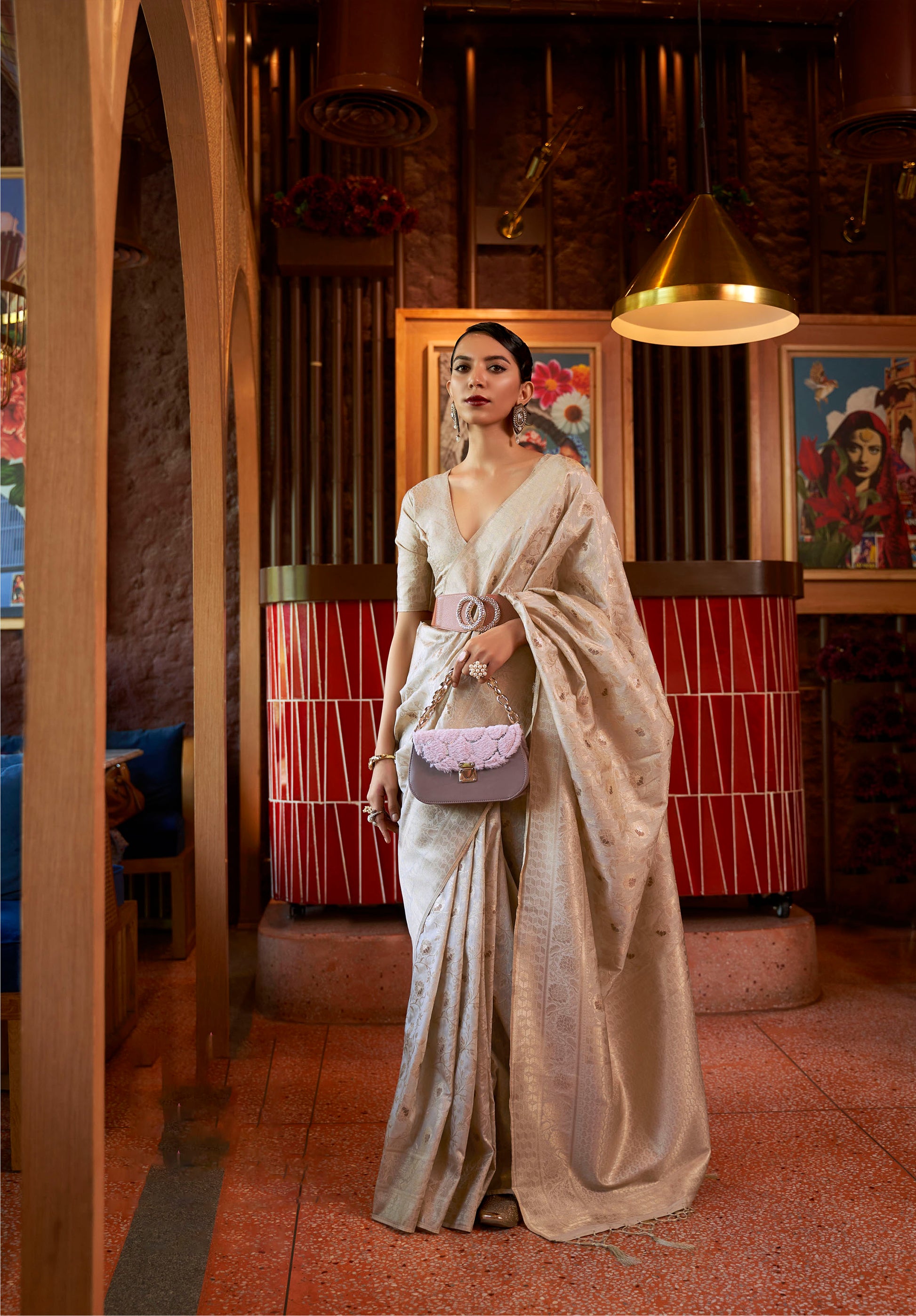 Looking for something a little out of the ordinary? We've got just the thing! This Off-White Banarasi Partywear Woven Silk Saree is perfect for those who want to make a statement. A wedding guest would look gorgeous in this outfit. It is suitable for any occasion, such as wedding receptions, engagement parties, and Sangeets. So don't wait any longer..