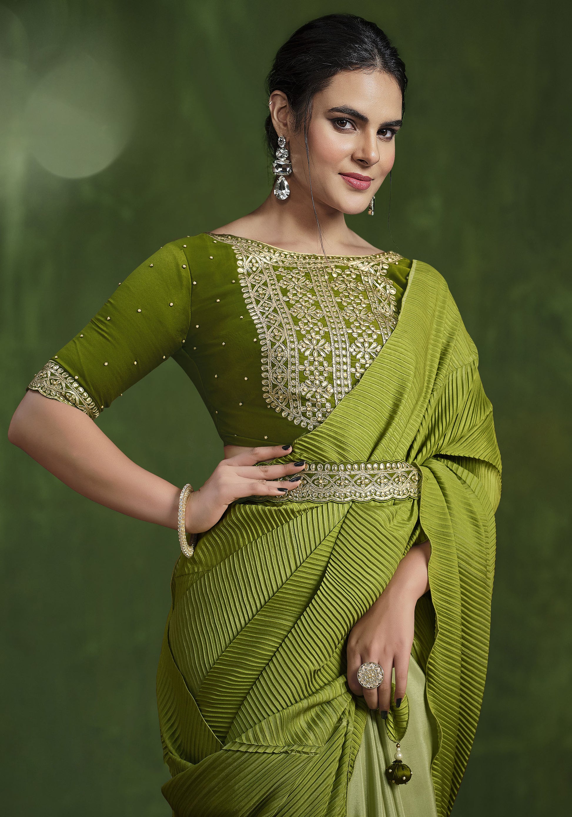Olive Green Crepe Silk Georgette Zari & Stone Work Saree