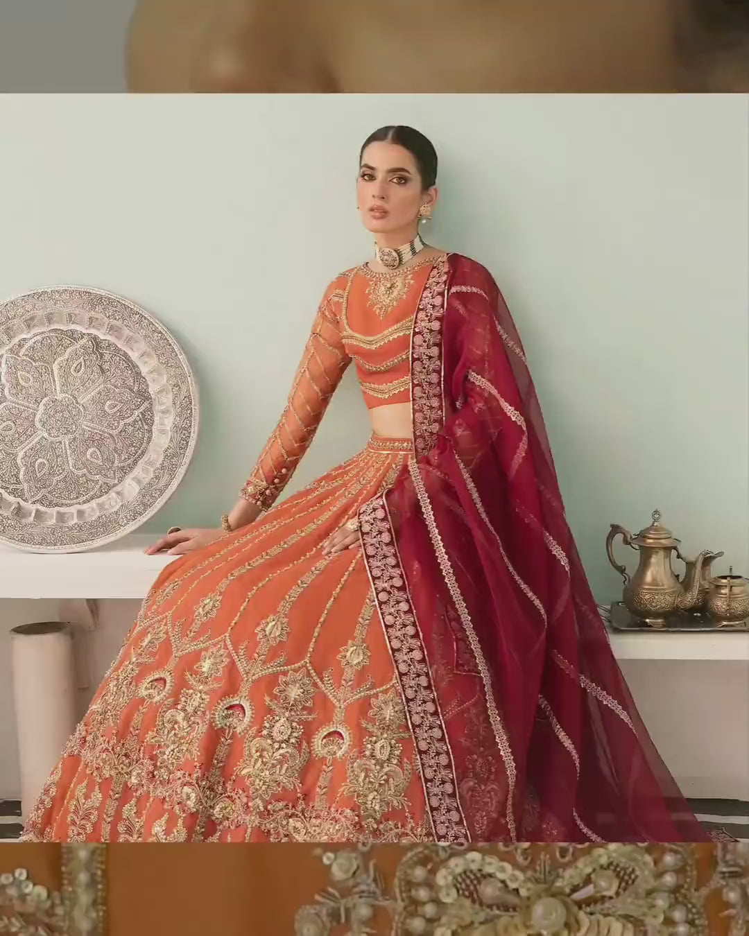 Orange Color Organza Embroidered Hand Embellished Lehenga