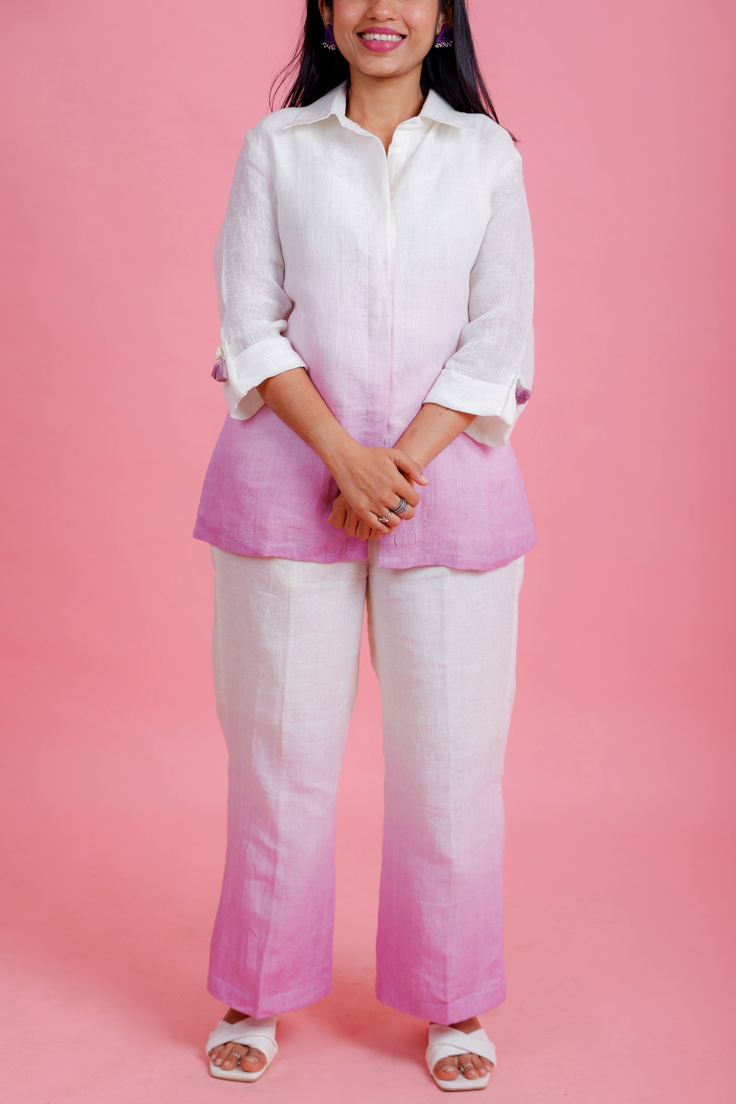 "This co-ords consists of a shirt and pant. The shirt is ombre from off-white to lilac with tassel details.. The shirt has 3/4th sleeves. The white pant is mid-rise, has partially elasticated waistband and flared hem. Material & Care : Top Fabric - Pure Linen Bottom Fabric - Pure Line Care - Hand Wash Note - Wash compulsorily with Colour fix only"