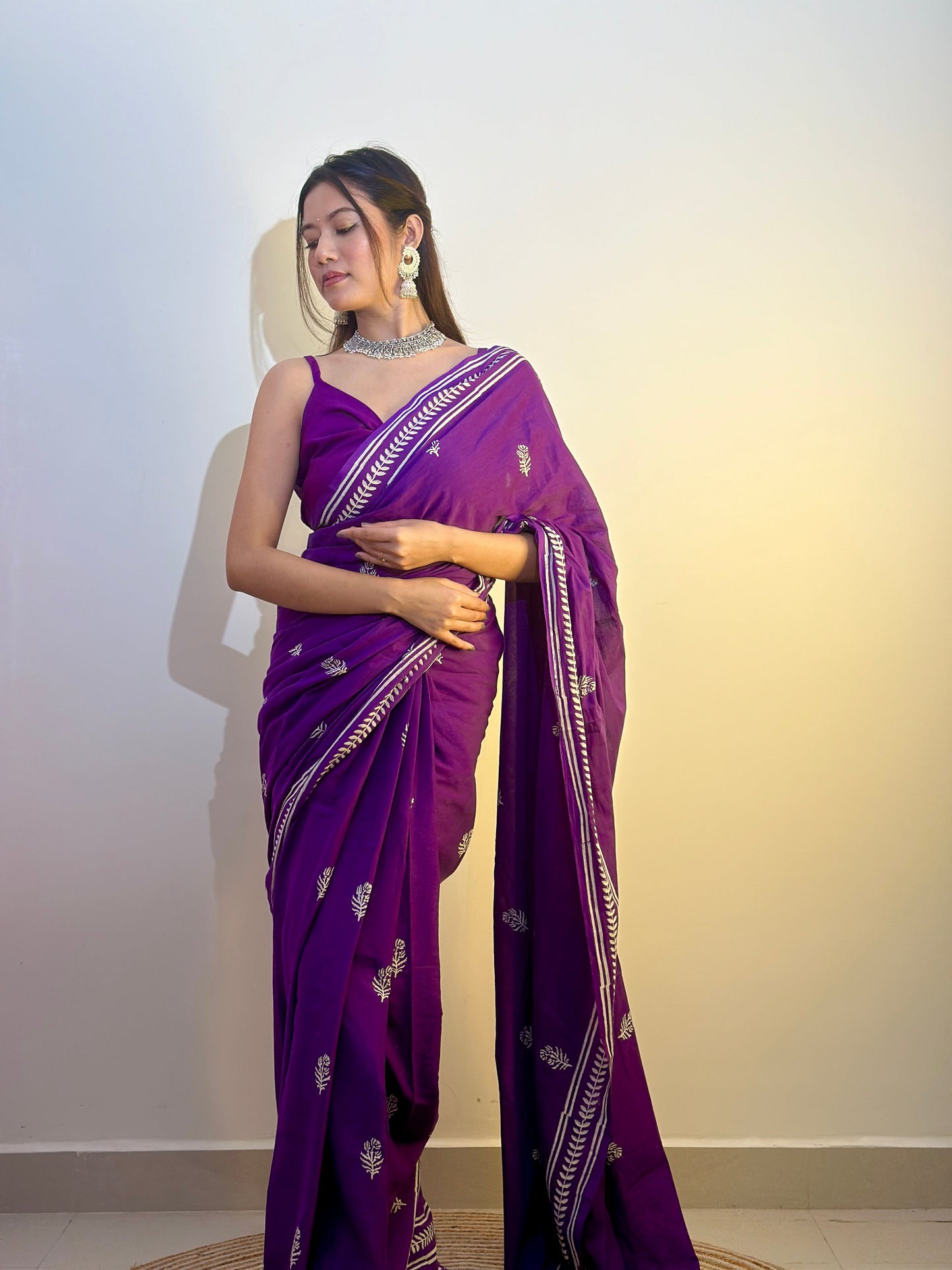 Step into the world of elegance and charm with our exquisite purple handblock saree, crafted to perfection. Its intricate handblock designs exude sophistication, making it the perfect attire for cocktail parties. The rich hue of purple adds a touch of regality, while the soft drape of the saree enhances your wardrobe aesthetics effortlessly. Whether you're sipping champagne or twirling on the dance floor, this saree will ensure you stand out with grace and style. Elevate your ensemble and leave a lasting impression with this timeless piece.