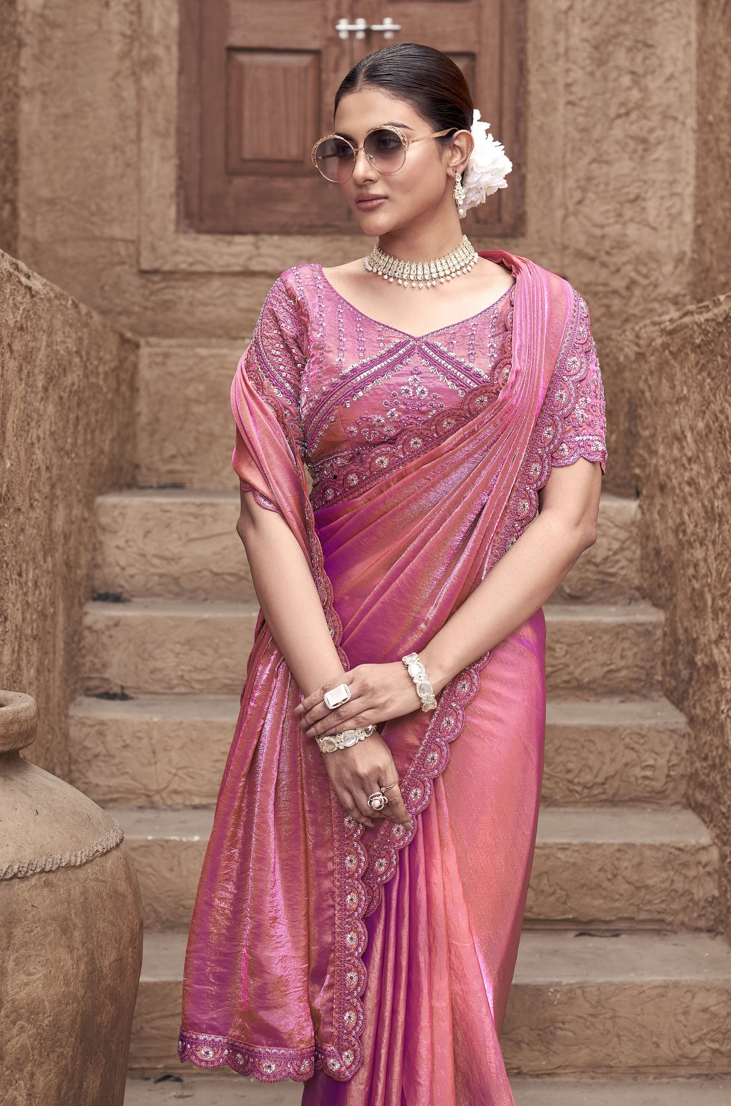 Are you seeking something exclusive? We've got what you require! This Peach Satin Silk Hand Embroidery Party Wear Saree with its Hand work and peach color is the perfect option for those seeking to make an impact. You will certainly be the center of attention in this Saree if you wear it to a wedding reception, an engagement party, or a sangeet. Pictured here is a bridesmaid wearing the Peach Satin Silk Hand Embroidery Party Wear Saree which you can purchase today!