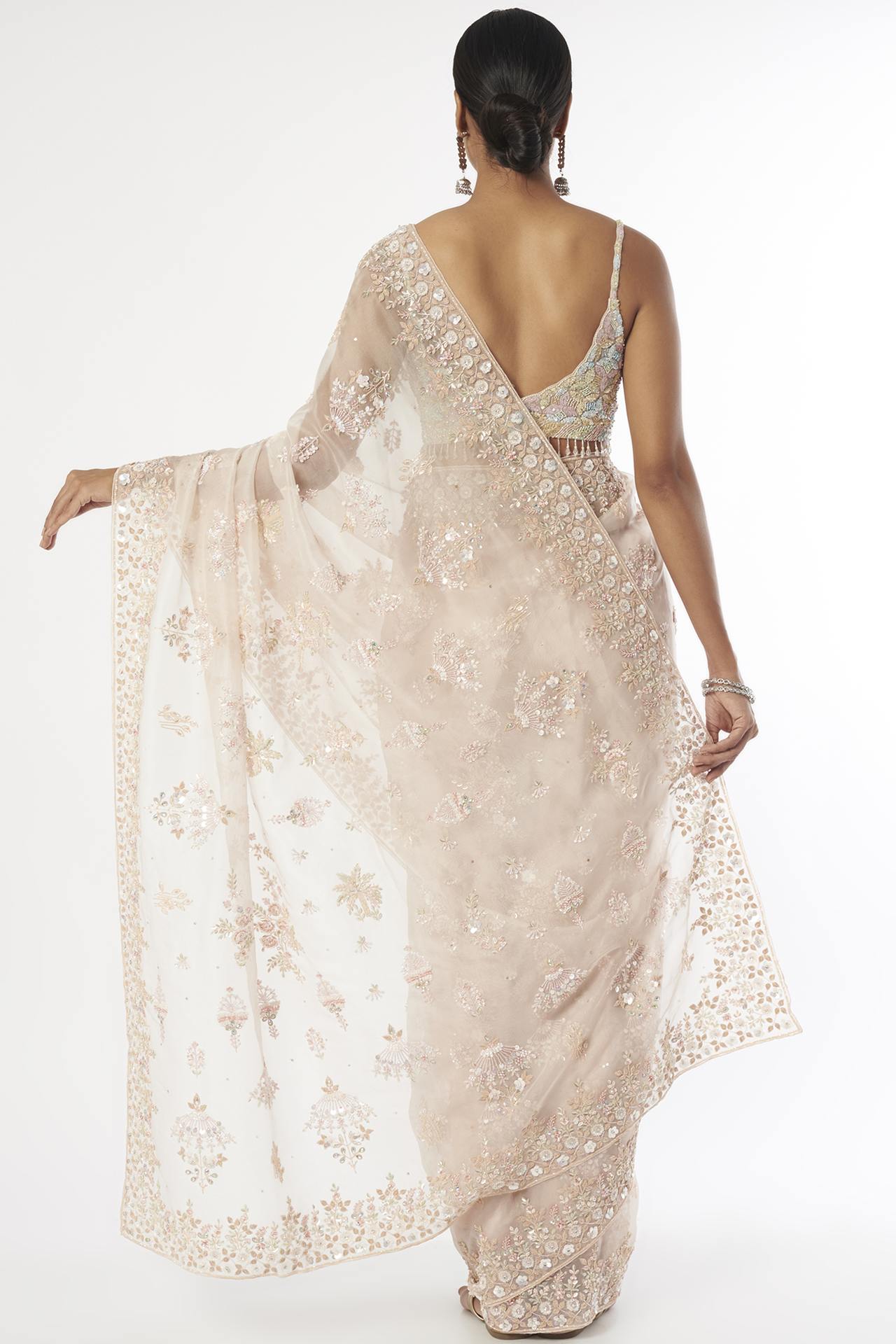 Featuring A Peach Saree In Organza Base With Sequins And Cutdana Hand Embellishments. It Is Paired With A Matching Blouse Fabric Having Floral Jaal Work.