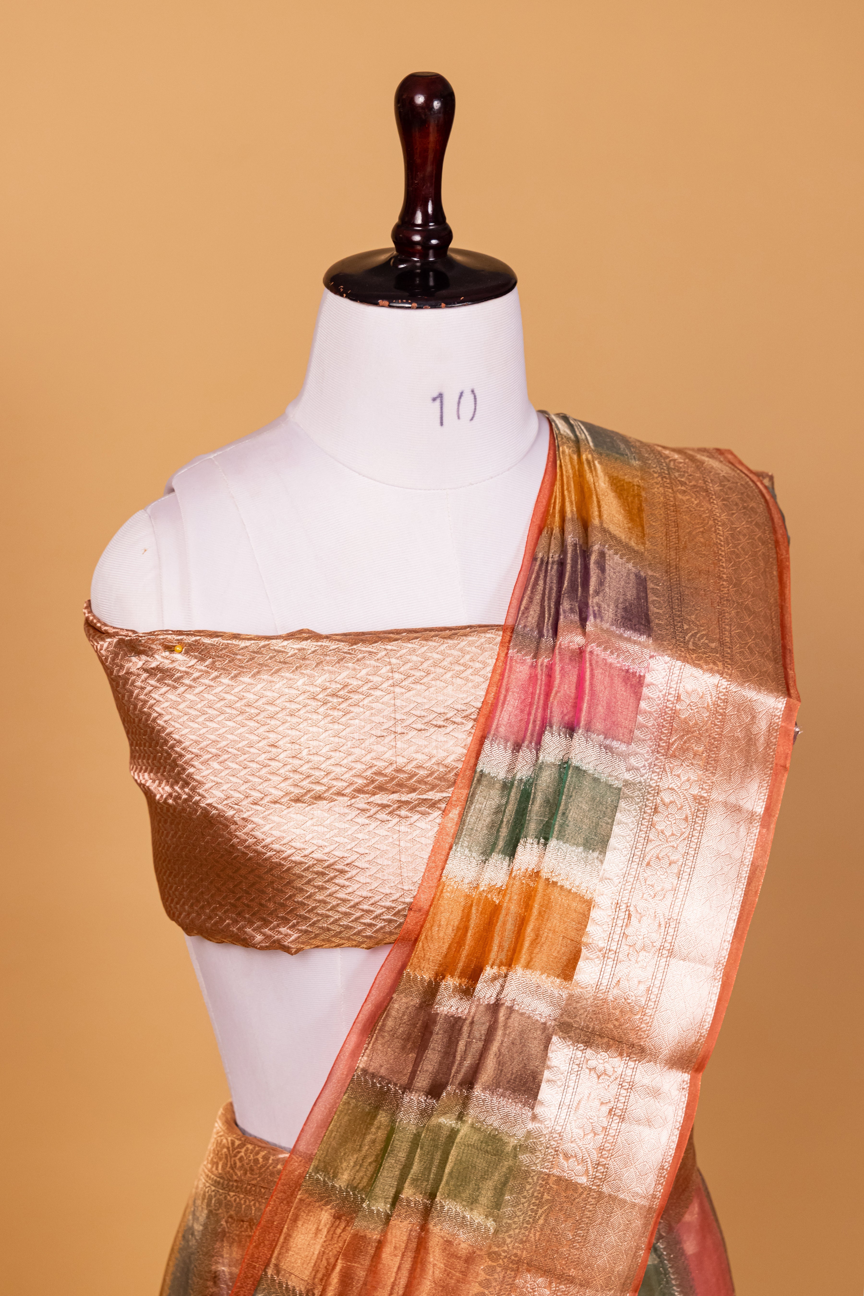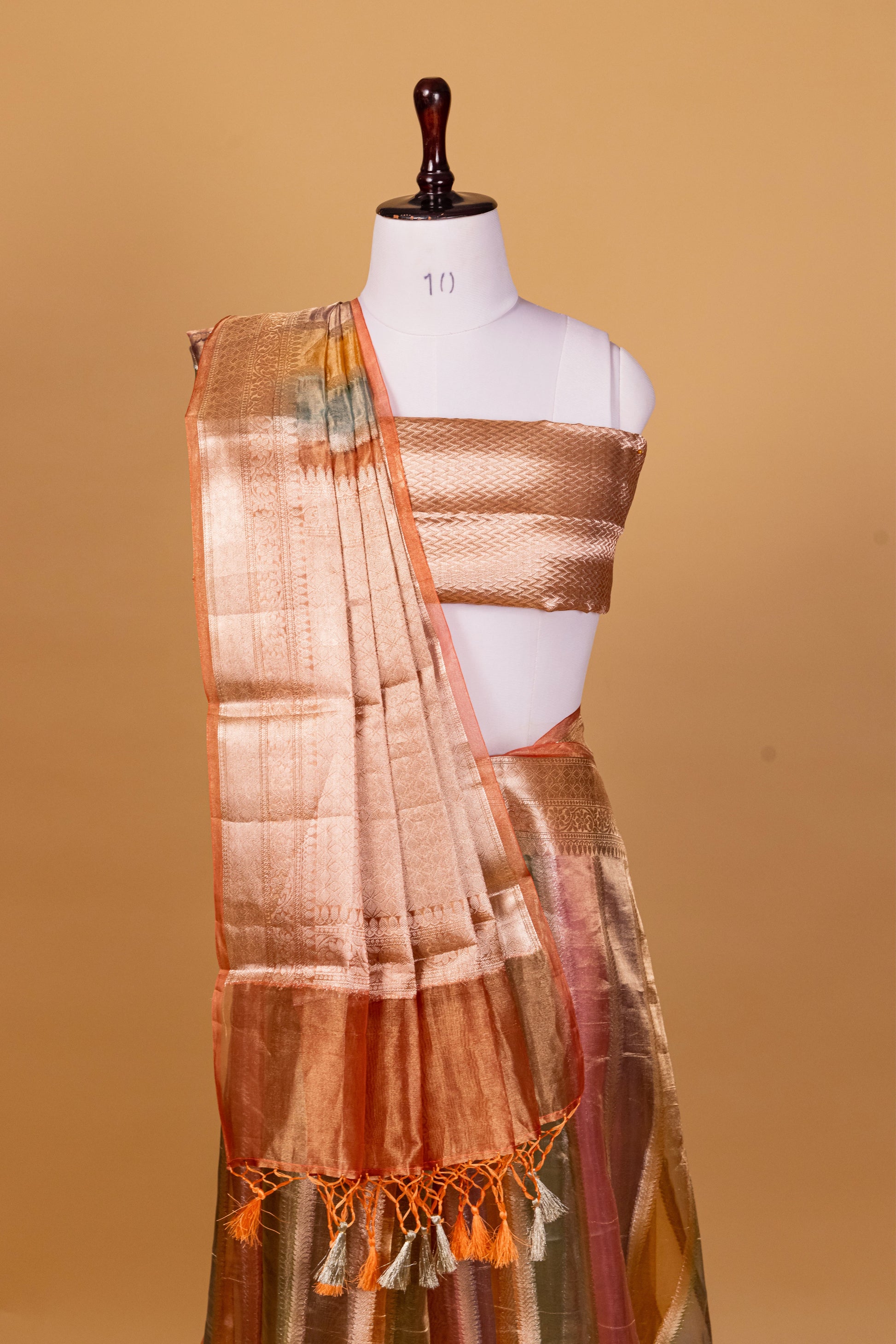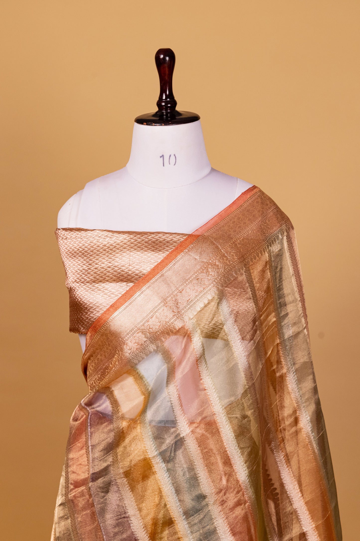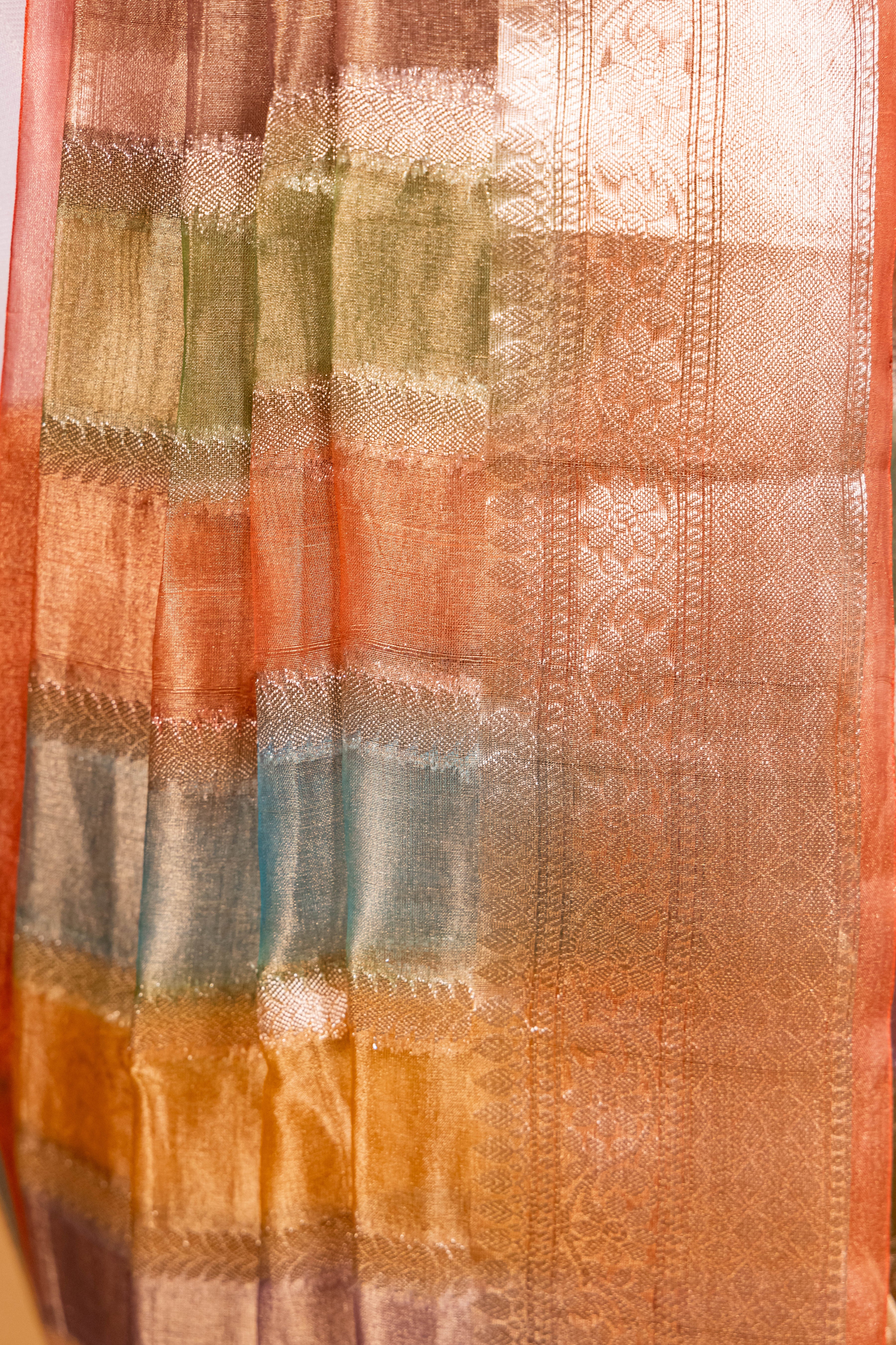 - Description: Multi-color Rangkat Tissue Sari with Banarasi Border and Aachal