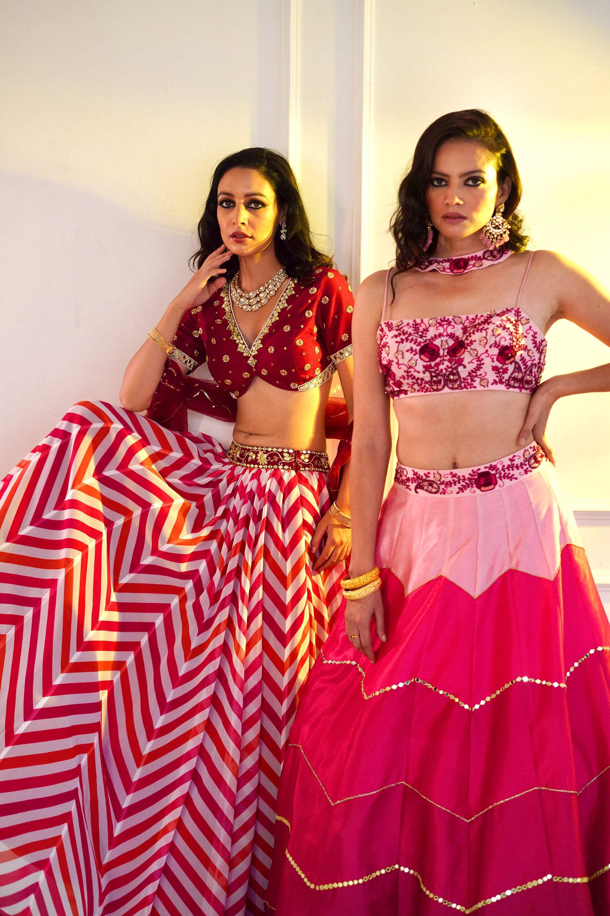 Chiffon Bustier paired with Ombre Silk Lehenga and Our Signature Choker Dupatta